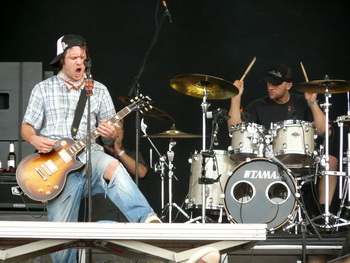 ...um sich gleich anschließend und unerwartet die nächste Watschn abzuholen. Schon mit dem von Manowar ausgeborgten Intro "Kings of Metal" deutete sich an, dass die Emil Bulls bei Bedarf durchaus in der Lage sind, den Begriff "Crossover" stark ins Metallische zu erweitern. Sichtlich gut gelaunt und mit der Bierpulle in der Hand enterten die Mannen aus München die Bühne, um dem noch immer leicht träge wirkendem Publikum Dampf unterm Hintern zu machen. Die Bewegungsfreunde der Jungs wirkte höchst ansteckend, und der trockene, groovige Sound, den die Rythmussektion produzierte, tat sein Übriges, um die Menge in Bewegung und die Matten in Rotation zu versetzen. Zwar blieb Bassist James die von Sänger Christ angedrohte Last erspart, ein Solo à la Cliff Burton abzuliefern – angesichts der bisher gezeigten Leistung wäre er an dieser Aufgabe aber gewiss nicht gescheitert. Von den punkigen Elementen eines "Worlds Apart" aus dem aktuellen Album "The Black Path" bis zum fulminanten Dreigitarrengewitter bei "Smells Like Rock 'n' Roll" präsentierte man ein vielsaitiges Menü, das in Form des Megadeth-Klassikers "Symphony of Destruction" kurz vor Schluss noch mit einem ganz besonderen Schmankerl veredelt wurde. Nicht zuletzt Dank dieser gelungenen Interpretation darf der Auftritt der Bulls mit Recht als einer der frühen Höhepunkte des Festivals bezeichnet werden.