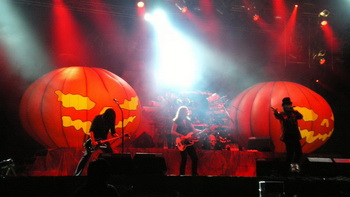 Den Kürbisköpfe von Helloween fiel zu später Stunde die Aufgabe zu, als eine der wenigen Powermetalbands im diesjährigen Billing die Freunde männlicher Sopranstimmen zufrieden zu stellen. Bereits vor Beginn der Show fiel das riesige, im Zentrum der Bühne platzierte Drumset auf, und im Licht der Scheinwerfer zeigte sich, dass man auch bei der Bühnendeko nicht gespart hatte – das Cover der aktuellen Scheibe "Gambling With the Devil" bedeckte einen Großteil der Rückwand. 80 Minuten Zeit für den Headliner des Abends wollten gefüllt werden, und so eröffnete man mit dem 15-minütigen Klassiker "Helloween" und nahm sich auch ansonsten ausgiebig Zeit, z.B. für ein ausgedehntes Drumsolo oder die Vorstellung der einzelnen Bandmitglieder. Dem zahlreichen, aber nun doch schon etwas müde wirkenden Publikum wurde auch Einiges fürs Auge geboten: So machten sich zur Mitte der Performance zwei gigantische Aufblaskürbisse auf der Bühne breit, und Sänger Andi schlüpfte zu "Perfect Gentleman" in einen glitzerroten Frack, der jeden Koi neidisch gemacht hätte. Nach bald 25 Jahren wechselvoller Bandgeschichte dürfen sich die Jungs immer noch - und, wie diese Show zeigte, völlig berechtigt - zur Speerspitze des (nicht nur deutschen) Powermetals zählen.