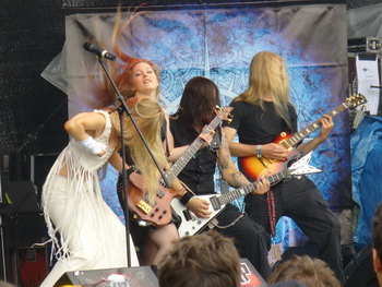 Showdown für Midnattsol – zur Mittagszeit schlug für die junge Band um Sängerin Carmen Elise Espanaes die Stunde der Wahrheit. Auf dem Breeze sollte das aktuelle Album "Nordlys" heute seine Livepremiere erleben, zu welcher sich eine trotz Nieselregens durchaus beachtliche Menge eingefunden hatte. Die kleine Schwester von Leaves’ Eyes-Sängerin Liv Kristine konnte sowohl optisch (im weißen Galakleid) als auch stimmlich (durch absolute Tonsicherheit) überzeugen – schön, dass die Tontechnik mitspielte und nicht (wie leider bei manch anderer Band) die Vocals im Gesamtmix unter den Tisch fallen ließ. Auch der Rest der Truppe schlug sich wacker, und so darf dieser Auftritt durchaus als Erfolg in der Bandhistorie verbucht werden. Aus einem ursprünglichen Fauxpas heraus gelang es Drummer Christopher schließlich am Ende der Show noch, einen dicken Sympathiebonus für sich und seine Mitstreiter einzuheimsen: Nachdem das erste Paar Sticks zu hoch geworfen worden und an den Querstreben der Bühne abgeprallt war, pfefferte er kurz entschlossen seinen vermutlich kompletten Vorrat an Schlaghölzern in die Menge – das verstehe ich unter "value for money"!