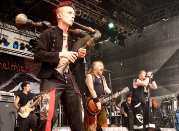 "Wir sind fett, wir sind hässlich, wir sind asozial, wir sind Schelmish" – so kündigt sich die vielköpfige Mittelalter-Rock-Formation für gewöhnlich an. Und man möchte hinzufügen: "Wir sind spaßig!" Denn die Band, die ein mir nahe stehender Zuschauer charmant als "Kelly-Family der Metal-Szene" vorstellte, war in Rockbesetzung angereist, und brannte vor grauem Himmel ein wahres Feuerwerk ab. "Wir haben wenig Zeit, daher werden wir wenig reden", kündigte Zweitsänger und Gitarrist Dextro an – nur, um dann umso weitschweifiger die Geschichte eines schwulen Renaissance-Königs aus Italien zu erzählen. Eben jener König habe einen Haus- und Hoftänzer namens "Daphne" gehalten, den "wir euch mitgebracht haben. Seid gewarnt: Es wird nicht sehr anmutig..." Zu Dudelsäcken und Schalmeien kommt von hinten Pfeifensackspieler Luzi auf die Bühne eingekleidet mit ulkiger Renaissance-Mode. Unter dem Gejohle der Menge und mit vielen hölzernen Bewegungen, die wohl lasziv wirken sollen, wird er ein ulkiges Kleidungsstück nach dem anderen los, tanzt an der Stange und spielt das nächste Lied nur im Häschen-Tanga. "Wir haben schon versucht, den kleinen Scheißer zu vermieten, hat nur bis jetzt keiner angebissen", verkündet Dextro. Wir wissen, warum...