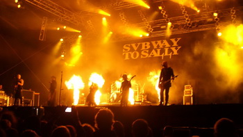 Um 22:45 Uhr traten dann schließlich Subway to Sally hinaus in die Nacht und vor eine berstend volle Main Stage. Fronter und Charmebolzen Eric Fish zeigte sich froh, wieder im Schländle zu sein, man müsse sich im Ausland ja auf englische Ansagen verlegen. Zu "standesüblicher" Pyroshow mit Feuerspuck-Einlagen führte er durch ein Programm, das vor allem von den letzten beiden Alben dominiert (um nicht zu sagen: erdrückt) wurde: Schließlich spielte die Band sich praktisch nur durch "Nord Nord-Ost" und die neuste Scheibe, "Bastard", von der nur wenig Titel ausgelassen wurden. Beim Publikum kam das offenbar super an, jedes Lied wurde lauthals mitgesungen, und der "Schrei", den Subway zu einem festen Teil ihres Festivalrepertoires gemacht haben, war so laut, wie ich ihn selten gehört habe.