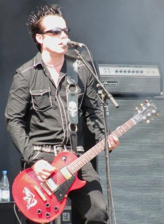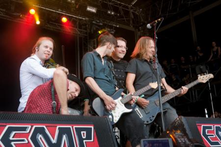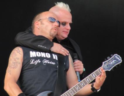 Akustisch gar nicht so weit von ihren Vorgängern auf der Nebenbühne entfernt, lagen zwischen jenen und Mono Inc. Welten: wären da nicht die übertrieben schwarzumrandeten Augen und der blonde Irokese gewesen, hätte Frontmann Martin auch als Anzug- oder Sargverkäufer durchgehen können. Angesichts seiner charismatischen Art ("Und keiner sagt mir, dass meine Hose offen ist!...Ausziehen?! Das meint ihr nicht ernst!") wäre er dabei sicher auch sehr erfolgreich gewesen, man wäre aber auch nicht in den Genuss dieses wirklich gelungenen Auftrittes gekommen. ZU stellenweise fast poppigem Gothmetal zwischen Unheilig und Rammstein feierte da Publikum so gut es eben bei sengender Hitze geht ab, selbst als die Akkustikgittare zum Cover des Iggy Pop-Klassikers "The Passenger" ausgepackt wurde. Nur mit dem Mitsingen haperte es ein wenig, Kommentar von der Bühne: "Ihr seid zwar nicht das größte Publikum, für das ich je gespielt habe, aber das macht nichts - denn ihr seid das mit Abstand leiseste!" Bei einem derartigen Unterhaltungswert verwundert es nicht weiter, das die Show auch vergleichsweise schnell vorrüber ging. :::Olli