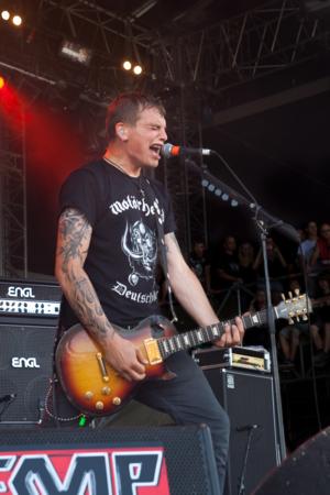 Die aus Schweden stammenden Psychopunch schickten sich am frühen Nachmittag an, ihren Punk'n'Roll unters Volk zu bringen. Leider stand es sowohl um die Motivation der Band wie auch des etwas spärlichen Publikums augenscheinlich nicht zum Besten - fairerweise muss man beiden Seiten zugestehen, dass Bewegung in der prallen Sonne keine allzu spaßige Angelegenheit ist. Letztendlich spielte die Truppe ihre Setlist zwar souverän, aber eben etwas glanzlos runter. Für zwischenzeitliche Erheiterung sorgte zumindest das ABBA-Cover "S.O.S". :::Olli