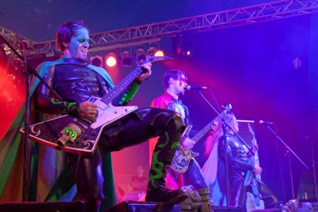 Mit den Grailknights war eine weitere Spaß-Formation ins Party-Zelt gekommen, und wie Feuerschwanz eine gute Stunde vor ihnen hatten auch die vier Herren in den Superheldenkostümen ihr Publikum voll im Griff. Da störte es auch nicht sonderlich, dass der Sound etwas matschig daherkam und hier und da eine fiepende Rückkopplung dazwischen war: Mit fixem Gefrickel, flotten Sprüchen und dem unvermeidlichen Bier-Pferd "Zapf Beauty" machte man sich einmal mehr auf die Suche nach dem heiligen Gral. Reichlich Unterstützung bekamen die heroischen Vier dabei von ihrem getreuen Battlechoir: Trotz der engen Raumverhältnisse brachte das brechend volle Partyzelt eine Lautstärke hin, wie ich sie in all den Jahren noch auf keinem Festival erlebt habe - das hatte schon Stadion-Qualität! Kein Wunder also, dass der Gig für die Grailknights schnell zum Selbstläufer wurde, hatten sie den Zuschauerraum doch von Anfang an auf ihrer Seite; gemeinsam bezwang man alle Bösewichter, die von Zeit zu Zeit über die Bühne und auch durch den Fotograben turnten, reckte anschließend beglückt den wiedererrungenen Gral in die Höhe und verabschiedete sich dankend von einem feierwütigen Battlechoir, das die Vier kaum von der Bühne lassen wollte. (Die Setlist, falls sie überhaupt jemanden interessiert - bei den Grailknights dürfte die Musik eindeutig hinter der Show zurückstehen: Grailquest Gladiators, When Good Turns Evil, Nameless Grave, Sea Song, Moonlight Masquerade.)