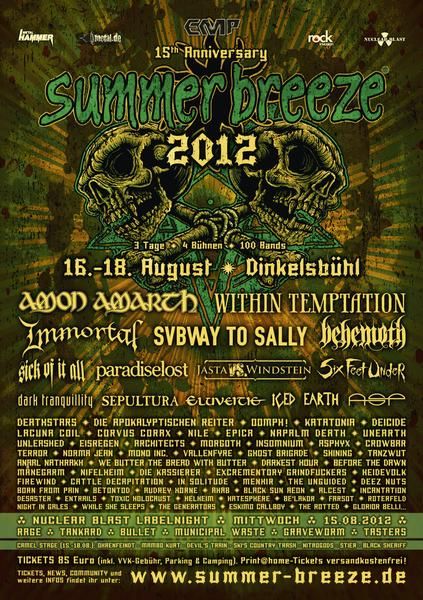 Ganz ehrlich: nach dem letzten Jahr hatte ich so meine Bedenken, was das Summer Breeze angeht: der Sound war mir 2011 teilweise zu dünn, und so wirklich wohlgefühlt habe ich mich unter den Leuten auch nicht: für einen Norddeutschen ist der fränkische Dialekt schon eine Herausforderung. Dazu war mir die Zahl der Leute mit BURZUM und KATEGORIE C T-Shirts eindeutig zu hoch. Aber, jeder hat eine zweite Chance verdient, und siehe da: das Summer Breeze 2012 hat mich positiv überrascht! Der Sound auf den Hauptbühnen war deutlich besser, und auch im Partyzelt hat sich etwas getan. Verpflichtungen zuhause haben mich leider daran gehindert, schon am Mittwoch oder Donnerstag anzureisen. Also gibt’s hier nur die Zusammenfassung von Freitag und Samstag.
