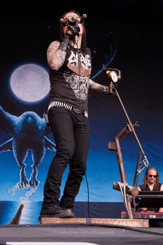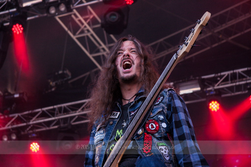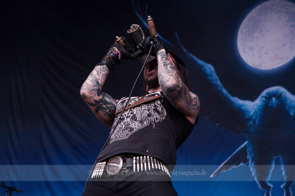 Dieser Tag startet, für mich, mit EINHERJER. Trotz fehlendem Bassisten hatte die Band ordentlich Druck. Für meinen Geschmack sogar etwas zu viel, denn aus den Boxen kam ein einziger Brei. So direkt vor der Bühne fand ich das sehr anstrengend, wobei es aus einiger Entfernung dann ganz anständig klang. Die dreckige Reibeisenstimme des Sängers sticht jedoch zu allen Zeiten sehr hervor. Auch stellt er deutlich zu Schau, dass man nicht unbedingt lange Haare braucht, um entsprechend abzugehen.
