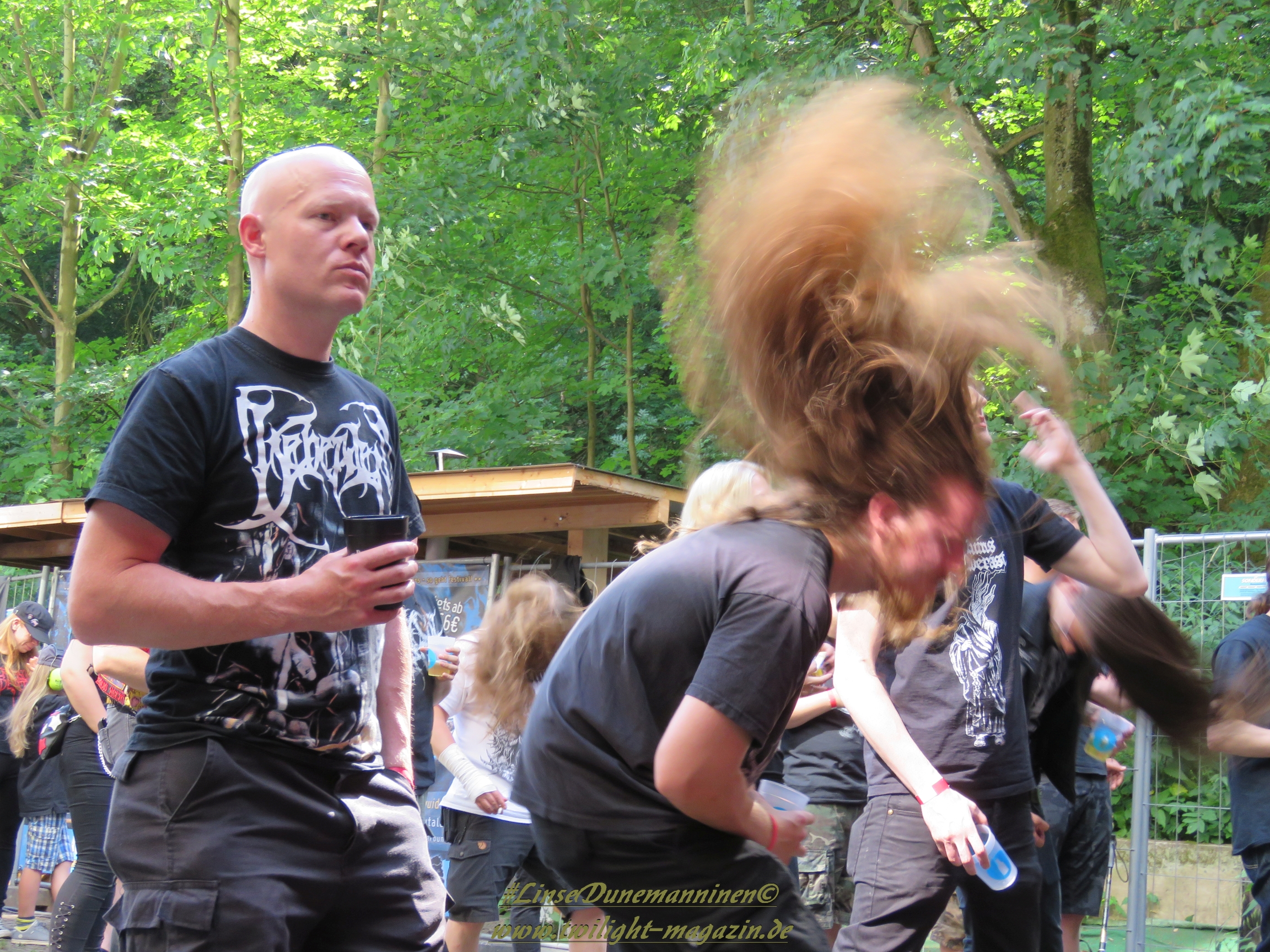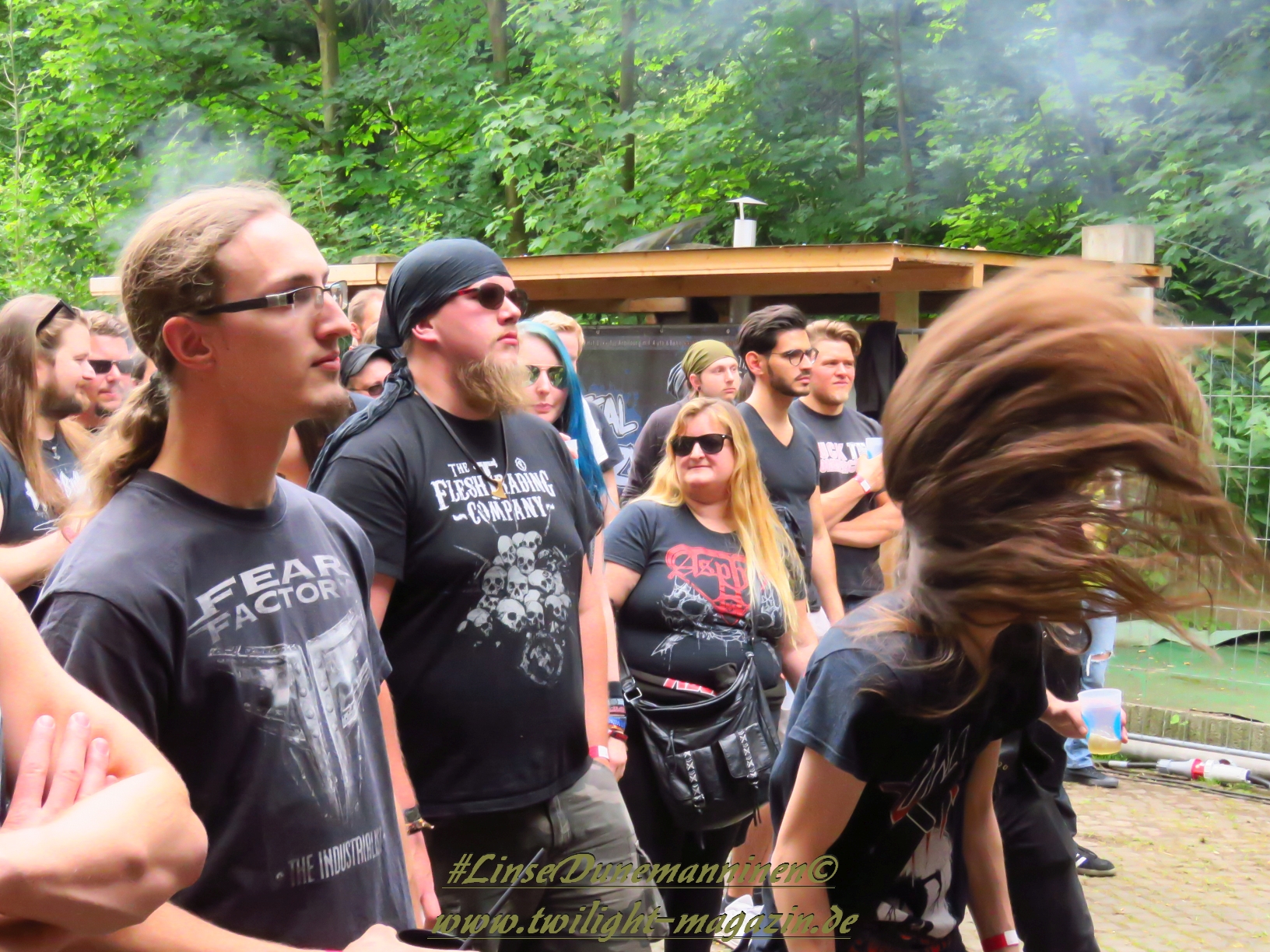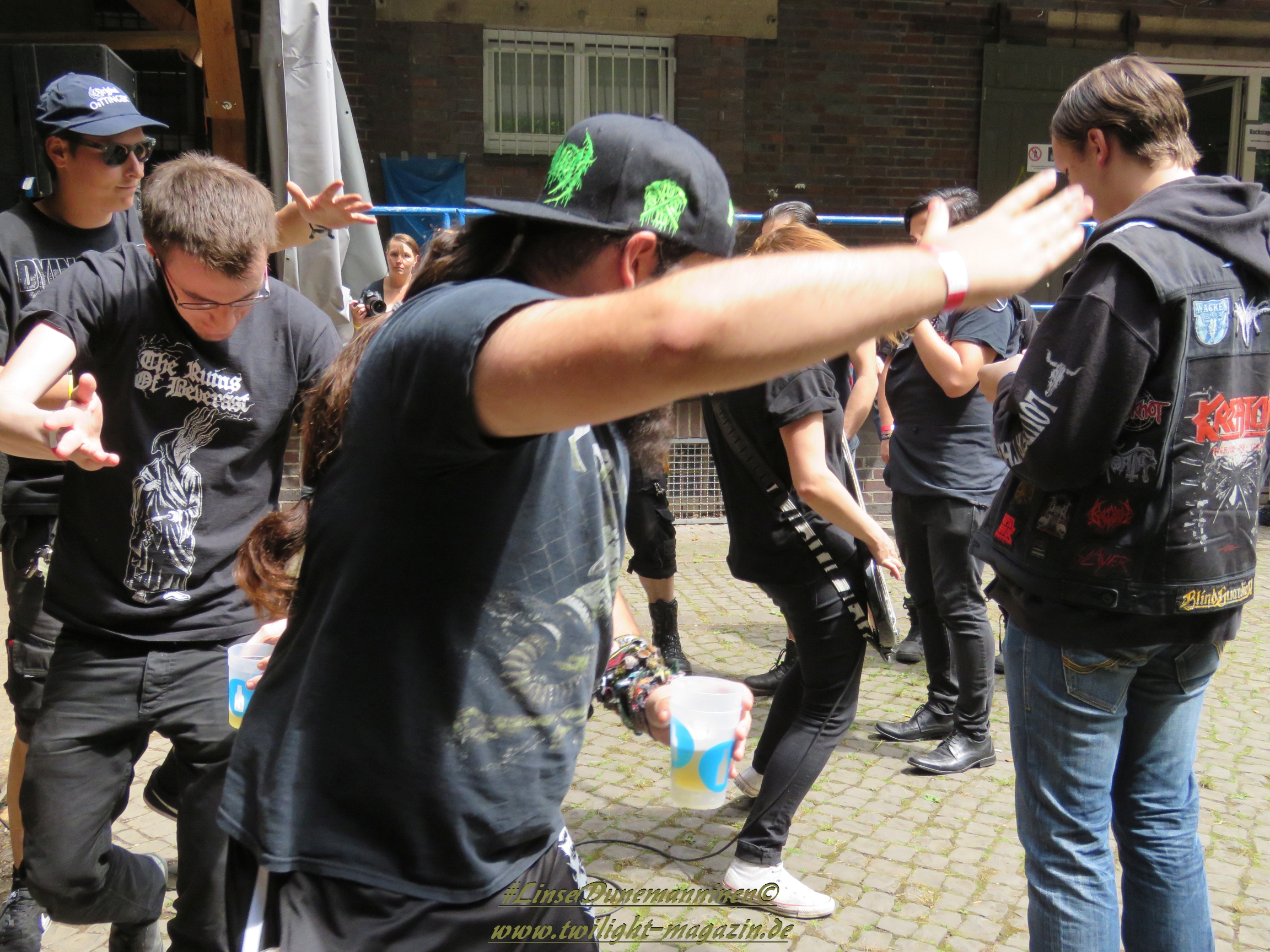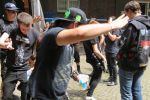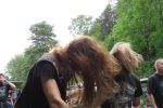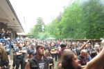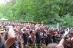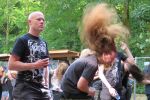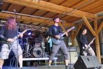 Das Wetter ist, wie in den vergangenen Jahren, wie gemacht für ein Open Air. Nicht zu warm, nicht zu kalt, kein Regen, während die kräftige Juni-Sonne immer mal wieder von Phasen leichter Bewölkung ausgebremst wird. Los geht´s pünktlich um 14 Uhr mit dem Berliner Grind-Quartett JEHACKTET. Wenn auch die Reihen vor der Bühne noch etwas licht sind, so ist es trotzdem beachtlich, dass sich um diese Zeit schon eine erstaunliche Meute auf dem Gelände eingefunden hat. Und die, die da sind, lassen sich von der äußerst agilen Combo gleich zur ersten Grindcore-Polonäse animieren, die Sänger Georg und Frau Bassistin immer wieder nutzen, um sich ebenfalls von der Bühne ins Publikum zu stürzen. Musikalisch für mich zwar eher unspektakulär aber durchaus unterhaltsam. Positiv zu erwähnen ist, dass sich hier jede Band mit einer Spielzeit von mindestens 45 Minuten präsentieren darf und niemand mit "Mini-Slots" abgespeist wird.