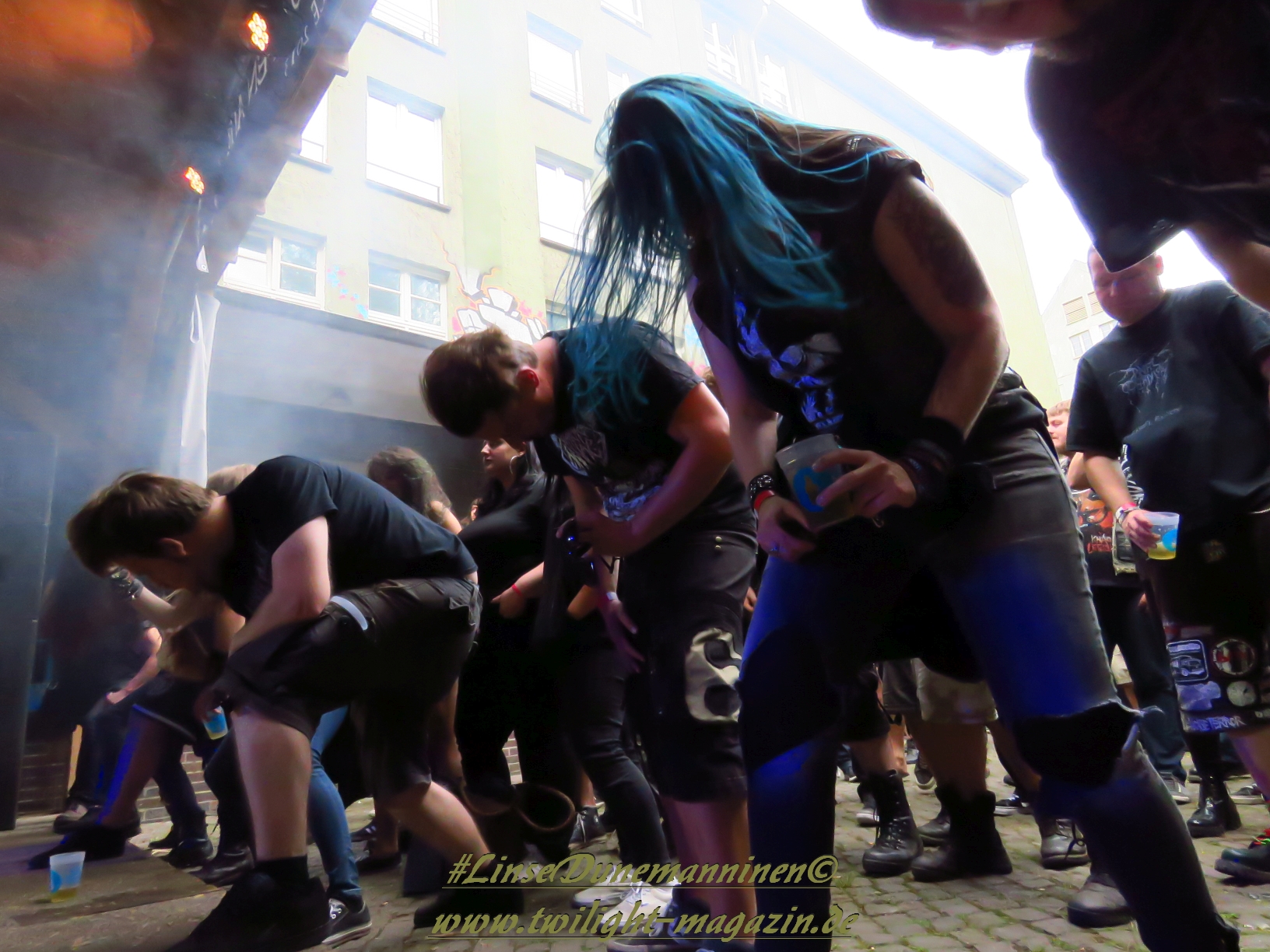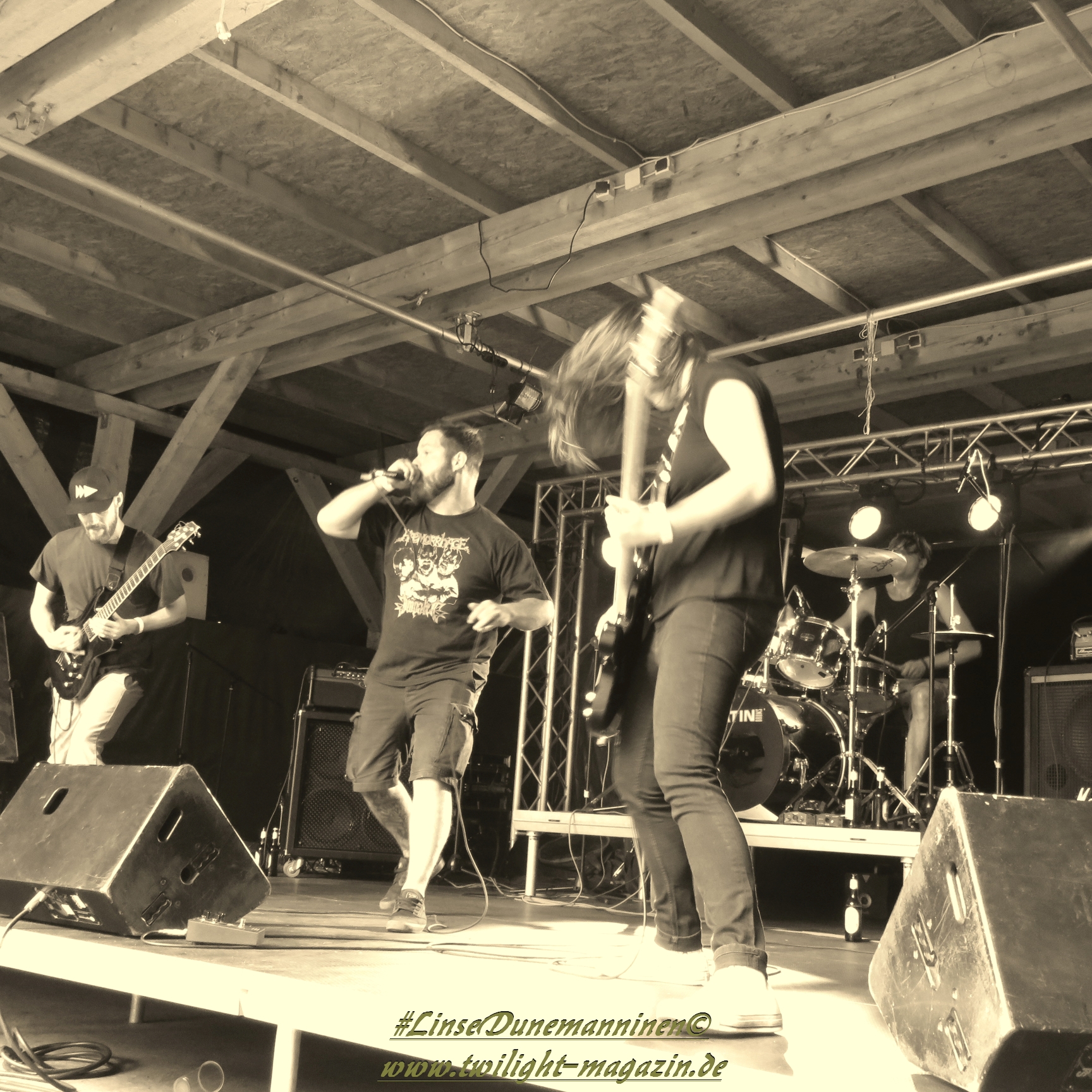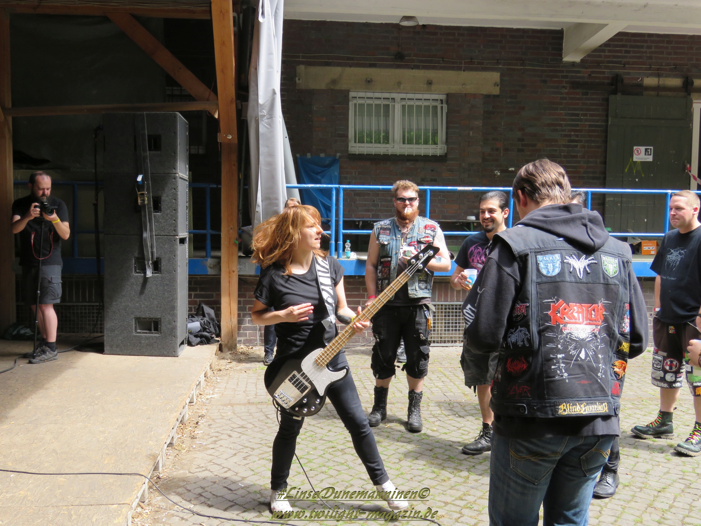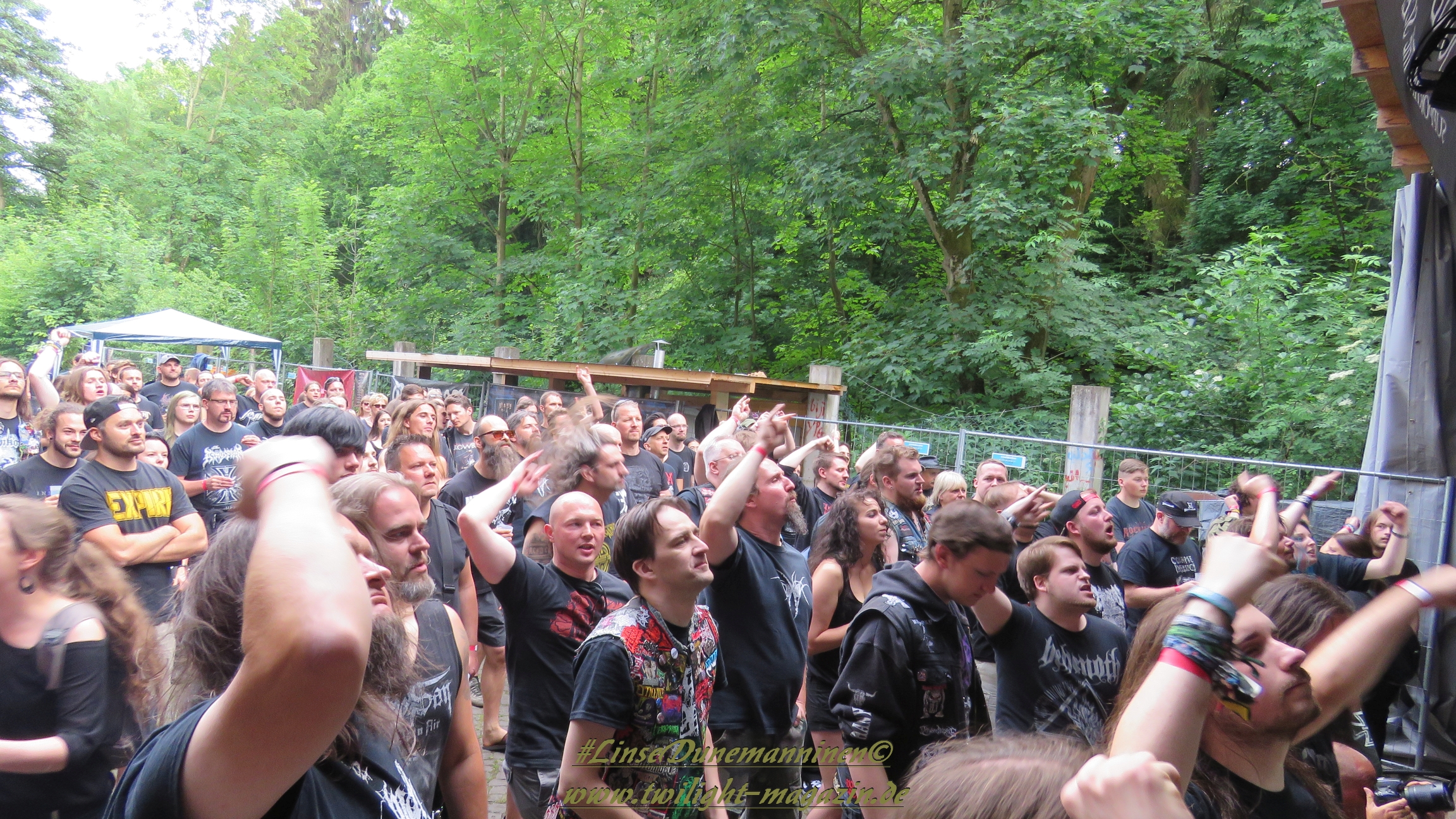 Das Wetter ist, wie in den vergangenen Jahren, wie gemacht für ein Open Air. Nicht zu warm, nicht zu kalt, kein Regen, während die kräftige Juni-Sonne immer mal wieder von Phasen leichter Bewölkung ausgebremst wird. Los geht´s pünktlich um 14 Uhr mit dem Berliner Grind-Quartett JEHACKTET. Wenn auch die Reihen vor der Bühne noch etwas licht sind, so ist es trotzdem beachtlich, dass sich um diese Zeit schon eine erstaunliche Meute auf dem Gelände eingefunden hat. Und die, die da sind, lassen sich von der äußerst agilen Combo gleich zur ersten Grindcore-Polonäse animieren, die Sänger Georg und Frau Bassistin immer wieder nutzen, um sich ebenfalls von der Bühne ins Publikum zu stürzen. Musikalisch für mich zwar eher unspektakulär aber durchaus unterhaltsam. Positiv zu erwähnen ist, dass sich hier jede Band mit einer Spielzeit von mindestens 45 Minuten präsentieren darf und niemand mit "Mini-Slots" abgespeist wird.