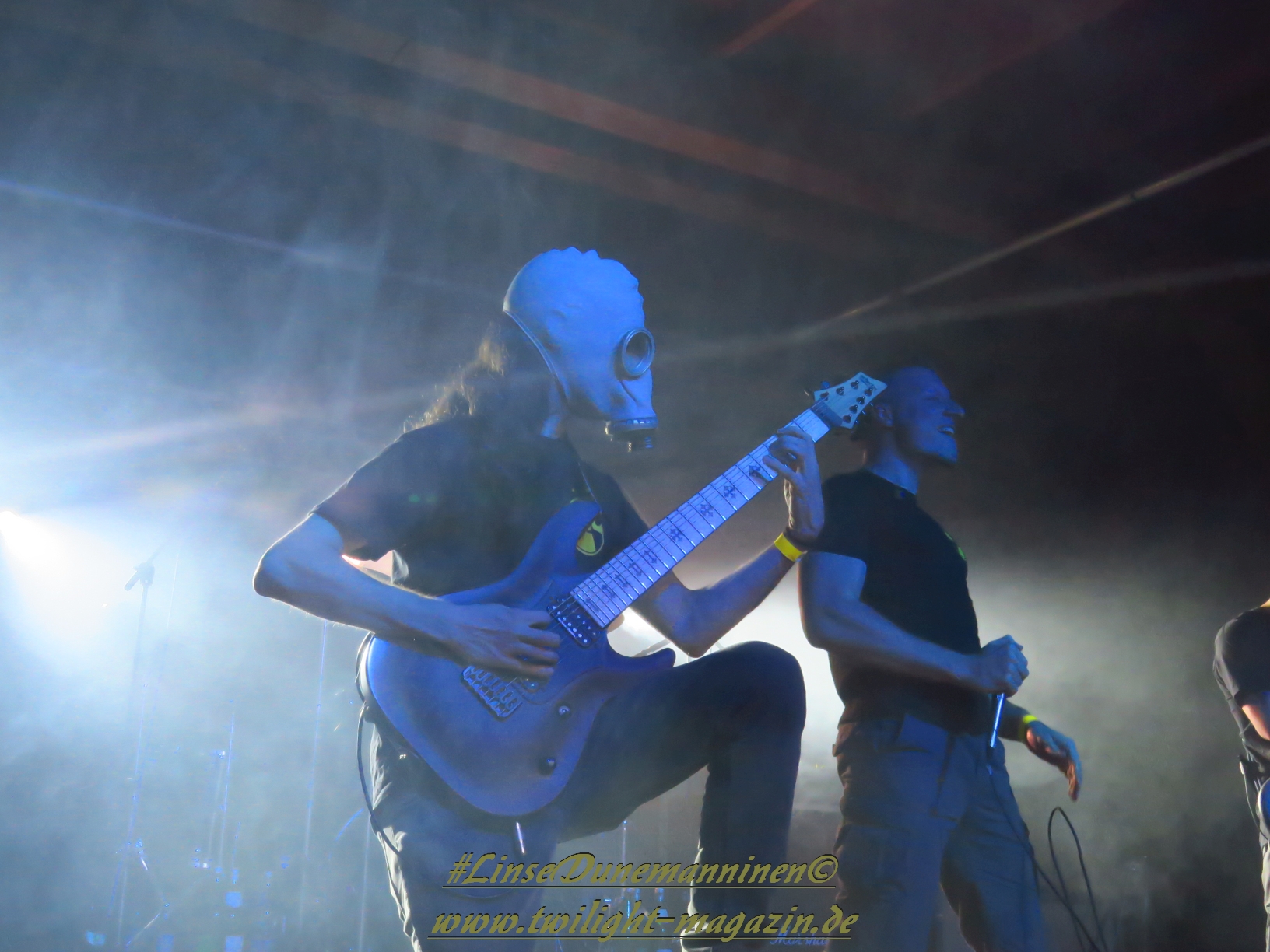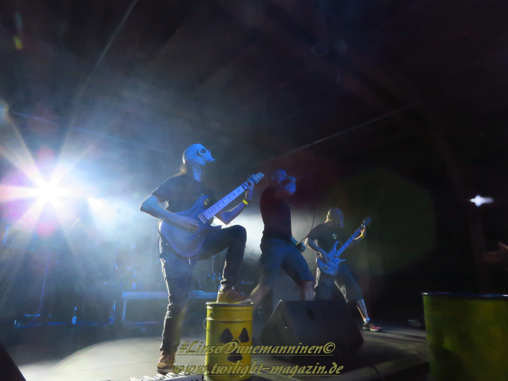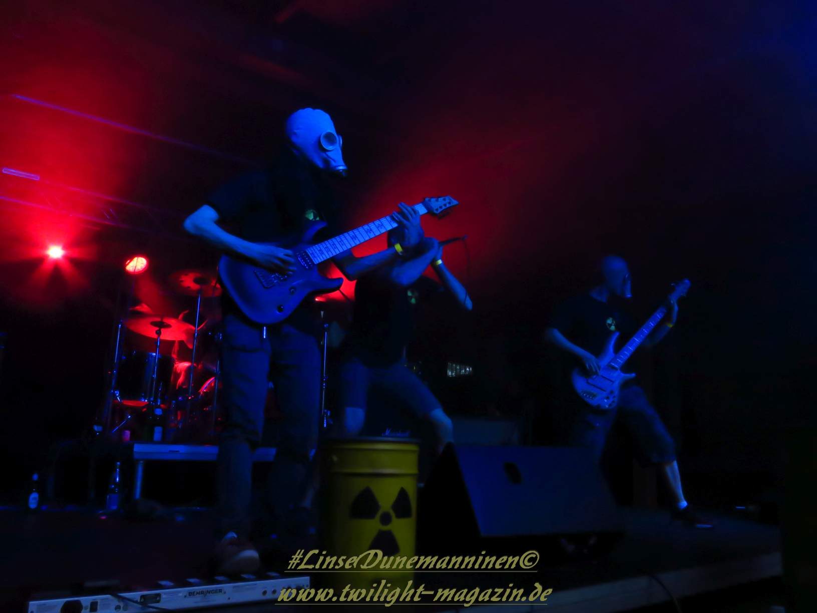 Auch die folgenden Tech-Deather von CYTOTOXIN sind stilistisch nicht wirklich meine Baustelle, obwohl der Vierer aus Chemnitz handwerklich wohl mit dem versiertesten Line-Up aufwartet. Musste bei Devastator vorschnell der plumpe Uhrwerksvergleich herhalten, dann bleibt mir nur übrig, der Instrumentalfraktion der Sachsen die Fitness einer Atomuhr zu bescheinigen. Während die Saitenfraktion sich durch abwechslungsreiche, moderne Deathgrind-Kompositionen frickeln, die von einem dichten, filigranen Schlagzeug-Gewitter unterlegt sind, quiekt, röhrt, grunzt, brüllt und schreit sich Gutturalakrobat Grimo die Eingeweide aus dem Körper. Die Klobürstenfraktion nimmt die musikalische Vorlage, welche zu Beginn in eine martialische Endzeit-Show samt Gasmasken und Giftfässern eingebettet ist, dankbar an und sorgt für reichlich Bewegung samt Circle-Pit vor der Bühne.