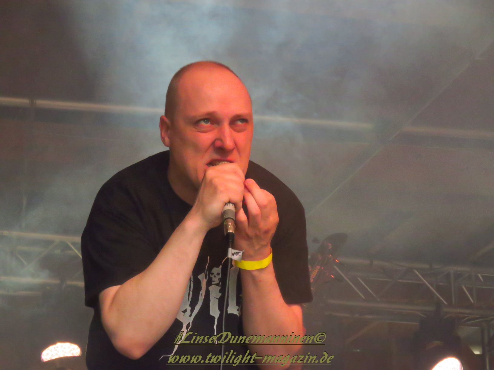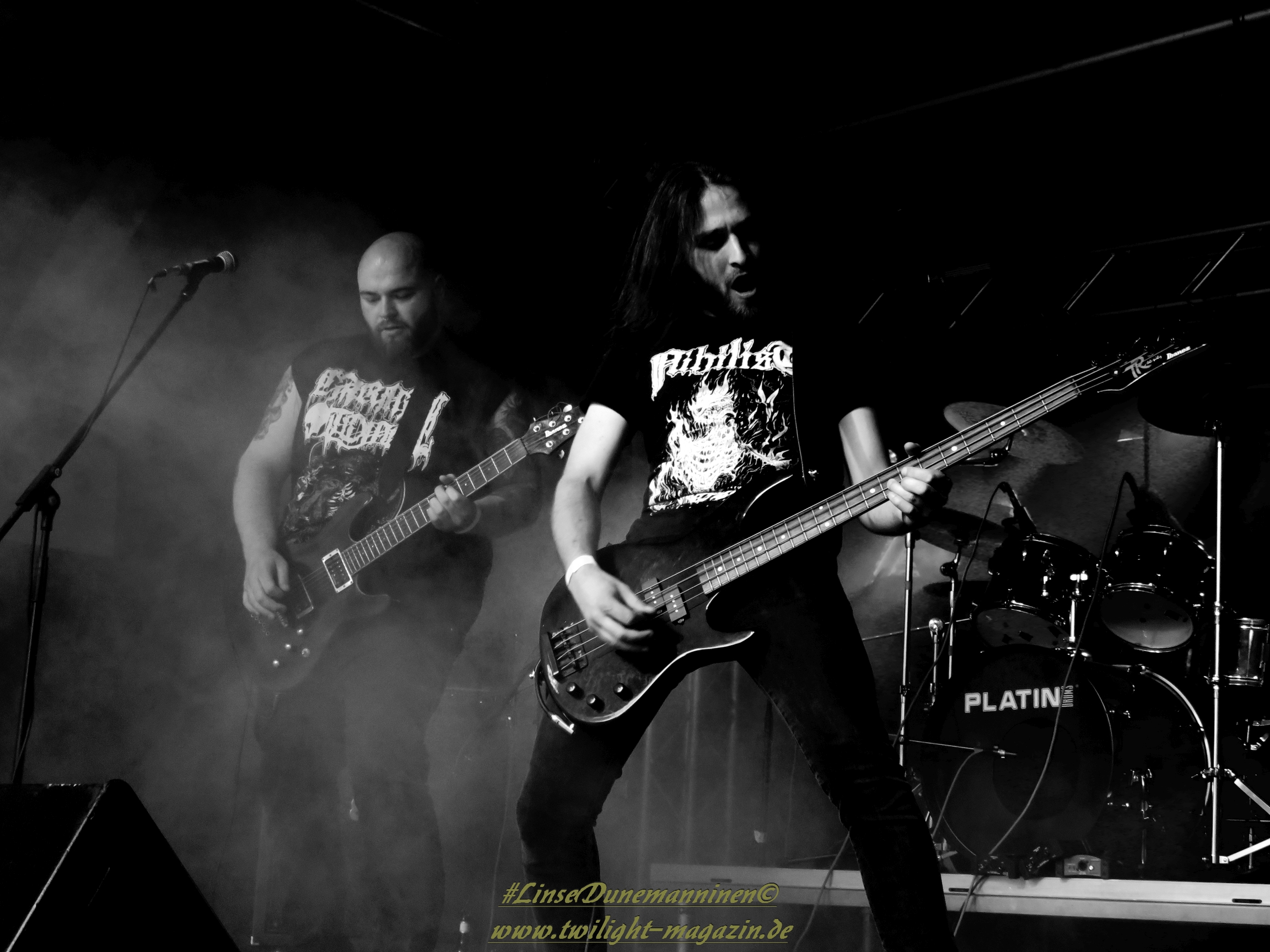 Für die Lokalmatadoren ATOMWINTER folgt anschließend ein Heimspiel, dass im Fußball einem zu verwandelnden Elfer ohne Torwart gleich kommen würde. Und das Quartett nimmt es ebenso sportlich und verwandelt das Geschenk wahrlich souverän. Allen voran Sänger Holzschneider, für den der Begriff Rampensau erfunden worden zu sein scheint, ein Typus Mensch, dem man sowohl abends im Dunkeln allein auf der Straße nicht wirklich begegnen möchte, auf den man jedoch in der ungemütlichsten Situation zählen kann. Darüber hinaus ist er mit einem außergewöhnlichen wie variablem Organ gesegnet, mit dem er großartig umzugehen weiß und mit dem er dem vermeintlich simplen aber äußerst effektiven Todesstahl ein äußerst saures Sahnehäubchen verpasst. Die Meute vor der Bühne huldigt dem Quartett und sorgt für einen amtlichen Moshpit. Keine Ahnung, wieso ich diese Band bisher nicht wirklich auf dem Radar hatte. Es gibt nicht wenige Bands, die aus relativ bescheidenen Mitteln soviel heraus holen. Wenn man einen "Asphyx-Gedächtnispreis" ausloben würde, dann wären Atomwinter jedenfalls ein ganz heißer Anwärter darauf. Die anstehenden Auftritte auf dem Protzen und dem Party.San Open Air sind, wenn nicht sogar überfällig, dann mehr als verdient.