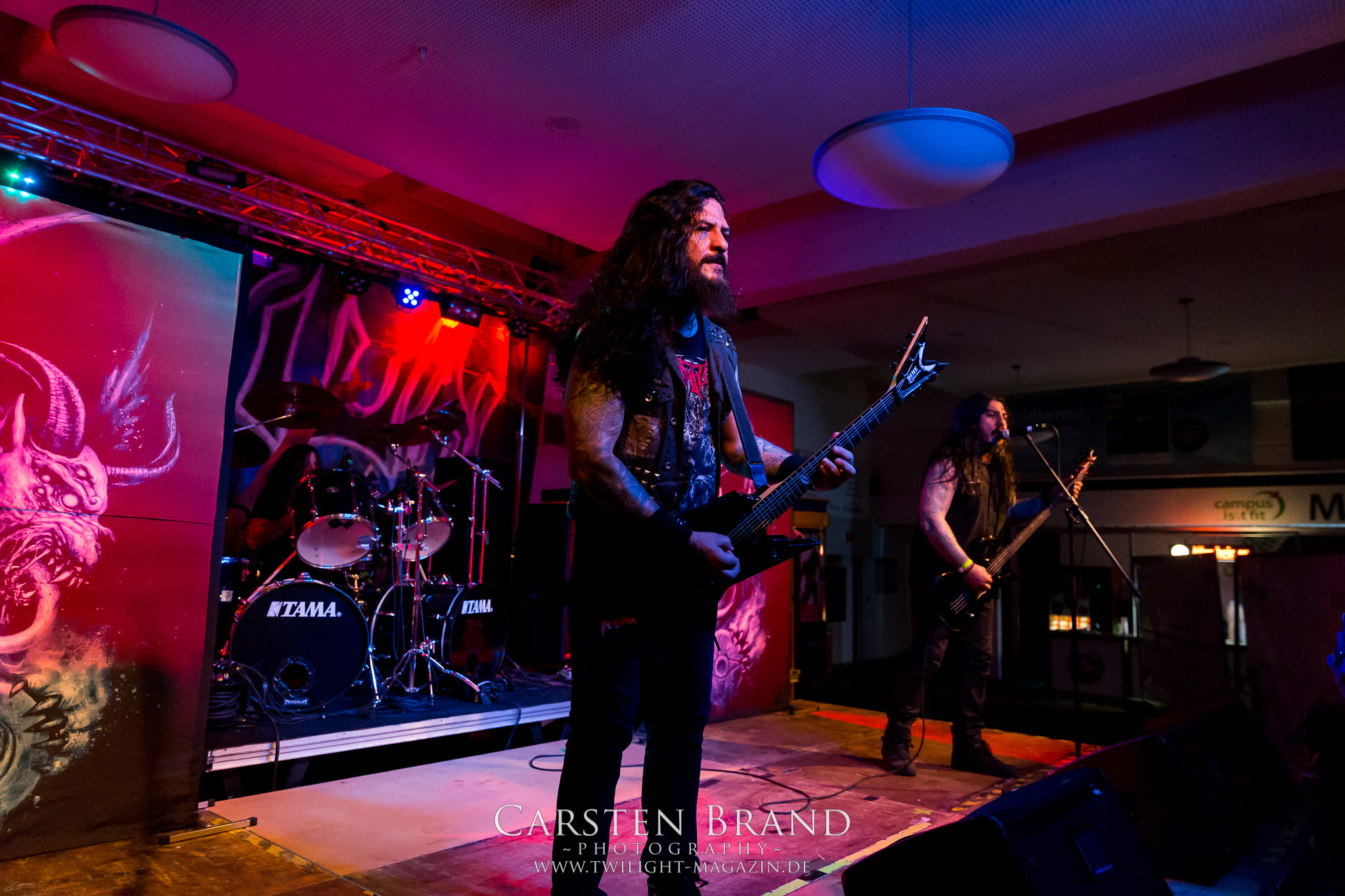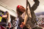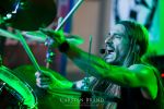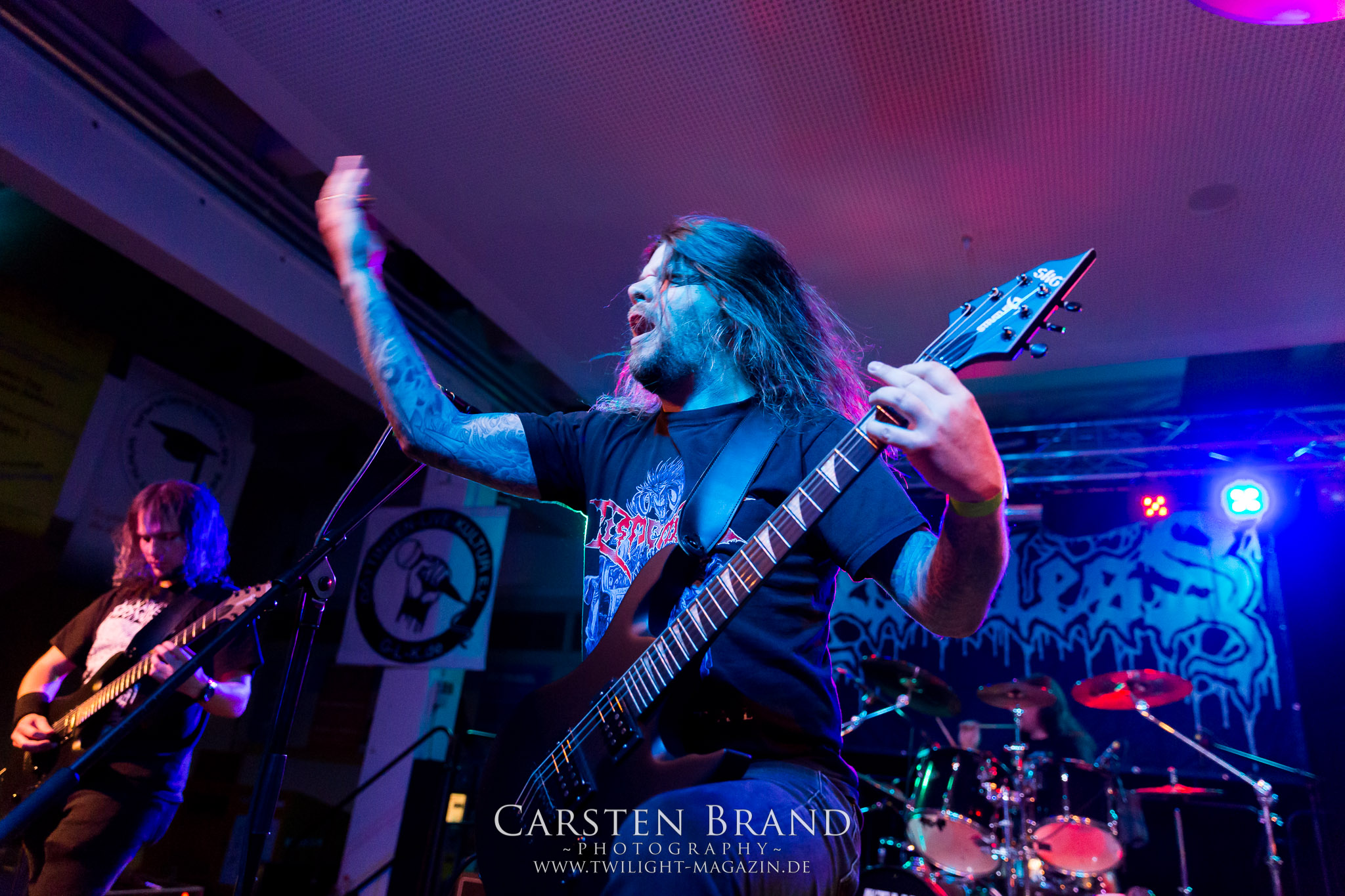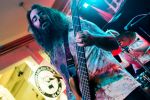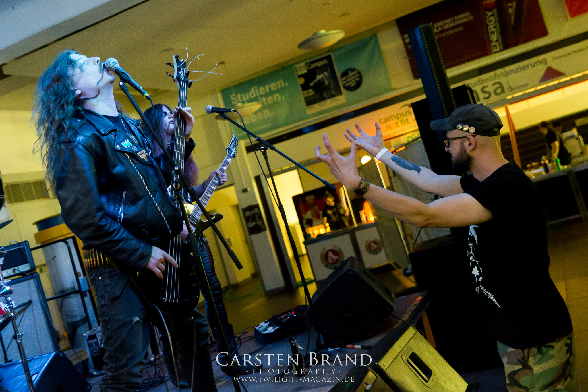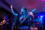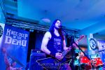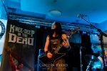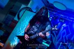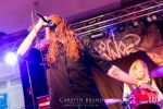 Obwohl die Running Order nach dem Umzug in die Mensa modifiziert und nach hinten verschoben wurde, verspätet sich der Festivalauftakt gehörig. Wenn es läuft, dann halt richtig. REPULSIVE FEAST lassen sich dadurch aber keineswegs aus dem Konzept bringen. Das Trio um Arcane Frost-Aron, Demored-Magnus und Cryptic Brood-Steffen haben einen Hang und Drang für rohen, groben und extrem ranzigen Death Metal mit Grindcore-Attacken, simpel brutal und auf alles Wesentliche reduziert, kraftvoll ohne dabei ins Chaos abzudriften. Leider gleicht die Vocal-Performance von Aron und Magnus über weite Strecken des rund halbstündigen Gigs einer Stummfilm-Einlage. Trotz dieser Soundprobleme weiß das Trio am Nachmittag in einer Location, die trotz aller Mühen der Veranstalter weitgehend frei von Flair und Atmosphäre ist, zu überzeugen und bietet für einen Opener einen schon recht amtlichen Auftakt, der auch vom noch recht überschaubaren Publikum honoriert wird.