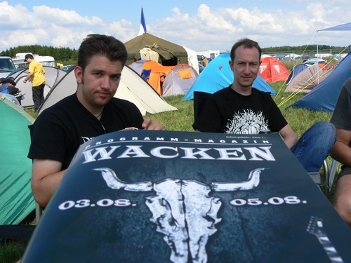 Mit Beach und weiblicher Begleitung im Gepäck ging es Richtung norden nach Wacken. Wochenlang hatte ich auf drei Websites die Wettervorhersage geprüft und mich zerknirscht auf Regen, Wolken und noch mehr Regen eingestellt. Als wir dann schließlich in dem Metalmekka Wacken ankamen, mussten wir zunächst die Mädels auf dem Campingplatz abladen - eine Prozedur, die Stunden und mir die letzten Nerven raubte. Als wir dann schließlich am frühen Nachmittag am Check In unsere Tickets etc. abholen wollten, ging der erste (und Gott sei Dank letzte) Regenschauer auf Beach und mich nieder. Irgendwann haben wir dann aber doch den Campingplatz erreicht, wo Daniel, Peter und Katrin etc. schon die Lokalitäten vorbereitet hatten.