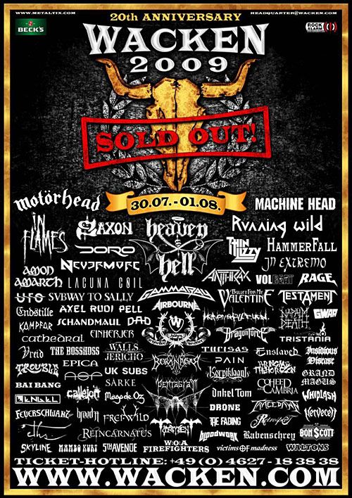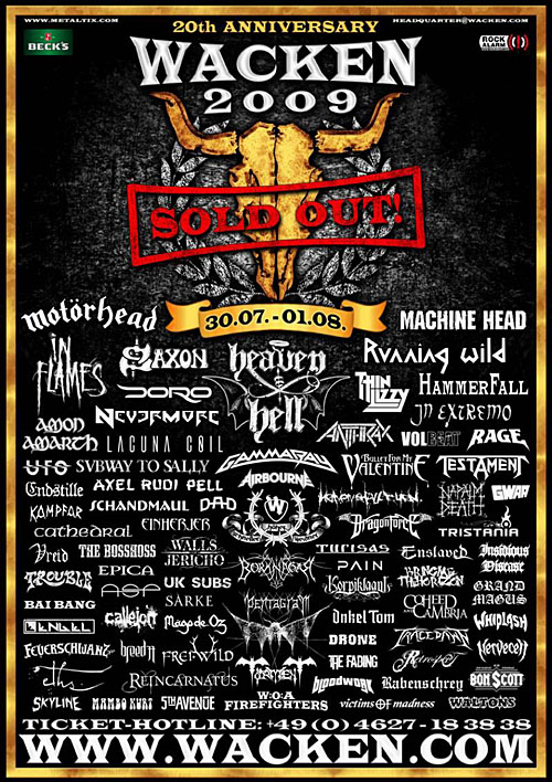 5th Avenue, A Fine Day To Exit, Ade, Adorned Blood, Adorned Brood, Airbourne, Amon Amarth, Anthrax, ASP, Axel Rudi Pell, Bai Bang, Beneath, Bloodwork, Bon Scott, Borknagar, Bring Me The Horizon, Bullet For My Valentine, Cadaver Race, Callejon, Cathedral, Coheed And Cambria, Crysys, Cumulo Nimbus, D-A-D, Der W, Doro, Dragonforce, Drone, Einherjer, Endstille, Engel, Enslaved, Epica, Eths, Fejd, Ferum, Feuerschwanz, Flotsam & Jetsam, Furion, Gamma Ray, Grand Magus, GWAR, Hammerfall, Heaven & Hell, Heaven Shall Burn, In Extremo, In Flames, Indidead, Ingrimm, Insidious Desease, Irr, Kampfar, Kielwater, Korpiklaani, Lacuna Coil, Leave Scars, Machine Head, Mambo Kurt, Motörhead, Napalm Death, Nervecell, Nevermore, Nine, Onkel Tom, Pain, Pentagram, Pentagramm, Rabenschrey, Rage, Ragnaröeck, Ragnaröek, Reason To Kill, Reincarnatus, Retrospect, Running Wild, Sarke, Saxon, Scarred, Schandmaul, Silence Means Death, Skyline, Subway To, Suidakra, Swashbuckle, T.a.n.k., Testament, The Bosshoss, The Fading, The Smackballz, The Waltons, Torment, Tracedawn, Trinitys Blood, Tristania, Trouble, Turisas, UFO, UK Subs, Victims Of Madness, Volbeat, Vreid, Wacken Firefighters, Walls Of Jericho, Whiplash, X-Plod
