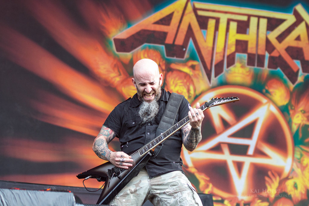 Leider hatte es am Samstag geregnet der Platz vor den Bühnen hat sich wie so oft in einen riesigen Schlammplatz verwandelt. Als Anthrax mit „among the living“ ihre Show starteten, wurde von den Fans sofort der Moshpit im Matsch eröffnet. Dazu passte „Caught in a Mosh“ wie die Faust aufs Auge. Ein super agiler Joey Belladonna flitzte ununterbrochen über die Bühne und suchte auch neben der Bühne den direkten Kontakt zu den Fans.