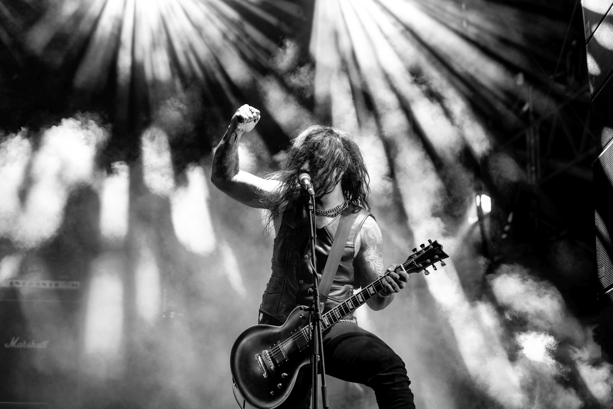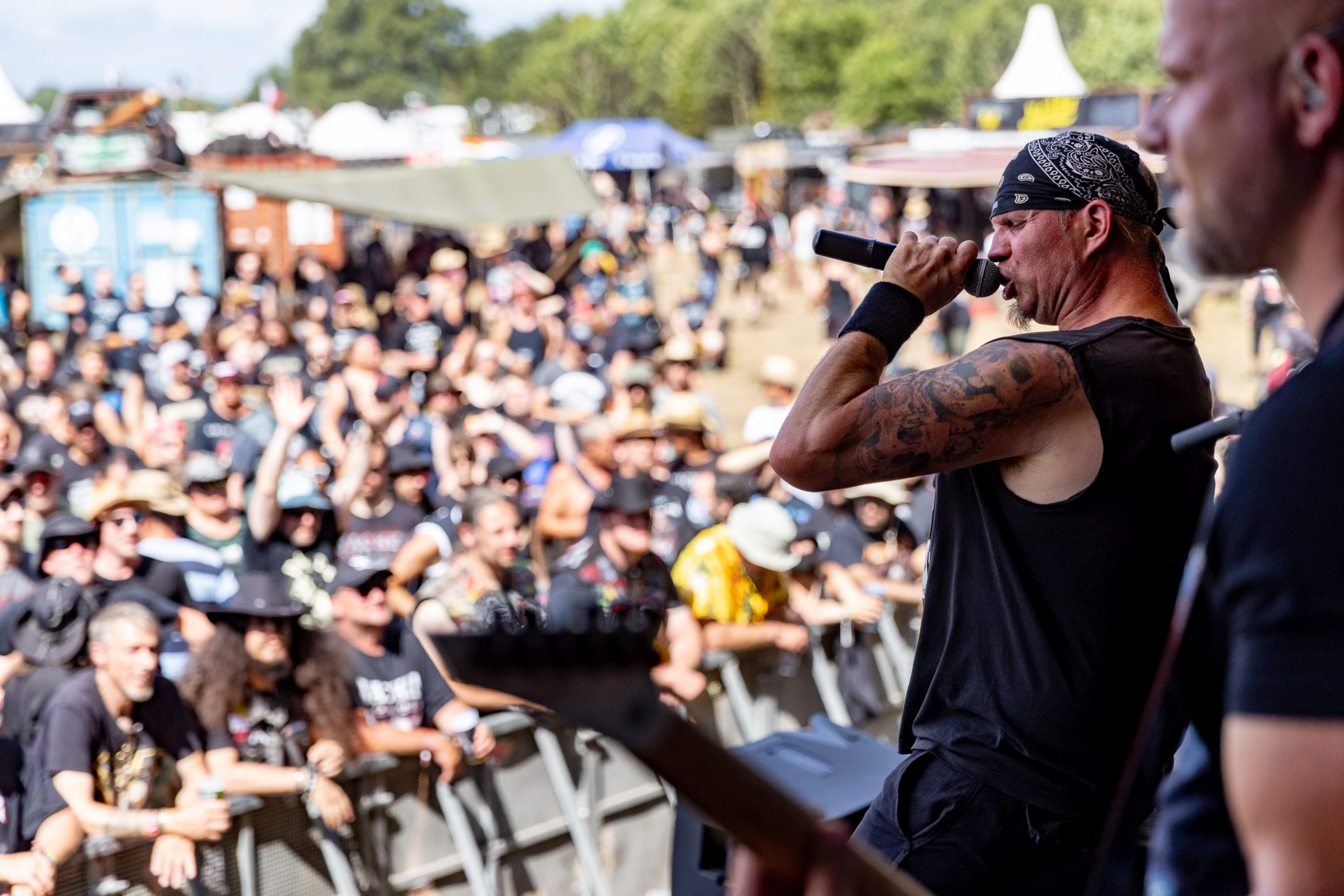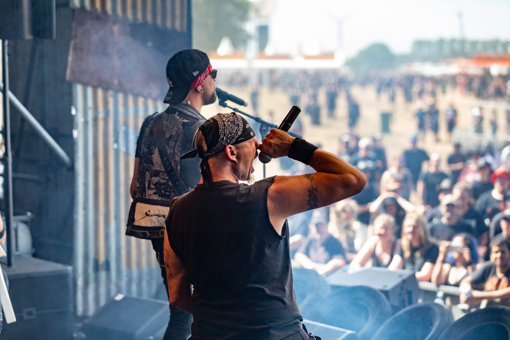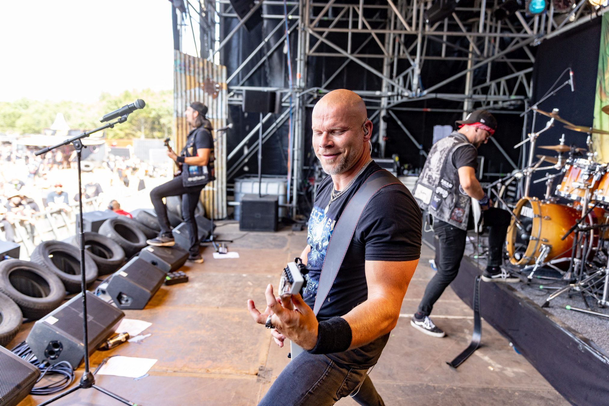 Nach diesem Hammer wird es für alle anderen Bands des Tages schwer zu punkten. Wir geben diese Chance BLACK INHALE auf der kleinen Wasteland Stage vor dem offiziellen Gelände. Die Wiener mit Ihrer eigenen Interpretation aus Hardrock und Death Metal legen von Anfang an mit „Escape Room“ und „The Pessimist“ vor einer zu anfangs noch überschaubaren Menge alles in die Waagschale. Ein wenig mehr Publikum gewinnt BLACK INHALE auch mit dem beherzten Auftritt, doch die Lage am Rande des Festivalgeländes lässt hier nicht viel zu. Auffallend ist der geniale Track „The Final Sorrow“. Leider bleibt uns heute „My Wish 2 Bleed“ verwehrt. Inhaltlich abgerundet wird der Gig durch den Song „Resilience“, der schon dem Namen nach die eigene Widerstandsfähigkeit thematisiert. Der Wandel der Arbeitswelt der letzten Dekade wäre schon Grund genug, dieses Thema in den Vordergrund zu stellen, Buzzword Burnout. Mit den Belastungen der Pandemie hat das Thema nochmal eine andere, weitaus tiefere Bedeutung bekommen. Wir sollten Arbeitnehmer und Familien soweit möglich bei dieser Mehrbelastung unterstützen, vor Überlastung schützen.Vor dem Hintergrund wäre es begrüßenswert, das Spektrum der Resilienz eng mit der Arbeitswelt zu verknüpfen.