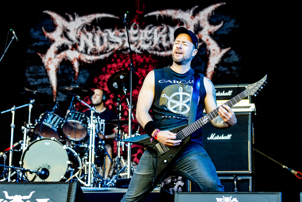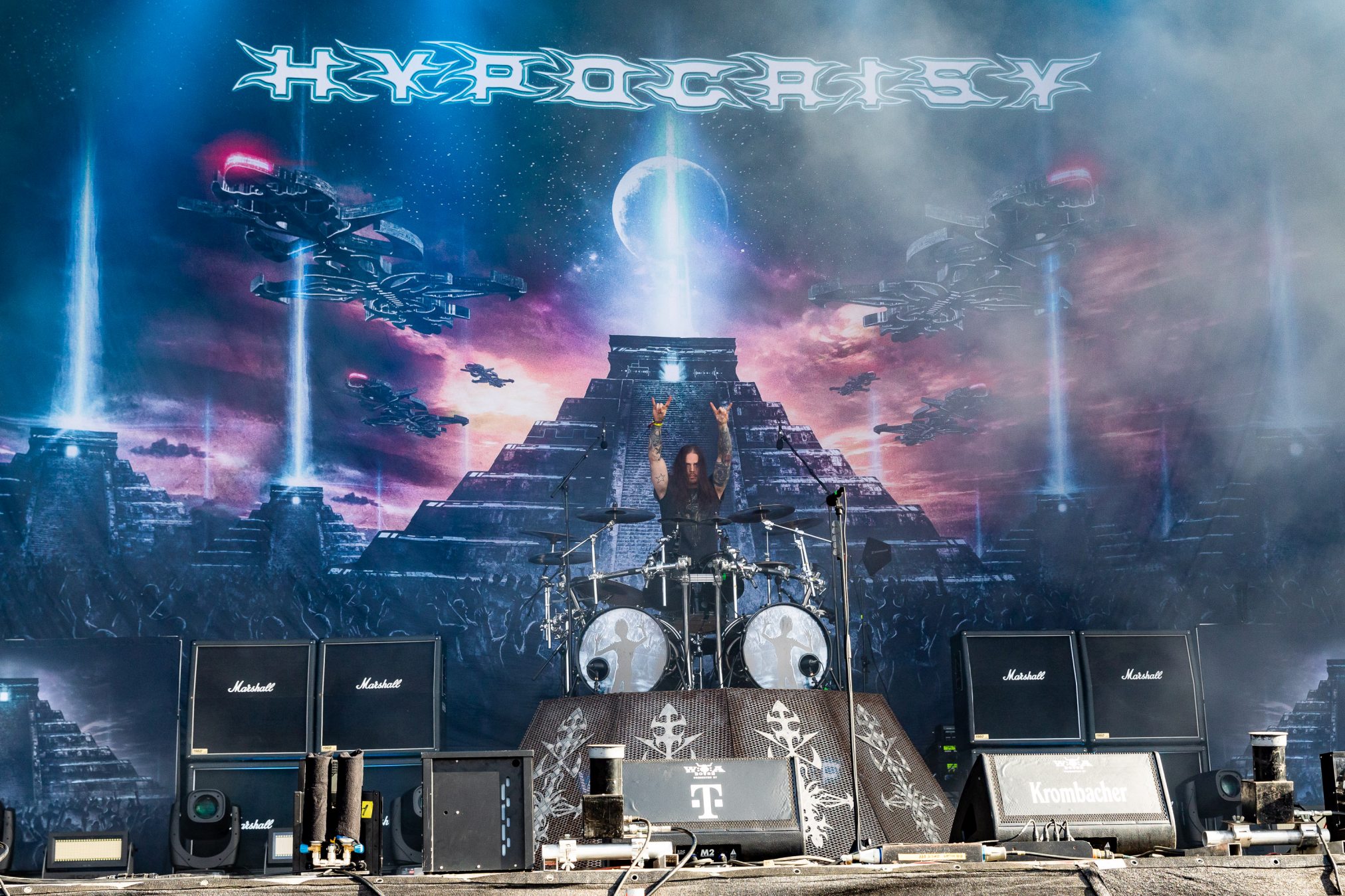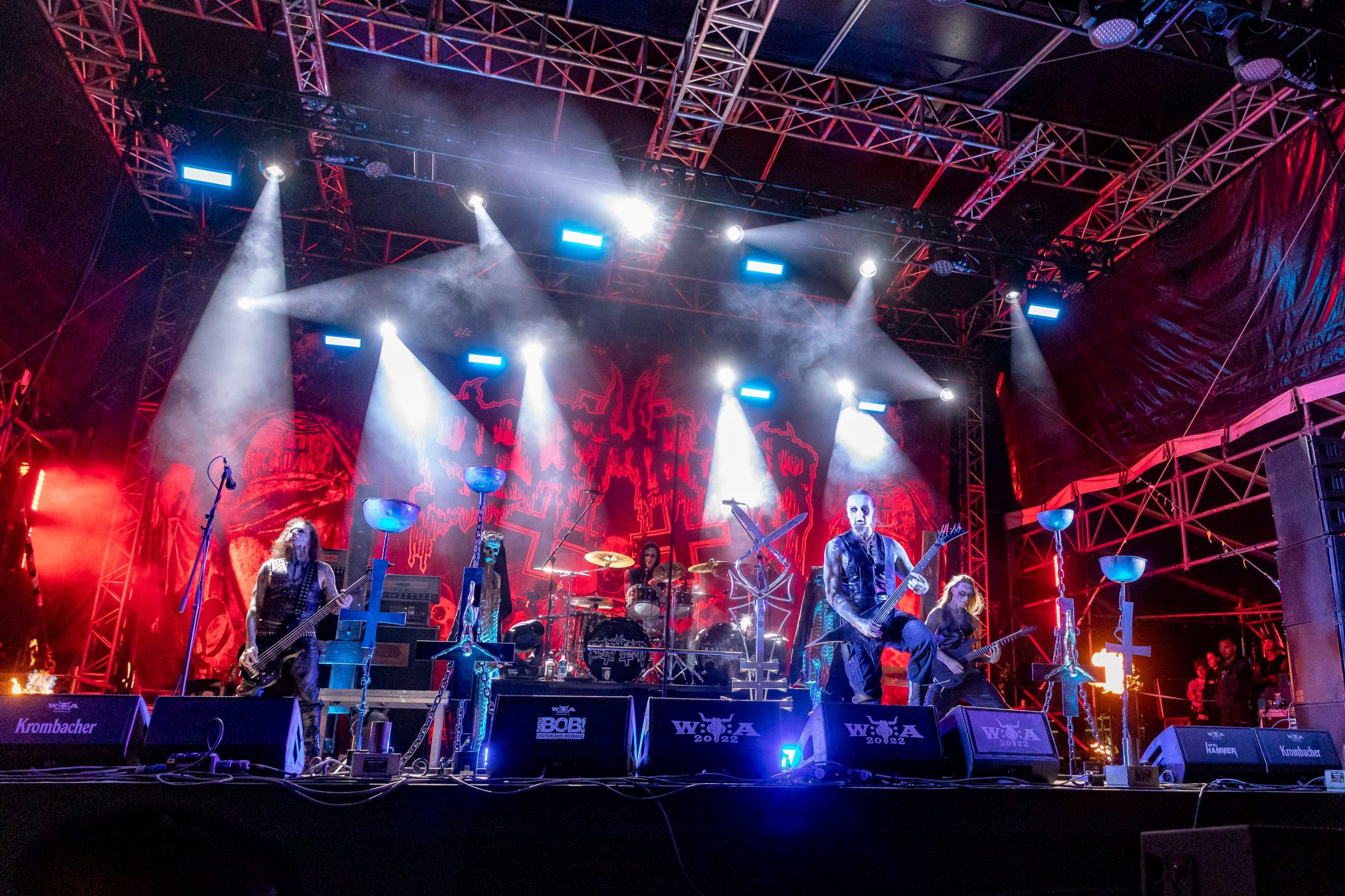 Von der „Minibühne“ zieht des uns zurück auf Faster Stage, dem linken Teil der großen Doppelbühne, zu den Göttern des Death Metal HYPOCRISY, nur um die Enttäuschung des Festivals zu erleben. Was vom (nennen wir es mal) Sound bei uns ankommt geht gar nicht. Sind wir doch auf dem falschen Festival gelandet? Seit Jahren lobpreisen wir zurecht die vorbildlichen Voraussetzungen auf dem WOA für kleine und große Bands, da über alle Bühnen hinweg Sound und Licht stimmen und dann so etwas auf einer der großen Bühne? Wir versuchen der Sache eine Chance zu geben und meinen sogar den Klassiker „Eraser“ erkennen zu können, drehen dann aber doch ab und geben dem Biergarten den Vorzug. Wäre KISSIN‘ DYNAMITE nicht gewesen, unsere Laune wäre hart auf dem Boden aufgeschlagen. So verbleibt nur Mitleid mit den Männern um Peter Tägtgren, die hier Vollgas geben und (wie wir schon erleben durften) mit dem richtigen Sound immer dazu in der Lage sind, einen unvergesslichen Abend einzuleiten.