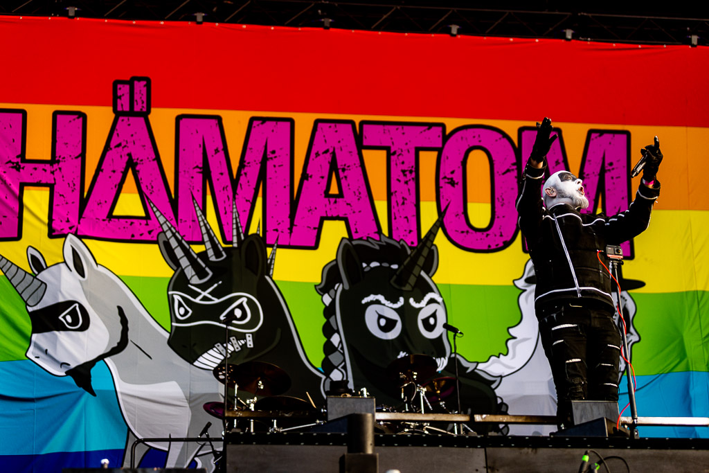 Mitten im Sinnieren werden wir erneut überrascht, da HÄMATOM schon heute die Bühne stürmen. Untermalt von Dudelsäcken ihrer befreundeten Band IN EXTREMO gibt es eine halbe Stunde lang die bandtypische Mischung aus Zorn und Dagegen. So lässt es sich im Biergarten aushalten.