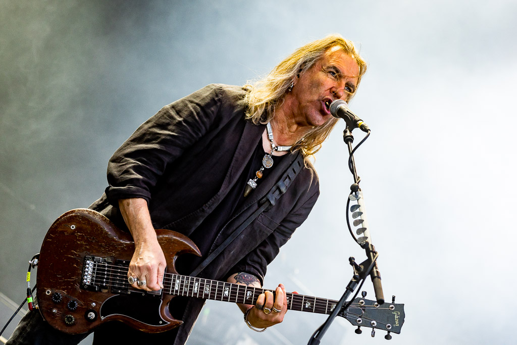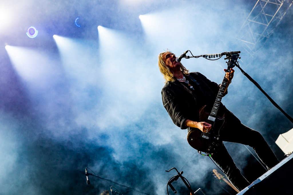 Bühne frei für das musikalische Urgestein MICHAEL MONROE. Dieser steht die nächsten 75 Minuten für Rockparty und kann voll mit seiner Mixtur aus Glam-, Punk- und Bluesrock überzeugen. Der finnische Sänger ist glamourös und beherrscht die Bühne in seinem zarten Alter von nunmehr fast 60 Jahren mühelos. Neben seiner überzeugenden Stimme springt er vom Lautsprecherturm, bringt mehrere Spagate ein, um musikalisch dann wie nebenläufig mit Mundharmonika und Saxophon zu überzeugen. Selten haben wir einen so schillernden Frontmann gesehen und kann nun verstehen, wie Projekte mit Guns‘N‘Roses entstanden sind. Auf der persönlichen Ebene bleibt ihm zu wünschen, dass die Transgender-Bewegung dazu beigetragen hat, dass er als Mann mit einem Faible fürs Schminken, weniger Abneigung erfährt.