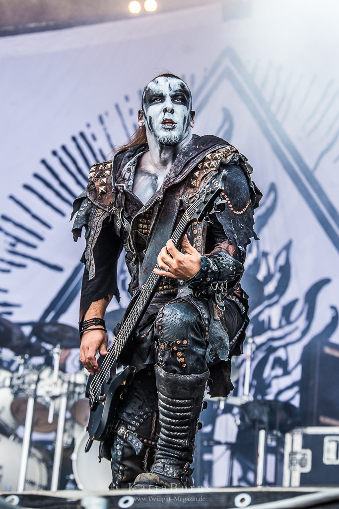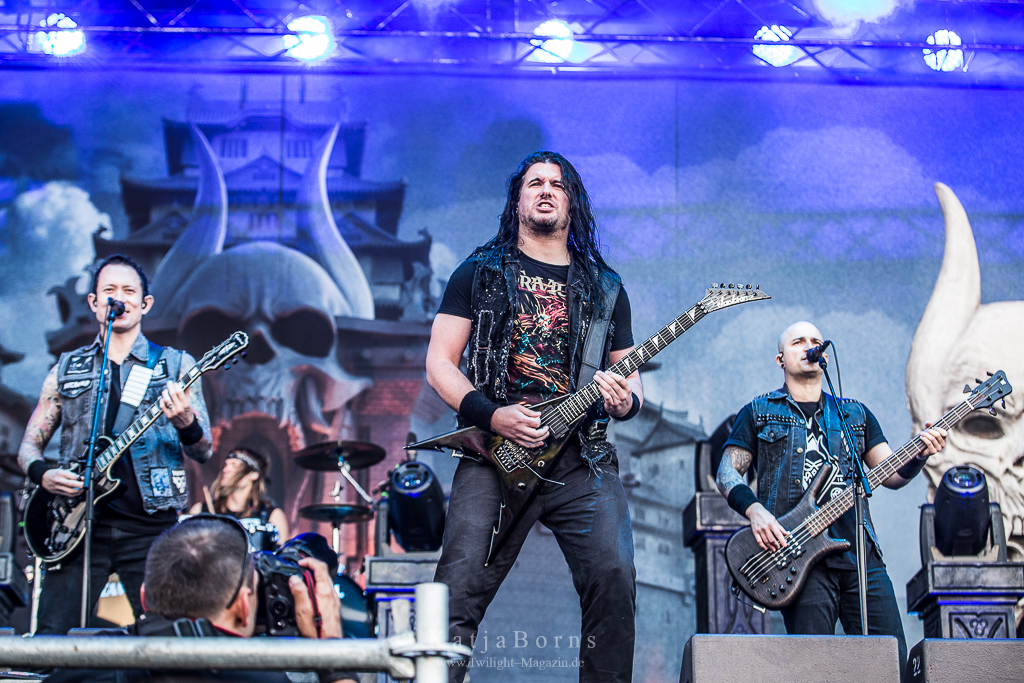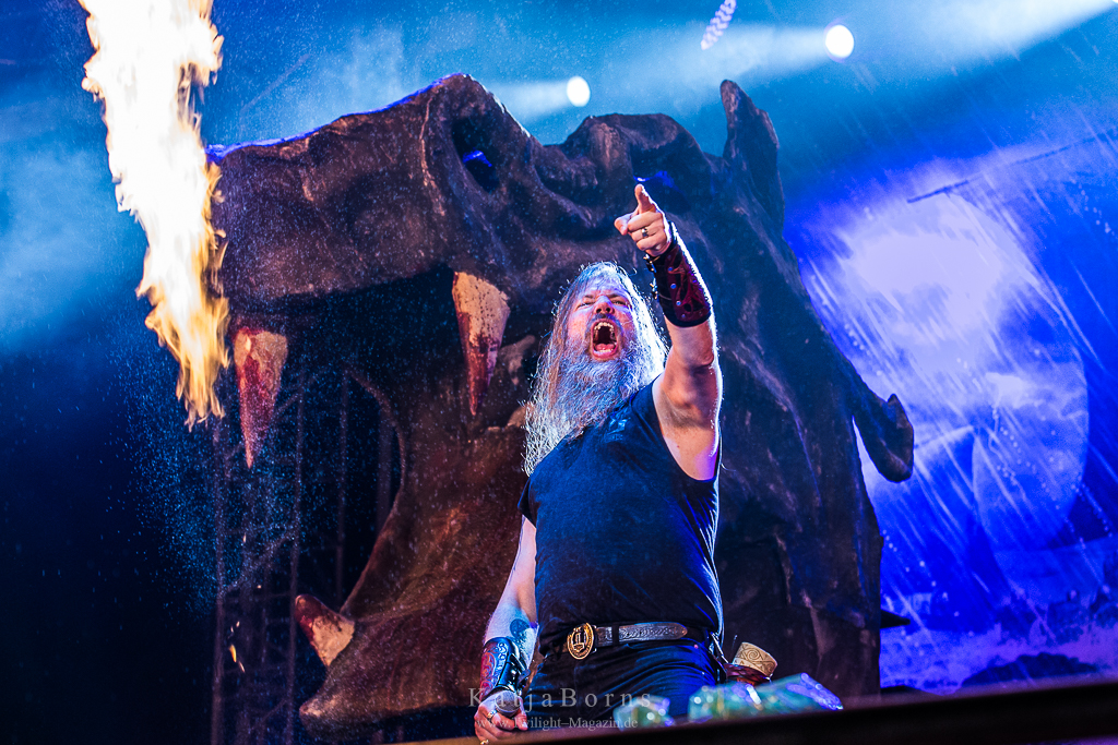 Die Verlängerung und das Elfmeterschießen waren vermutlich eine arge Geduldsprobe für den Headliner, der mit seinem Auftritt auf das Ende des Fußballspiels warten musst. Durch das Ergebnis war allerdings beste Stimmung auf dem Platz, als sich aus viel Rauch und bunten Lichtern zwei Drachenköpfe erhoben und das Erscheinen der nordischen Berserker ankündigte. AMON AMARTH eröffnete auch gleich mit einem Klassiker und das bekannte Riff aus „The Pursuit of Vikings“ erlaubte es uns zahlreich anwesenden Zuschauern sofort wieder vom Fußball- in den Metal-Mod