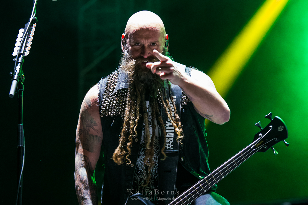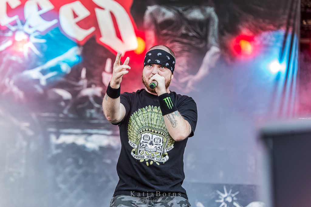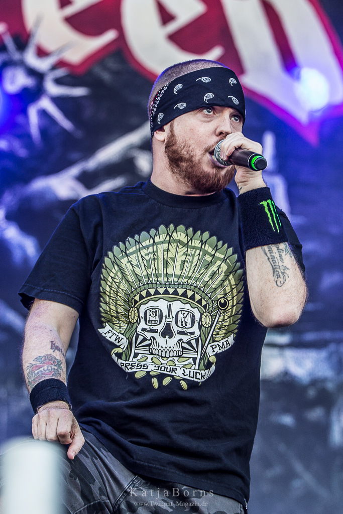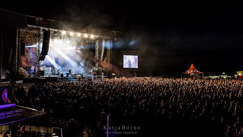 Das bringt uns dann auch direkt zu den Bands oder zumindest zu den Künstlern, von denen ich berichten kann. Leider war mein Besuch beim With Full Force relativ spontan und arbeitsbedingt konnte ich erst am Samstag anreisen. So habe ich nicht nur die gesamte Knüppelnacht mit INQUISITION, VADER, RAGNAROK, GRAVE und ENDSTILLE verpasst, sondern auch den dröhnenden Blutregen von SLAYER, einer absoluten Lieblingsband wohl nicht nur von mir. Das ist besonders tragisch, weil jeder Auftritt von Tom Araya, Kerry King und mittlerweile eben Gary Holt ein absolutes Brett ist, was einem direkt in den Unterleib gehämmert wird. Ich habe überhaupt nur einen Auftritt von Slayer erlebt, bei dem das nicht so war und das war interessanterweise beim With Full Force 2005, als der Sound so leise abgemischt war, dass man die Songs überhaupt erst nach einigen Minuten extrem angestrengten Zuhörens erahnen konnte. Inzwischen haben aber wohl alle dazugelernt und so verlebten die Fans dem Hörensagen nach einen nicht nur sehr sonnigen, sondern auch von harten und lauten Riffs geprägten, ersten Festivaltag ohne mich – verdammte Arbeit!