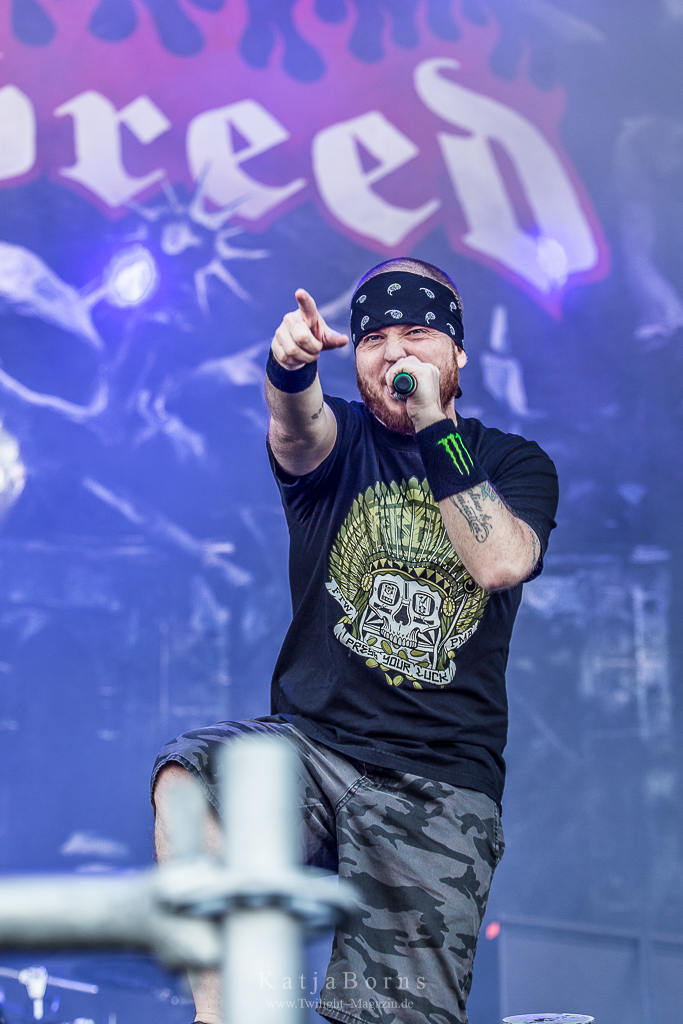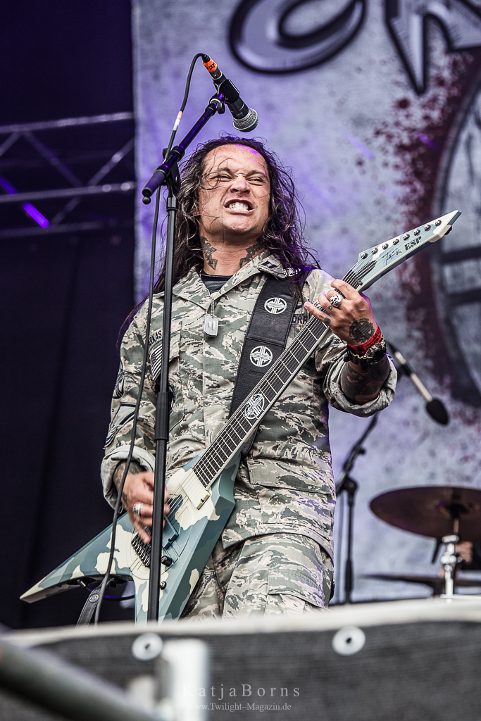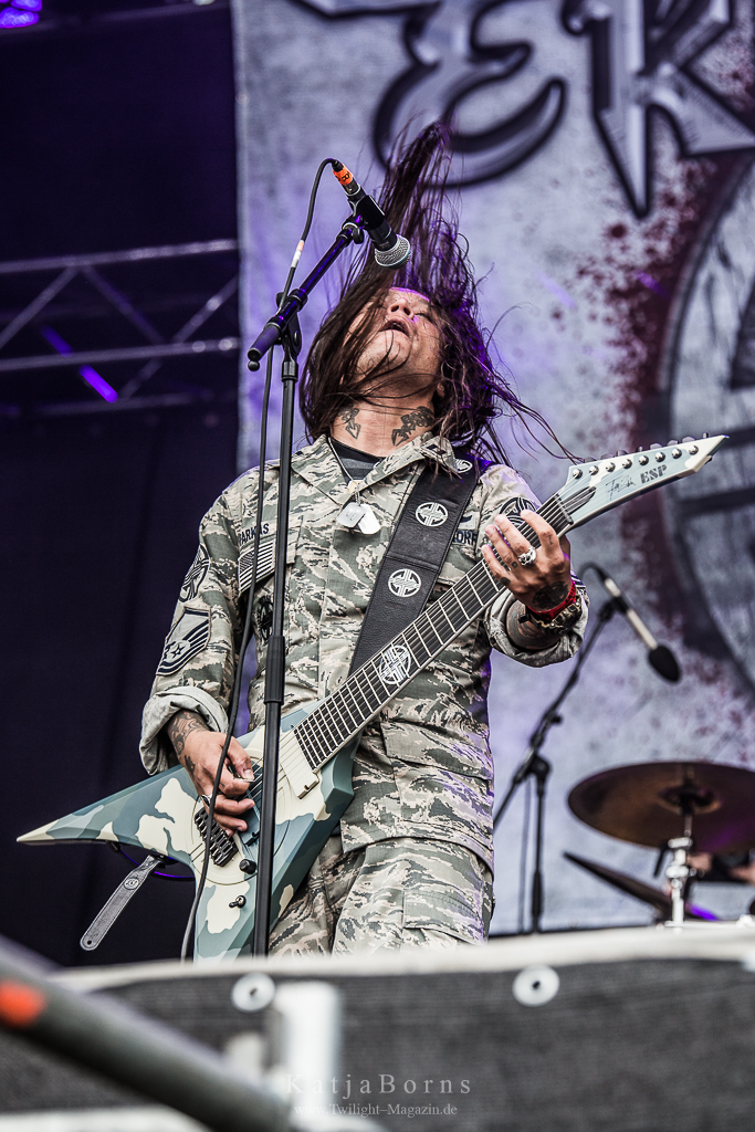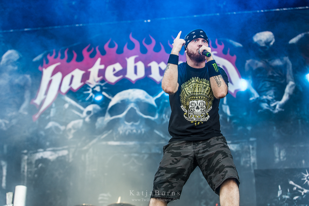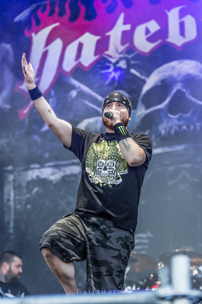 Der Samstag begann zunächst mit einer Sturmwarnung und nach den bisherigen Desastern bei Rock am Ring sowie beim Hurricane und beim Southside Festival gab es schon einige böse Vorahnungen. Trotz der vielen Agnostiker scheint der Wettergott aber Heavy Metal eben doch zu lieben und so blieb es bei einigen Schauern und einer recht steifen Brise am Nachmittag. Kein einziger Auftritt musste abgesagt werden. Zum späten Nachmittag gab es dann bestes Festivalwetter bei etwas über 20°C und so konnte Zoltan mit seiner Band EKTOMORF in Bestform über die Bühne hüpfen während die Menge trockenen Fußes im Pit kreiselte. Anschließend feierte BEHEMOTH mit uns eine satanische Messe und spätestens jetzt hätte der massive Einsatz der Flammenwerfer wohl jede aufkommende Regenwolke sofort verdunsten lassen. Noch etwas benebelt vom Weihrauch blieb keine Zeit sich Sorgen um das eigene Seelenheil zu machen, schon brüllte Jamey Jasta uns zurück ins das hier und jetzt. HATEBREED trafen wie das Geschoss aus einer Pumpgun den Nerv des Publikums.