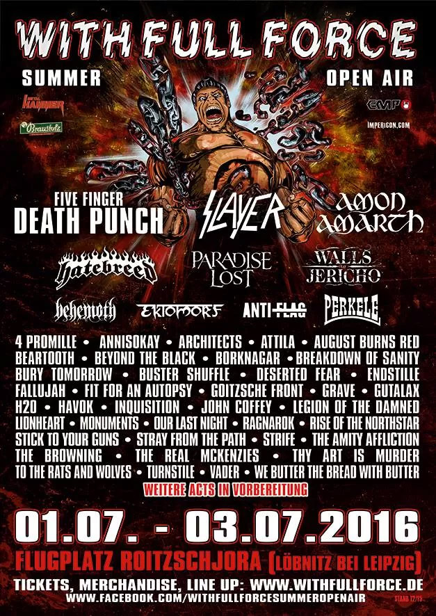 Bereits zum 23. Mal ruft das With Full Force die Anhänger des Modern & Nu Metal, Metal- & Hardcore sowie des Punkrocks auf das Gelände des Fliegerklubs Roitzschjora e. V. am Mühlfeldsee bei Löbnitz. Nicht ganz ausverkauft folgen knapp 25.000 Fans des gepflegten Lärms diesem Ruf und versammeln sich auf dem Partyacker eines der wenigen großen Festivals in Deutschlands Osten.