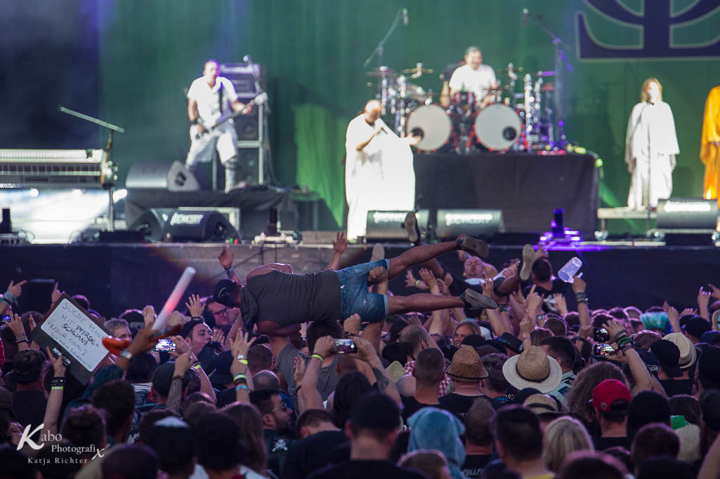Samstag – Geweckt von der großen hellen Scheibe, die viel zu früh und viel zu stark am Himmel stand, musste der Kreislauf nun erstmal langsam hochfahren und sich an das Wochenende gewöhnen – man sind wir alt geworden! Für CROWBAR haben wir uns dann doch irgendwann zum Festivalgelände geschleppt und mit Kirk in der Hitze gelitten. Die Hauptbühne ist für die Truppe aus Louisiana definitiv angemessen, nur leider fand sich das Publikum hier nur spärlich zusammen. Dennoch gelang es den Amis spielend leicht, die anwesenden, vor Hitze brütenden Gehirne, in ein sludgiges Doom-Parallel-Universum zu kicken. Zu den schweren Riffs und Rhythmen will schließlich mitgebangt werden und Songs wie “All I had I gave” oder “Planets Collide” laden auch wunderbar zum Mitgröhlen ein. Weiter ging es mit INFECTED RAIN auf der Seebühne und JINJER im Hardbowl – beide stark und irgendwie passend auf ihren Bühnen. Jinjer Fronfrau Tatiana Shmaylyuk nahm in ihrem schrill goldenen Outfit und ihrer unfassbaren Energie sogleich die Bühne in Besitz und sollte sie für den Rest des Auftritts auch nicht wieder hergeben. Passender hätte “Dying in heat is a rehearsel for being in hell” an diesem Tag nicht sein können!