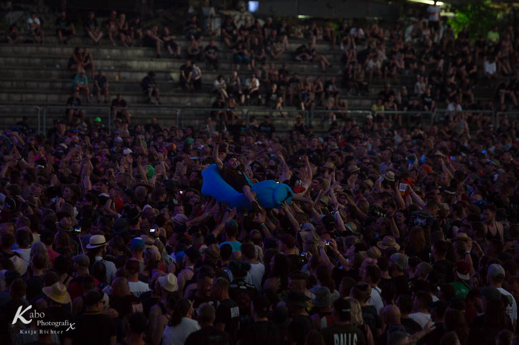 Sonntag – wir haben bis hierher überlebt, also warum jetzt schonen?! Die Hardcore-Punk-Legende IGNITE aus Orange County hatte die Stimmung und die Festivalmeute trotz der enormen Hitze gut im Griff. Die Kalifornier um Goldkehlchen Zoltán Téglás hauten praktisch einen Hit nach dem anderen raus und der energetische Sound, der brachial von der Bühne geschmettert kam, zerlegte die schwitzenden Leiber wie von selbst. Starten wir entspannt mit IGNITE auf der Hauptbühne um uns auf den nächsten Act auf unserer Liste vorzubereiten – haben wir gedacht. Was wir nicht bedacht haben – nichts und niemand bereitet dich auf GUTALAX vor – es passiert einfach. 2016 hier auf dem Festival entdeckt waren wir von Anfang an fasziniert von diesen „wilden Tschechen“ mit ihrer abgefahrenen „Bühnen-Kultur“ und ihrem ganz eigenen Verständnis von „Grindcore“. Passend platziert auf der Seebühne genossen wir die geile Mischung aus Sonne, Strand, Wasser – und eben Gutalax. Die Jungs machen ihren Job richtig gut, da kann man nix meckern, einfach Luft anhalten und genießen. Am besten sind sowieso die verstört irritierten Blicke die man kassiert, wenn man so einen „Scheiß“ am Nachmittag in brütender Hitze vom Wasser aus auch noch mitfeiert. Deutlich „humaner“ ging es bei THE OCEAN zu, welche vor allem auch musikalisch einen heftigen Kontrast boten und nochmal die Vielfältigkeit auf dem Full Force unterstrichen. Mit einem sphärischen Intro und konsequentem Stimmungsaufbau kühlten The Ocean mit ihrer Mischung aus Sludge und Progressive Metal zumindest die Gemüter etwas ab. Ganz ohne Berührungsängste warf sich dann Sänger Loic Rossetti während des dritten Songs seinen Fans entgegen und crowdsurfte ganz entspannt vor stimmungsvoller Kulisse. Lauter und aggressiver wurde es dann wieder mit BEARTOOTH auf der Hauptbühne, die ordentlich abfeuerten und nochmal alles forderten, was die Meute zu bieten hatte. Auch POWER TRIP zeigten kein Erbarmen und zerlegten die Gemeinde im Zelt, als hätte hier keiner unter den letzten Tagen gelitten. LAMB OF GOD als Einleitung in ein würdiges Finale der 26. Ausgabe vom „härtesten Acker der Welt“ ließen uns dann doch wieder melancholisch werden – letzter Tag, morgen geht´s nach Hause, also nochmal genießen! Ebenso auf diesem Festival entdeckt haben wir vor Jahren MANTAR, damals noch auf dem alten Gelände in Roitzschjora, am frühen Nachmittag bei brütender Hitze auf den schmelzenden Gummimatten vor der Mainstage, haben sie uns damals komplett den Kopf abgerissen. Diesmal, abends auf der Bühne am See, haben sie uns in scheiß-gemütlicher Strandatmosphäre einfach die Energie ins Hirn zurückgeblasen, die wir die Tage zuvor abgelassen hatten –