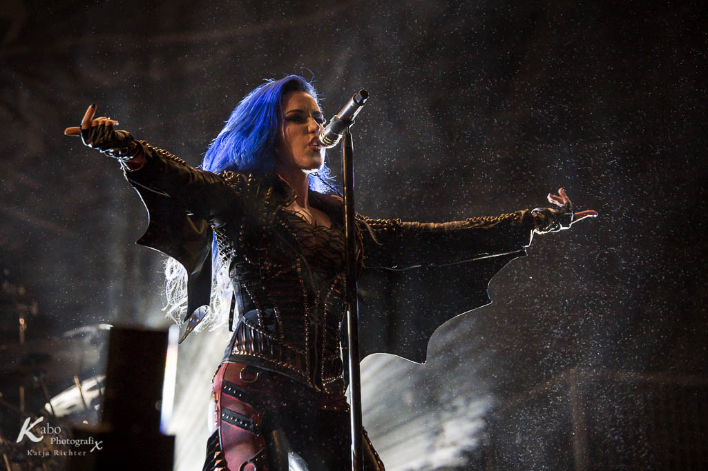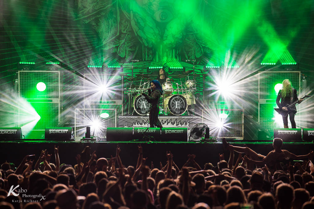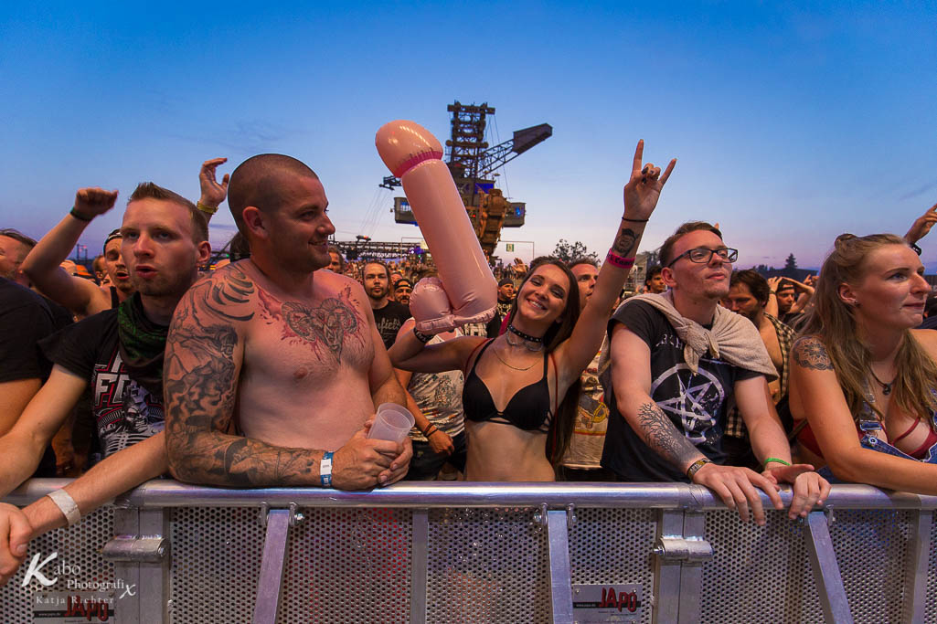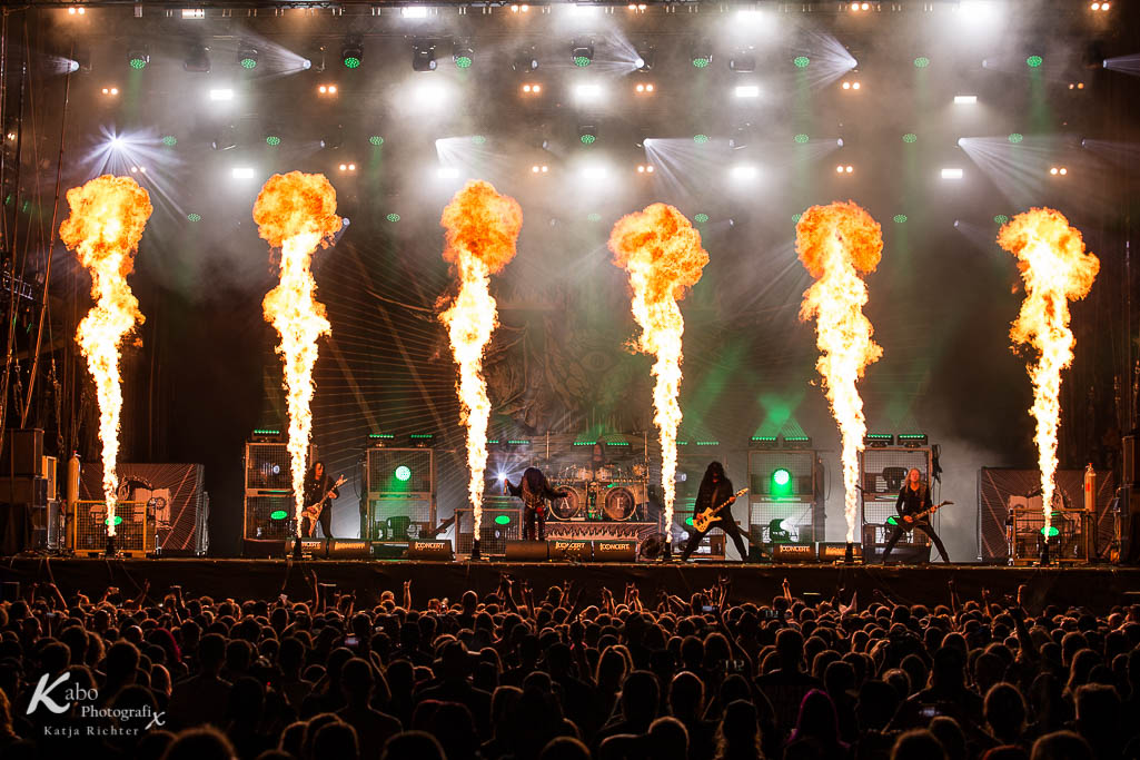 Dennoch peitschte Jinjer ihr fanreiches Publikum gnadenlos weiter nach vorn und mit damönischer Präsenz geradewegs ins Metal-Fegefeuer. Bei AT THE GATES und KNORKATOR auf der Mad Max Stage war es dann wieder vorbei mit Schonhaltung und es durften alle Muskeln strapaziert werden. Mit ihrem melodischen Death Metal, der keine Ermüdungserscheinungen und keine moderne Sänfte an den Tag legt, haben sich At the Gates um ihren Legendenstatus verdient gemacht. Tompa Lindberg, mit seinem mittlerweile zum Markenzeichen gewordenen Look im Cappy, ist in stimmlicher Bestform und führt gekonnt durch das Set, das sich die Waage aus Klassikern und neuem Material hält. Bereits der Bühnenaufbau von KNORKATOR ließ auf einiges hoffen. Grundsätzlich gehören die Auftritte von Knorkator zum Full Force wie die Erdbeerbowle. Wo andere Bands Balsam für den Körper sind, sind Knorkator purer Urlaub für die Synapsen. Als Verstärkung holte man sich aus Österreich zwei vollkommen durchgeknallte Vögel, die unter dem Namen dummeSau.lol für allerlei Schabernack sorgten. Anscheinend boten sie Ersatz für den am Knie verletzten Stumpen, und so wurde von Leitern auf Tapezier-Tische gedivet, mit einem Gummistiefel an einer Wippe dem Gegenüber mit ordentlich Schmackes ins Gemächt getreten oder mit einer Pümpelkanone aufeinander geschossen. Auch vor den eigenen Tourmitgliedern wurde nicht Halt gemacht und so wurde das diesjährig auserwählte Opfer in einen großen Plexiglas-Kasten gesteckt, in dem dann via Fernzündung eine riesige Schwarzwälder-Kirsch-Torte explodierte. Aber das FullForce-Publikum wäre nicht das FullForce-Publikum, wenn es diesen Mann anschließend nicht ehrenvoll beim crowdsurfen wieder sauber geleckt hätte. Neben den eigenen Kindern gehörte diesmal auch Kumpel RUMMELSNUFF zur Bühnenshow, der eine sehr klare und verständliche Version von “Mich verfolgt meine eigene Scheiße” darbrachte. Abwechslung boten SMOKE BLOW mit gewohntem Live-Potential und ihrer schweißtreibenden Hardcore-Punk-Variante im Hardbowl und ALCEST mit ihren stimmungsvollen Instrumentals am Strand – was eine abgefahrene Mischung! Mit ihren dichten Klangwelten lockte der anfangs noch ziemlich leere Sandstreifen immer mehr neue Zuhörer. Auch wenn der Bass leider stark übersteuert war, ließen Alcest das Publikum in der geschaffenen Atmospshäre andächtig im nun kühler werdenden Sand träumen. Abgerundet wurde der Samstag für uns mit TERROR in der Tentstage, die alles zerlegten und die sowieso schon ausgelaugten Leiber nochmal ordentlich durch die Schwitz-Presse jagten. Kein Wunder also, dass ARCH ENEMY mit beeindruckender Bühnenkulisse und ordentlich Feuerwerk mehr entspannte „Zuschau-Unterhaltung“ boten, als Anreiz zur Bewegung.