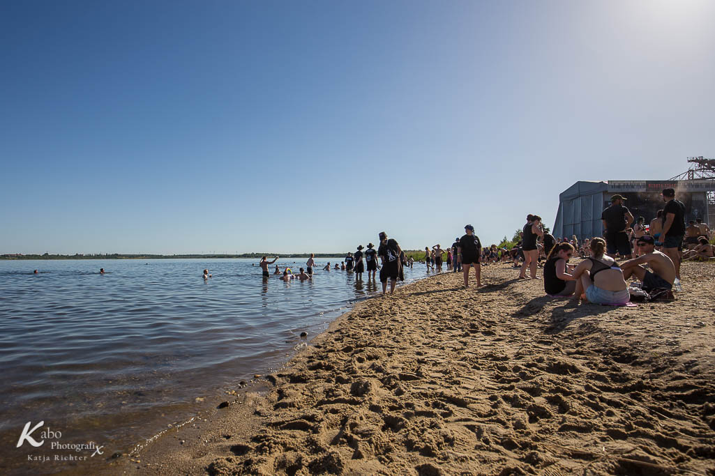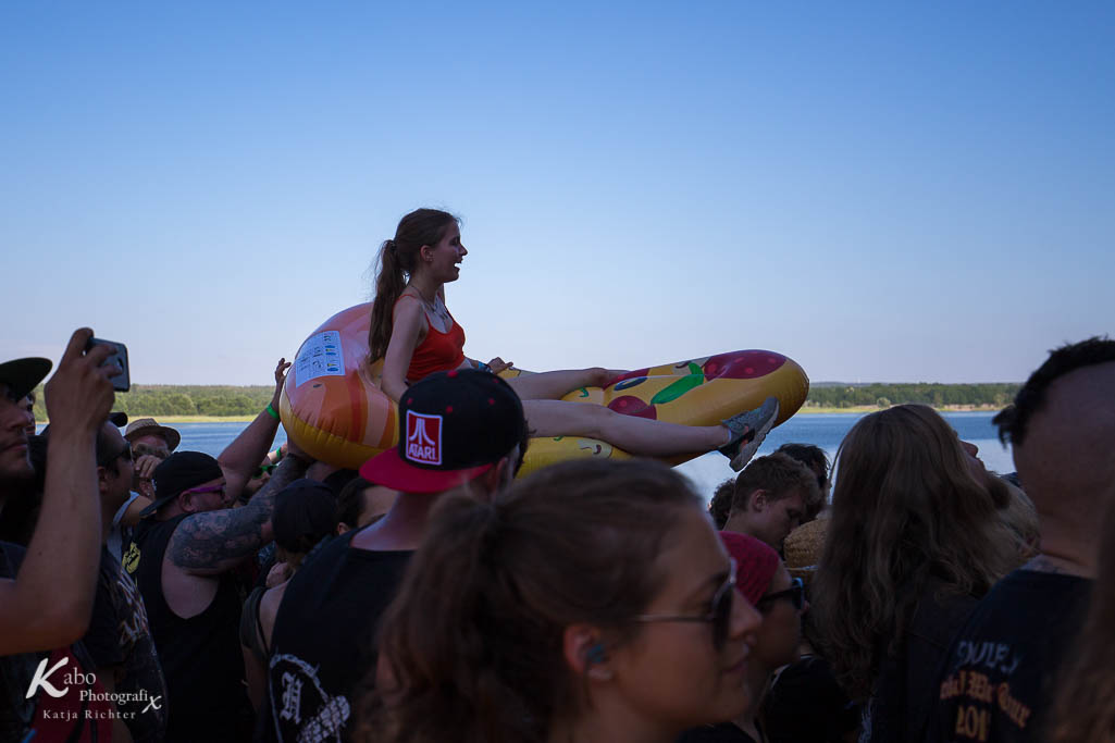Für das leibliche Wohl sorgten wieder verschiedene Anbieter auf der Getränke- und Fressmeile. Kulinarisch kam so gut wie jeder auf seine Kosten, ob vegan oder deftig Fleisch, und natürlich war auch in diesem Jahr wieder die allseits beliebte Erdbeerbowle am Start. Die kurzen Laufwege auf dem Festivalgelände an sich und die logistisch gut aufgestellten Bühnen waren ebenfalls ein Genuss. Vor allem die Strandbühne, welche man bequem vom Wasser aus betrachten konnte, bot Sommer-Festival-Stimmung vom Feinsten. Die Stimmung auf dem Campingplatz war auch in diesem Jahr wieder gewohnt durchgeknallt und durchgehend laut, mit Musik aus allen Genres und Sphären und Partywilligen aus den verschiedensten Ländern - für dieses gediegen abgedrehte Publikum lieben wir das Full Force!
