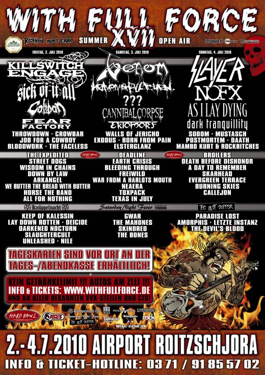 Sachen gepackt, ins Auto gesetzt und voller Vorfreude auf nach Roitzschjora … Ich sag nur: Und jährlich grüßt das Murmeltier. Diesmal möchte ich mich an dieser Stelle nicht allzu ausführlich über Anreisemodalitäten und Vorfreude aufs WFF äußern, da ich das die vergangenen Jahre schon erschöpfend genug getan habe. Also ziehe ich mein Fazit ausnahmsweise schon am Anfang und sage, dass das With Full Force 2010 eines meiner besten Festivals überhaupt war. In einigen Internetforen wurde im Nachhinein eine gewisse Kritik am Line up geäußert, meint u. a., dass keine adäquaten Headliner/Bands gebucht waren. Im Vorfeld hätte ich mich dieser Meinung vielleicht sogar angeschlossen, jetzt aber denke ich, dass mit Killswitch Engage, Caliban, Cannibal Corpse, Heaven Shall Burn, As I Lay Dying, NOFX und Slayer mehr als genug hochkarätige Bands am Start waren. Ich hatte jedenfalls während des gesamten Festivalwochenendes keinen Moment Langeweile. Wenn grad mal keine Musik nach meinem Geschmack gespielt wurde, haben wir eben gegrillt, Bierchen getrunken, waren Baden oder haben bei tropischen Temperaturen nach Schatten gesucht. Dass für mich das Force dieses Jahr so brillant wurde, hat neben geiler Mukke zum Abreagieren allerdings auch viel mit meinen Mitreisenden zu tun. Auf Mrs. S.H. ist bei jedem gemeinsamen WFF ohne viel Überzeugungsarbeit Verlass auf gemeinschaftliches Massensurfen. Und mit Mr. D.K. kann man einfach am besten entspannt feiern und trinken und grillen und chillen und abgehen. Außerdem beschützt er mich im Mob vor allzu harten Schlägen und ist gleichzeitig perfektes Sprungbrett. Mr. M. hat durch seinen fast jugendlichen Leichtsinn viel zur allgemeinen Erheiterung beigetragen und durch sein Durchhaltevermögen in allen möglichen Belangen mit und für uns eine sehr geile Party gefeiert. Bei Mr. T. wusste man immer nicht so genau, ob sein euphorischer Blick dem Alk oder den Marathon ähnlichen Laufeinlagen beim Circle Pit geschuldet war. Das With Full Force ist einfach jedes Jahr wieder eine perfekte Feier und 2010 war sie sogar noch etwas perfekter als die Jahre zuvor. Aber nun genug der Schwärmerei und ab zu den Bands!