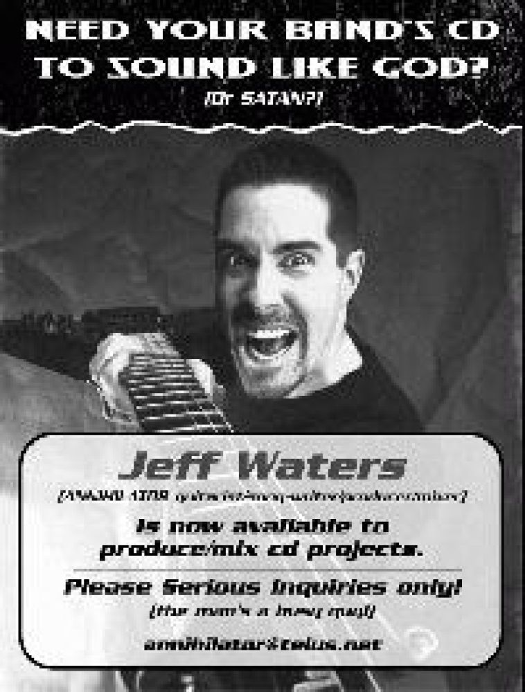 Nicht nur, dass er jedes Jahr pünktlich ein bemerkenswertes Werk in Form einer neuen CD abliefert, seit kurzem ist er auch noch als Produzent und Mixer tätig und wirbt schon mal fleißig mit solchen Sprüchen, wie "NEED YOUR BAND’S CD TO SOUND LIKE GOD? (or Satan?) – Jeff Waters (Annihilator guitarist/song-writer/producer/mixer) is now available to produce/mix cd projects. Please Serious Inquiries Only! (the man’s a busy guy!)" für sein neues Studio. Deswegen lebt der gute 2m Mann auch bescheiden und investiert sein schwer verdientes Geld lieber in sein modernes und teures Equipment. "Acht Jahre habe ich übrigens nun schon mein eigenes Reich, und über die Jahre habe ich da wirklich schon eine Menge Geld reingesteckt," klingt es hörbar gut gelaunt aus dem Telefonhö¶rer. "Mittlerweile nehmen immer mehr Leute bei mir auf, also ich produziere sie oder widme mich dort einigen anderen Projekten. Was aber neue Gitarren und andere Instrumente angeht, bin ich momentan dank der Endorsement-Verträge ganz gut bedient. Das meiste Geld, was ich so in die Musik investiere, geht hauptsächlich für Annihilator drauf, oder ich verwende es für mein Aufnahmestudio." Aber auch sonst bleibt ihm kaum Zeit zum Atmen. "Wenn ich nicht gerade Songs schreibe und aufnehme - denn Riffs gibt’s ‘ne Menge im Hinterkopf - bin ich mit dem Organisieren beschäftigt. Ich schreibe zwar nicht acht Stunden am Stück Riffs, vielleicht zwei, drei Tage in der Woche. Wenn nun aber die Zeit für ein neues Album gekommen ist, habe ich dann gleich immer einen ganzen Sack voll Riffs zusammen. Es gibt auch auch viel zu tun, um eine Tour als Beispiel zu organisieren. Ich übernehme zwar nicht die Arbeit eines Tourmanager oder ähnliches, aber alleine die Band zusammenzubringen, zu proben, Flüge zu buchen und das Studio herzurichten, damit noch andere hier aufnehmen können, nimmt schon verdammt viel Zeit in Anspruch. Ich könnte alleine acht Stunden, ohne irgendeine Musik zu machen, für diverse Arbeiten rund um die Band verbringen. Alleine das Beantworten von 65 E-Mail-Interviews nimmt schon eine lange lange Zeit ein! Man kann sich sicher vorstellen, wieviel Wochen das einem in Beschlag nimmt - es ist halt ein Full-Time-Job!!" Die neue CD Waking The Fury ist seit einigen Monaten erhältlich und obwohl Herr Waters für mich eindeutig wieder hervorragende Arbeit abgeliefert hat, gibt es dennoch verschiedene Meinungen zur neuen Scheibe. "Es gibt eine Sache, an der sich die Geister scheiden, denn es ist auch die erste CD, bei der ich mir überlegt habe, endlich mal einen anderen Gitarrensound zu verwenden. Es herrschte zwar bisher immer ein wunderbarer, großartiger und druckvoller Sound auf den vergangenen Alben, aber ich habe halt immer das gleiche gemacht; immer auf die selbe Art und Weise aufgenommen. Diesmal aber, habe ich mir mal keine Sorgen über den Klang gemacht. Mir war es egal, ob nun der Sound am Ende gut oder schlecht klingt - hauptsache anders!! Ich hab dann hier und da mal ein bißchen rumprobiert und plötzlich war ich mir sicher, dass ich den richtigen Sound gefunden hatte! Das Interessante daran ist, dass ich jetzt das erste mal zwei verschiedene extreme Meinungen wahrnehme. Die einen rufen euphorisch und loben: Hey...das ist der beste Sound bisher, er ist super druckvoll, aggressiv und verzerrt!! Wobei andere wiederum sagen: woo...ey...wir hassen den neuen Gitarren-Sound, klingt ja schrecklich!! Aber allgemein gesehen ist es doch ne coole Sache, die Leute reden darüber! Ich finde, der Klang der neuen Scheibe ist echt super gelungen. Denn gleich vom ersten Lied an, wird deine Aufmerksamkeit völlig auf die CD gerichtet und zwingt dich zu einer Entscheidung." Auf den ersten Höreindruck zu urteilen, klingt Waking The Fury sogar teilweise sehr industrial-like. "Ja, genau...du hast recht, es war zwar nicht beabsichtigt," klärt Jeff auf, "aber als ich meine Gitarre an das neue Teil, namens "Line 6 Part Pro", von meinem Studio Equipment anschließ und gleich darauf einige Slayer Stücke spielte, um mir mal einen Eindruck vom Sound zu machen, dachte ich sofort: das klingt cool, das muß ich nehmen! Eigentlich ist es eins der vielen neuen Elemente, die im Amplifier enthalten sind, und davon gibt es wirklich eine Menge. Lustigerweise hab ich‘s bisher auch nie benutzt, bis zu just diesem Tag, als ich mein Gitarrenkabel in die Buchse einstöpselte! Und das war’s dann!! Plötzlich kamen verzerrte Klänge aus meinen Lautsprechern und als ich dann die besagten Slayer-Riffs spielte, schrie ich nur: whoou...this is cool!! Diese Entscheidung hat nur ganze zwei Minuten gedauert!!! Das witzige daran ist, dass das Teil einige gute Sounds macht und davon hab ich mir sogar noch eins der schlechteren ausgesucht!! Haha!!" Ganz im Gegensatz zur schnellen Entscheidung des Sounds, war es um so schwieriger, sich ein entsprechendes Cover auszudenken. "Das Cover und sogar der Titel der neuen Scheibe waren zwei Sachen, bei denen ich enorme Probleme hatte. Ich hatte irgendwie 'n Brett vorm Kopf - mir fiel einfach nichts passendes auf die Schnelle ein. Joe und ich haben uns dann schnell die einzelnen Texte des Albums angeschaut, und ein Song namens Striker beginnt mit den Worten "Waking The Fury" und sofort waren wir uns einig, dass das ein sehr guter Titel sei! "Fury" paßt auch sehr gut, denn die CD klingt böser und aggressiver, als all‘ die bisherigen - deswegen ist "Waking The Fury" nahezu perfekt! Die Entscheidung hat aber auch nur ca. 10 Sekunden gedauert!! Beim Cover hingegen, konnten wir an gar nichts denken! Ich sprach dann mit der Plattenfirma, sie sollen mal einige Bandfotos, die wir zu Promotionszwecken gemacht haben, rausrücken. Zuhause habe ich dann mit meinem Computer eine Szene, ein dunkles, dreckiges Bild aus einem Annihilator Video aus dem Jahre 1996 ("Syn. Kill 1" vom Album "Refresh The Demon"), in den Hintergrund gesetzt. Ich hab’s dann gleich der Plattenfirma per E-mail zugeschickt und mir nur geda