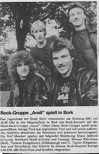 Ich kann mich erinnern, dass der Werner Kleinhans mich dann später in die Band geholt hat. Da war ich wohl so 20 Jahre. Ich hatte vorher auch eine andere Band namens SHIFT IN. Das war so eine Deutschrock-Punk Band, was damals auch ein bisschen angesagt war. Wir wollten ein Festival organisieren und da wollten wir ANVIL fragen, da die damals schon etwas größer waren. Ich hatte die mal im Jugendzentrum Lünen-Süd gesehen und da hatten die einen Amboss hinterm Schlagzeug stehen, so einen richtigen Ballermann aus Holz. Die hatten auch eine eigene PA und alles. Das war richtig geil und wir fanden, dass das eine heiße und erfolgreiche Band sei. In Wirklichkeit waren da aber nur Leute drin, die auch am Arbeiten waren. Der Werner Kleinhans hat damals als Arbeiter gearbeitet und auch richtig Asche verdient und die anderen aus der Band hatten auch alle Geld, welches sie dann in das Hobby ANVIL steckten. Deshalb waren die super aufgestellt. Zu dem Zeitpunkt als ich wegen des Festivals angefragt habe, hatten die wohl gerade Probleme mit dem Sänger und da hat der Werner mich gefragt, ob ich nicht Bock hätte, da mal so ein bisschen rumzusingen. Und das hab ich dann gemacht und Werner fand das irgendwie auch cool. Das war dann für mich eine peinliche Situation, weil ja mein Kumpel aus meiner Band auch dabei war. Da hab ich also erstmal abgesagt. Wir haben dann erstmal das Festival mit der Band gespielt und im Laufe der Zeit hat sich aber immer mehr gezeigt, dass man Kumpel da gar kein Problem mit hatte. Für ihn war das mehr ein Hobby und ich hatte schon etwas mehr Ambitionen. Dann bin ich also schließlich doch mit relativ jungen Jahren bei ANVIL in Lünen eingestiegen.