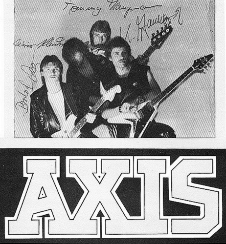 Da Drucksachen damals ja sehr teuer waren, wollten wir uns einen Namen suchen, der möglichst wenig Buchstaben hatte. ANVIL war schön kurz und den Namen konnte man auch quer drucken, so dass die Buchstaben größer waren und man den Namen gut lesen konnte. Wir hatten dann tausend Namen und kamen schließlich auf AXIS. Das war ein Wortspiel aus AXIS, der Achse, um die sich alles dreht, und Axes, den Äxten. Außerdem klang es schön metallisch, man konnte es sich gut merken und es passte gut aufs Plakat.