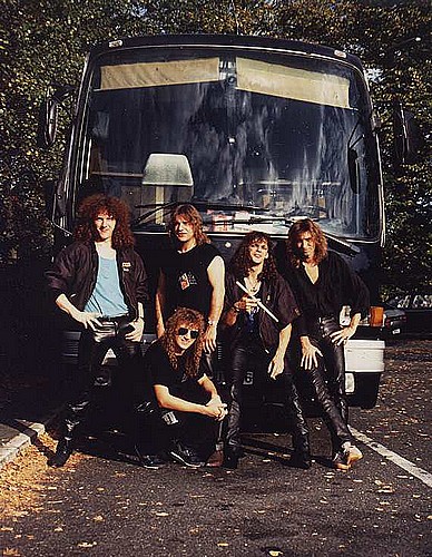 Wir haben dann auch immer wieder versucht einen Plattenvertrag zu bekommen und haben immer wieder an Plattenfirmen geschrieben, aber da war nichts zu holen, da war tote Hose. Vor allem mit dieser Art von Metal. . . Werner kam ja aus der Boogie-Zeit und von daher spielten wir so eine Art Boogie-Metal. Deshalb hat „Kingdom of the Night“ auch diesen Rhythmus. . . Bernhard macht sehr überzeugend einen Rhythmus nach. . . das kommt alles aus der Zeit, weil Werner Kleinhans so auf diese Beats stand. Der war ja Kind der Boogie und Beat Welle und ist mit ganz anderen Leuten groß geworden. Der hat ja noch Elvis gehört. Ich war ja damals 18 und er war schon über 30. Das waren alles alte Säcke in der Band und ich war damals ganz, ganz jung. Daher hab ich auch immer schön den Ball flach gehalten, weil ich ja auch gar keine Ahnung hatte und ich war dankbar wenn wir mal gespielt haben. Ich erinnere mich, dass wir sogar mal auf einem METAL HAMMER Festival gespielt haben in der Ludwigsburger Rockfabrik. Da war auch eine andere Band, da werde ich nie vergessen, mit Patronengurten und Lockenköpfen und die waren völlig enttäuscht, dass sie es nicht auf Platz 1 geschafft hatten. Diese Band hieß DESTRUCTION. Das war damals echt lustig. Mit denen zusammen haben wir dann da auf der Bühne gestanden und in der Jury saß u.a. BONFIRE. Die hatten ja damals mit „Sweet Obsession“ einen Megahit und die haben richtig abgeräumt. Das war schon eine tolle Sache, vor allem wenn man daran denkt, dass wir Jahre später mit denen Auge in Auge auf derselben Bühne standen. Es ist eine schöne Erfahrung zu sehen, dass alle auch nur mit Wasser kochen und man sich dann mit den ganzen Stars von damals auch anfreunden kann. DORO habe ich damals noch mit WARLOCK gesehen und das war für mich sagenhaft geile Mucke. Später haben wir dann in Solingen auch ACCEPT gesehen, als die gerade „Breaker“ veröffentlich hatten.