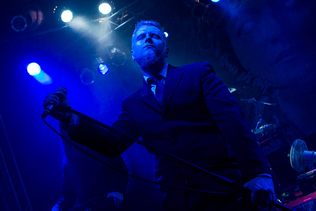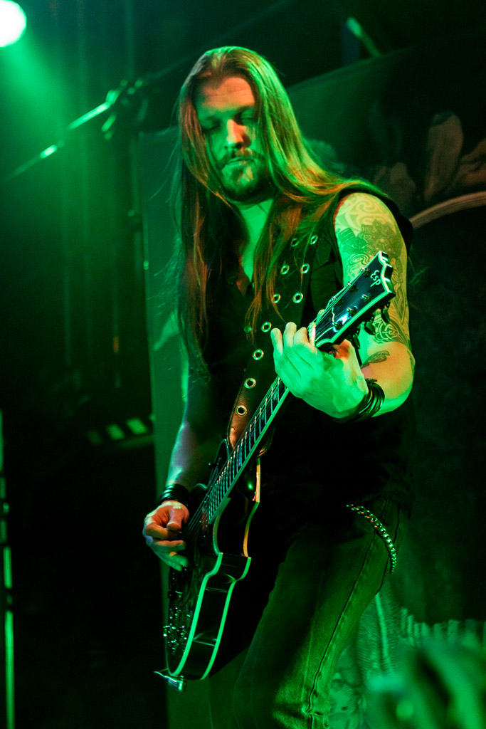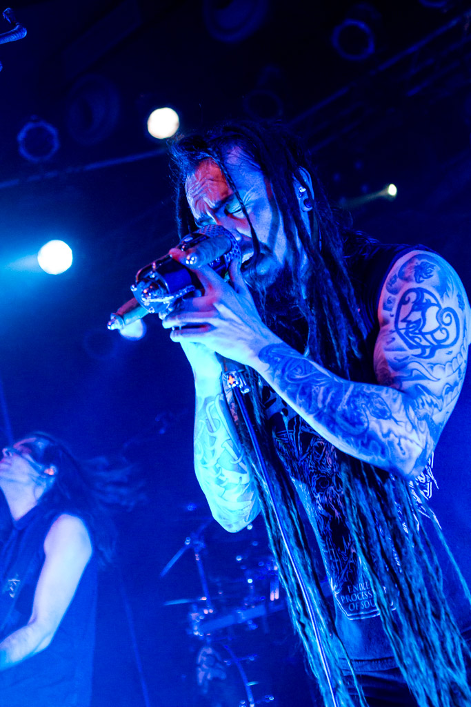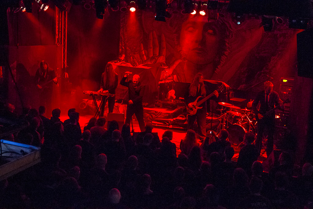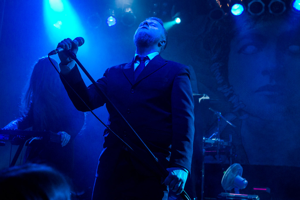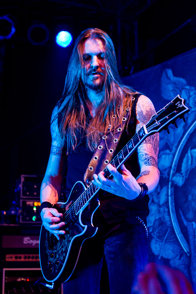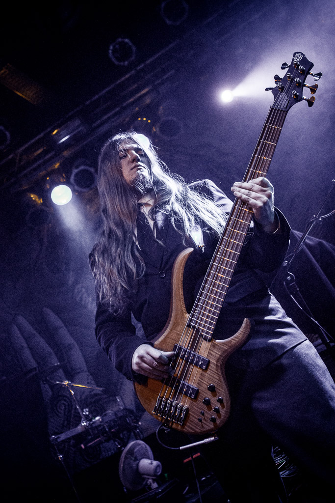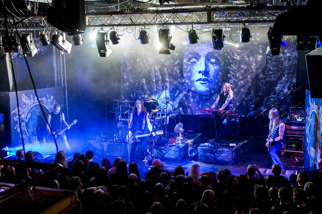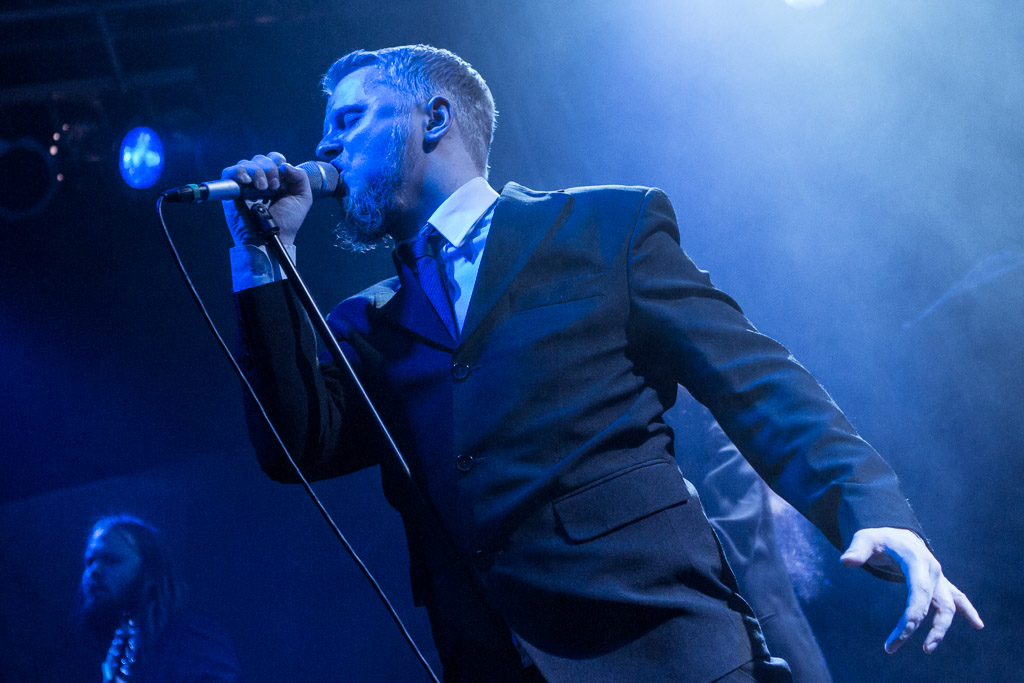 Bereits ordentlich gefüllt ist der Saal, als die Dänen ihr Spektakel pünktlich zur Tagesschau beginnen. Hamferd präsentieren ihr aktuelles Album „Evst". Musikalisch bieten sie klassischen, schwermütigen Doom Metal, der durchaus als eine etwas epischere Version der jüngeren Saturnus durchgeht. Die Songs – textlich in der Heimatsprache gehalten – werden von den sechs Musikern, die stilvoll in feinem Zwirn bzw. Anzügen auf der Bühne stehen, geradezu feierlich zelebriert. Das Stageacting ist erwartungsgemäß zurückhaltend, was nicht nur am begrenzten Raum durch die bereits aufgebaute Amorphis-Backline liegt, dafür setzt man die langen Doom-Epen durch dezente aber wirkungsvolle Licht-Effekte und typische Gesten ganz gut in Szene. Die tiefen Growls von Sänger Jón sind dabei so wundervoll erdig, wie der kehlige Klargesang gewöhnungsbedürftig ist. Trotzdem kommen Hamferd gut an und sind mit Sicherheit ein Hoffnungsträger für Doom-Jünger. Zwar kann man den Genre-Größen noch kein Wasser abgraben aber die Band bietet ein solides, stimmiges Programm, das den Abend durchaus bereichert...