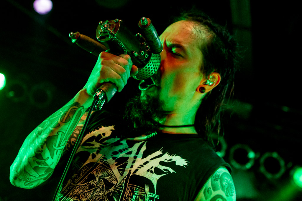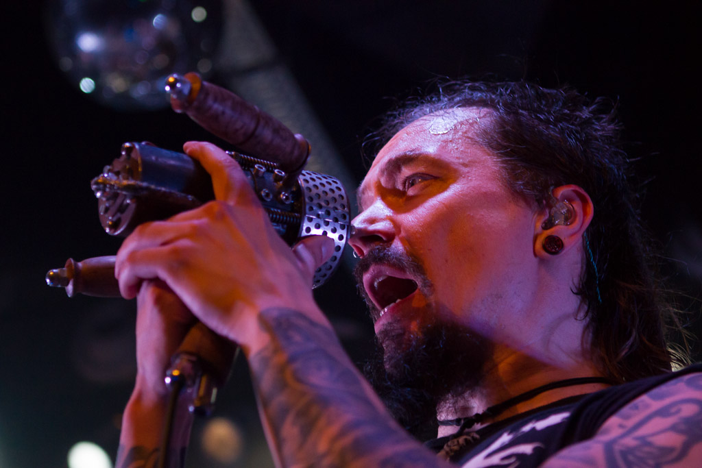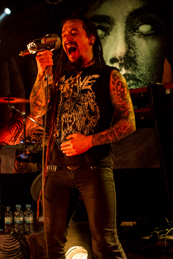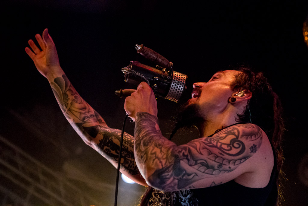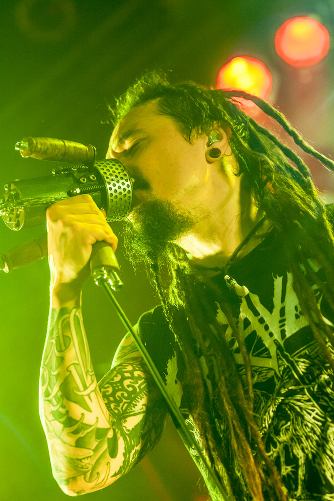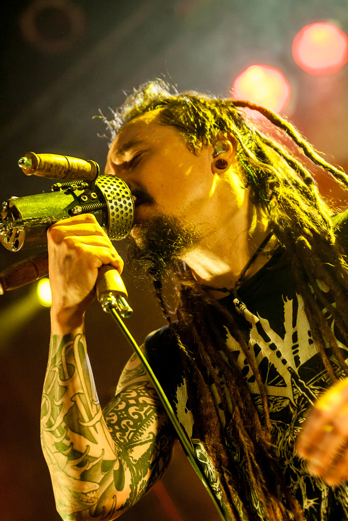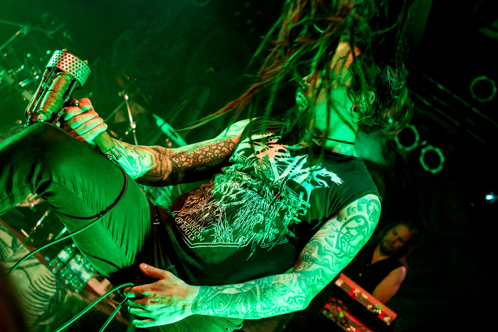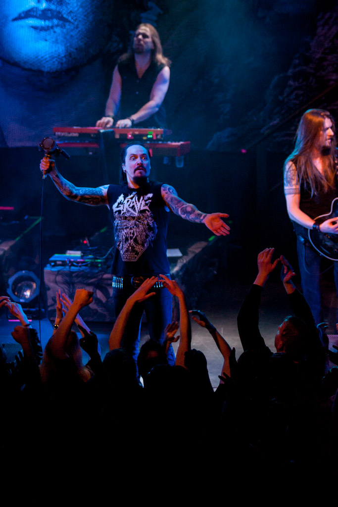...und ein dankbares, vor allem aber hungriges AMORPHIS-Publikum perfekt angeheizt hat. Nach kurzer Umbaupause werden die Finnen um den Freund der futuristisch-archaischen Mikrofone frenetisch empfangen. Mit „Shades Of Gray" steigt man ein und ab dem folgenden „Narrow Path" steht ein rappelvolles Musikzentrum bereits auf dem Kopf. Was soll man zu Amorphis noch groß sagen. Glücklicherweise – und das beweist die heutige Show eindrucksvoll – befinden sich die Herren immer (noch) auf dem Zenit ihres Schaffens. Abnutzungserscheinungen? Fehlanzeige! Kaum eine andere Band schafft es so harmonisch, innerhalb eines Sets zwischen beinharten Death Metal, Progressive Rock/Metal, Gothic Metal, Folk und Doom Metal zu wechseln. Der Fokus liegt zwar deutlich auf dem aktuellen Album, von dem mir leider einmal mehr „Enchanted By The Moon" fehlt, trotzdem geizen Amorphis nicht mit Hits und der einen oder anderen Überraschung: „Into Hiding" inklusive voll ausgespieltem „Tales From The Thousand Lakes"-Intro und „Sign From The North Side" vom „Karelian Isthmus"-Debut gehören freilich dazu. Noch mehr zur Sache geht's beim „Vulgar Necrolatry"-Cover der „Privilige Of Evil"-EP, bei dem Tomi klarstellen kann, wieso er heute im Grave-Shirt aufgelaufen ist. Mit „Skyforger", dem zu erwartenden „Black Winter Day" und „House Of Sleep" als Zugabenblock schickt man schließlich eine Fanschar heimwärts, die ihre Idole eigentlich gar nimmer von der Bühne entlassen möchte. Geadelt von den Klängen der Elekelaiset-Interpretation von „House Of Sleep" geht ein rundum gelungener Abend zu Ende. Schön war´s und wenn es am Schönsten ist, dann soll man ja bekanntlich gehen.