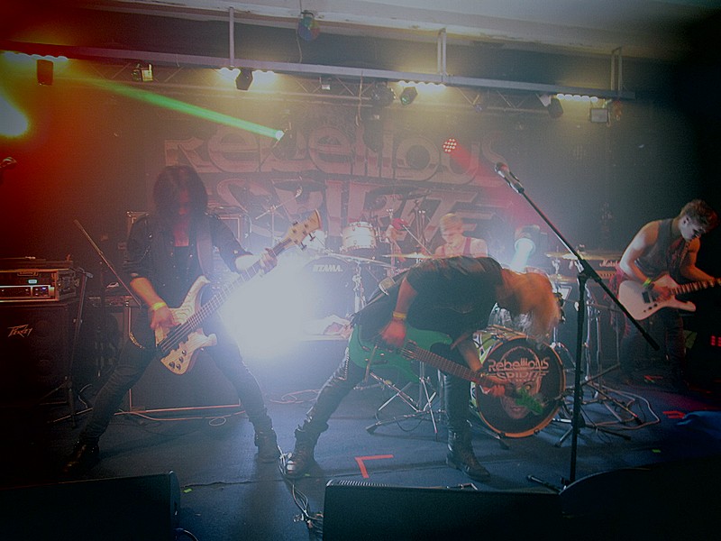 Als wir gegen 20 Uhr die ehemalige Scheune und heutige Konzerthalle betraten, mühte sich bereits eine erste Vorband ab. Leider habe ich nicht mitbekommen um wen es sich dabei gehandelt hat – vielleicht um die Lokalmatadore der Gemeinde Ilsede. Danach wurde umgebaut und wenn die Anzahl gestimmt hätte, hätten wir die nachfolgende Band wohl für die Sieben Zwerge gehalten. Doch da es nur fünf Personen waren, musste es sich wohl um die süddeutschen Jungrocker von REBELLIOUS SPIRIT handeln, die jüngst ihr zweites Album „Obsession“ über Steamhammer/Spv veröffentlicht haben. Der erste Eindruck der Band war nicht schlecht. Mit zunehmender Spieldauer stellte sich jedoch auch auf der Bühne das Problem ein, welches ich bereits mit den beiden Studioalben hatte: richtig zwingende Hooklines fehlen. Zudem hat sich die Band noch nicht so richtig entschlossen in welche musikalische Richtung sie denn eigentlich gehen wollen. Optisch sind sie wohl doch eher der Moderne verpflichtet. Musikalisch wird allenthalben ihr Glam Metal Einfluss unterstrichen. Doch eigentlich wildern sie doch meist eher im melodischen Metal Bereich. Sänger Jannik erinnert dabei stimmlich – und auch in Sachen Bühnenpräsenz – verschiedentlich an Hannes Braun der schwäbischen Landsleute von KISSIN‘ DYNAMITE. Überhaupt kamen bei mir Erinnerungen an die ebenfalls sehr jung gestarteten Schwaben auf. Allerdings hatten KISSIN‘ DYNAMITE immer ein besseres Händchen für eingängige Melodien. Wie auch immer, REBELLIOUS SPIRIT mühten sich redlich die überschaubare Fangemeinde anzuheizen und vor die Bühne zu locken. Vor allem Frontmann Jannik machte dabei einen guten Job. Unterm Strich hinterließen die Schwaben einen ordentlichen Eindruck, auf dem Weg zur metallischen Oberliga haben sie jedoch noch ein paar Meter vor sich.