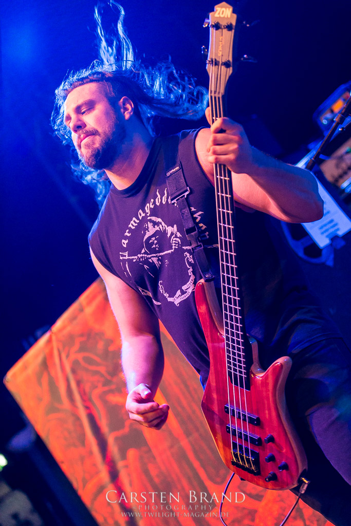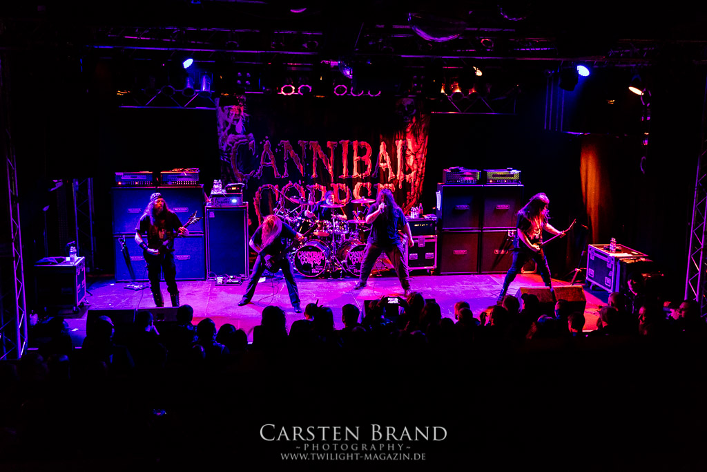 Dann wird es dunkel und Zeit für den Headlinerdes Abends. Spielten die Vorband unter sehr guten Lichtverhältnissen, bleibt die Bühne bei CANNIBAL CORPSE stilecht recht düster. Ein wenig rote Schummerbeleuchtung unterstützt von ein paar blauen Spitzlichtern müssen ausreichen. Die Herren um Mastermind Fisher knüppeln mit neuem Material nach vorne. "Code of the slashers" eröffnet den Corpse-Reigen an diesem Abend. Dieser, für Corpse´sche Verhätlnisse fast schon ruhige Track, bildet den idealen Einstieg. Das Publikum ist von Sekunde 1 an dabei und zelebriert den Auftritt. Die Todeswalze gewinnt an Fahrt und führt mit "Only one will die" die Neuvorstellung des aktuellen Silberlings "Red before Black" fort. Musikalisch braucht man hier auf wenig Neuland zu hoffen. Aber das tut auch keiner. CANNIBAL CORPSE liefern genau das ab, wofür sie seit Jahren stehen: kompromisslosen Death Metal auf den Punkt gebracht. Die neuen Stücke passen hervorragend ins Schema und zeigen die Vielfältigkeit der Band. Es wirkt zu keiner Zeit so, als hätte man sich irgendwie neu erfinden müssen. "Scourge of Iron" bildet die Brücke zu älterem material. Die Corpser kehren für kurze Zeit zum Midtempo zurück. Allerdings ist diese Verschnaufpause nur als Anlauf zu werten. Mit gewohnte Dampframmen Manier geht es in den zweiten Teil der Setlist, gespickt mit Highlights aus der Discografie. Von "Pounded into dust" über "Devoured by vermin" bis zu "Stripped, raped and strangled" fehlt keiner meiner persönlichen Highlight der Band. Die Todesmaschiene CANNIBAL CORPSE marschier tunaufhörlich durch das Musikzentrum. Klassischer Weise wird die Setlist vom allseits bekannten Hammer Smashed Face abgeschlossen und das Publikum in die Nacht entlassen. Zusammenfassend haben CANNIBAL CORPSE einmal mehr bewiesen, dass sie eine unheimliche Live Macht darstellen und zu Recht an der Spitze der Death Metal Szene stehen. Eine klare Empfehlung an alle, die noch ausstehenden Tourdaten wahrzunehmen!