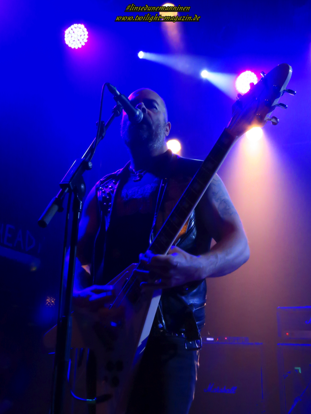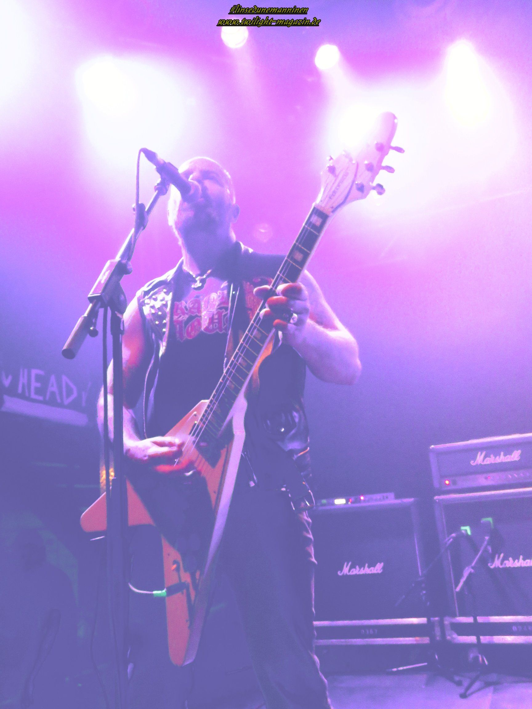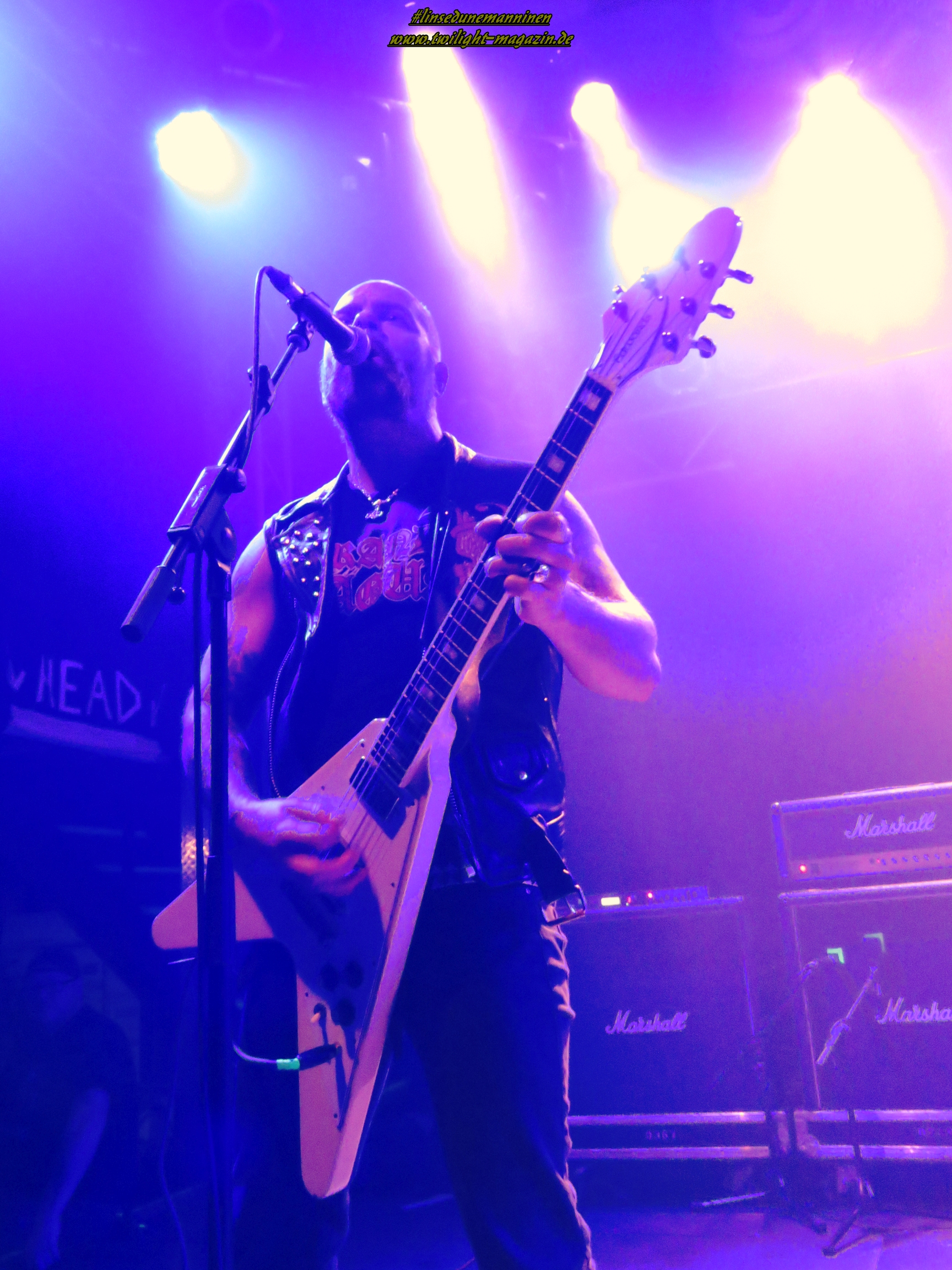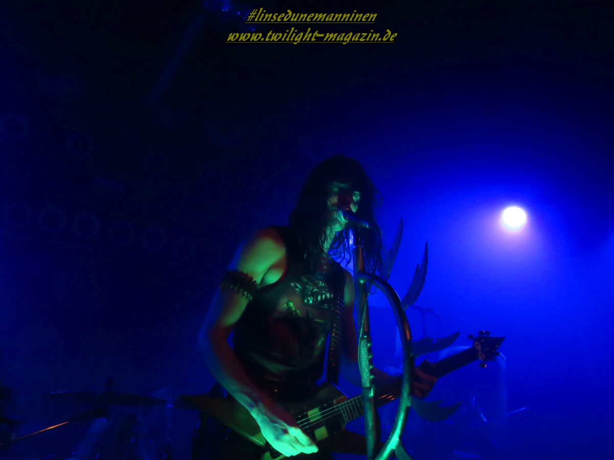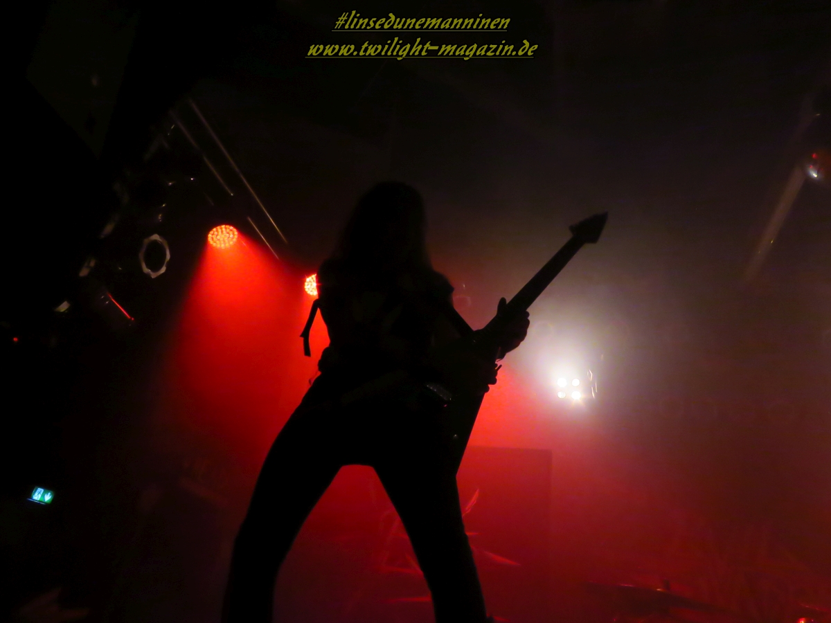 Als Brustlöser fungieren die Australier von ELM STREET, die - ohne dies abwertend zu meinen - wie eine räudige Sentenced-Version ohne Gothic, stattdessen mit klassischen Achtziger - Heavy und Thrash Metal - Einflüssen daher kommt. Das ist stilistisch nicht sonderlich spektakulär aber handwerklich mehr als solide. Trotz den klischeebeladenen Coverbildern auf den Bannern und Aufstellern ist es allerdings äußerst unterhaltsam und spaßig. Hannover taut im Laufe des Sets mehr und mehr auf und weiß die Jungs, die sich performancemäßig auf begrenzter Bühne und mit wenig Licht noch nicht ganz so souverän in Szene zu setzen wissen, nicht erst mit dem, Altmeister Dio gewidmeten, Rausschmeißer "Metal Is The Way" angemessen zu huldigen. EVIL INVADERS wissen den begrenzten Raum und das Licht da schon viel effektiver einzusetzen und legen gleich mal zwei Schippen drauf. Auch die Belgier sind bisher unter meinem Radar hindurch geflogen.