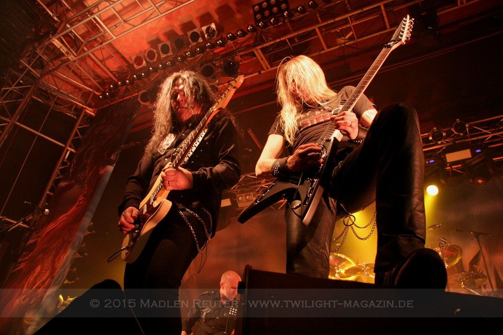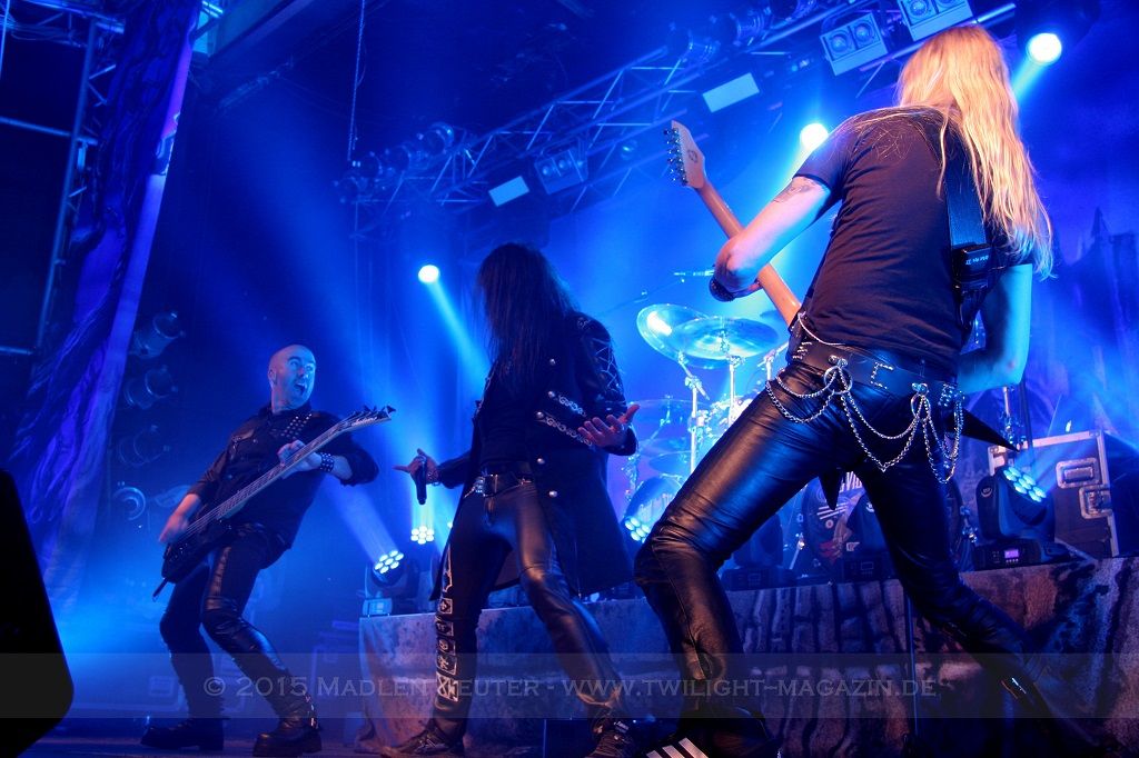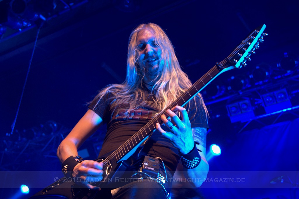 Mit „Hector’s Hymn“ melden sich HAMMERFALL dann zurück und beim Publikum gibt es kein Halten mehr. Vom ersten Akkord an peitschen die Schweden über die Bühne und posieren vor den überglücklichen Fans. Schon zu diesem Zeitpunkt kocht die Halle und die Band und das Publikum schaukeln sich gegenseitig immer höher.