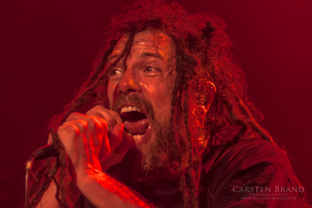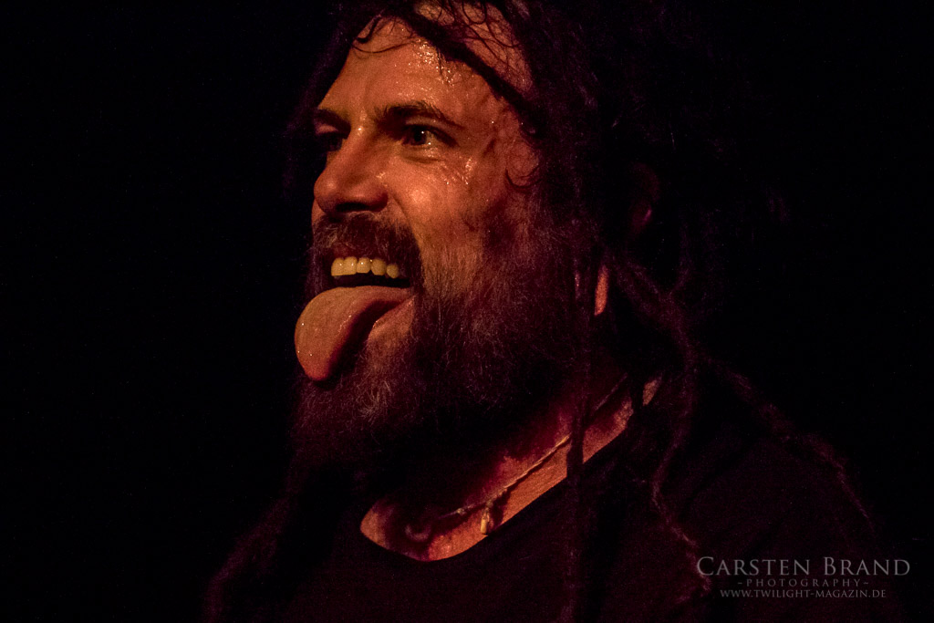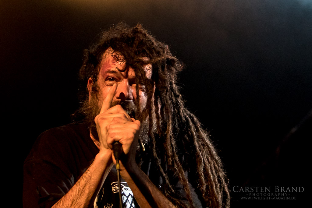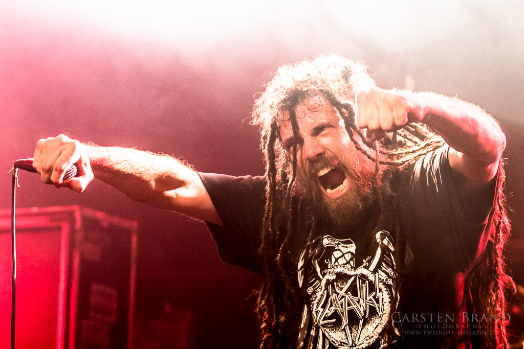 Was kann denn jetzt noch kommen, nachdem drei großartige Bands so hervorragend vorgelegt haben? Eine eigentlich schwere Aufgabe, gäbe es da nicht den werten Herren Barnes. Ohne viel Schnörkel, ohne Nebel und große Lichtshow steht der Frontmann samt seiner Band auf der Bühne und eröffnet mit "Silent Violence" gar nicht mal so leise. Die Markthalle scheint nochmal einen Besucherschub erhalten zu haben, und in den ersten Reihen ist nurn der pure Krieg ausgebrochen. "Revenge of the Zombies" folgt erbarmungslos und lässt keinen Freiraum zum atmen. Der Abend hat hier definitiv seinen Höhepunkt erreicht und SIX FEET UNDER bieten einen mehr als würdigen Headliner. Auch wenn auf Corpse Paint a la HATE und Nebel a la MARDUK verzichtet wird, bietet die Show der Amerikaner durch ihre Reduktion auf die Musik feinste Unterhaltung. Ein neuen Silberling haben SIX FEET UNDER nicht zu bieten, und die Setlist besthet auch eher aus älteren Werken, was der Stimmung aber zu keinen Zeitpunkt einen Abbruch tut. Chris Barnes ist in Höchstform und man sieht der gesamten Band die Spielfreude an. Ein würdiger Abschluss des Hatefest Packages.