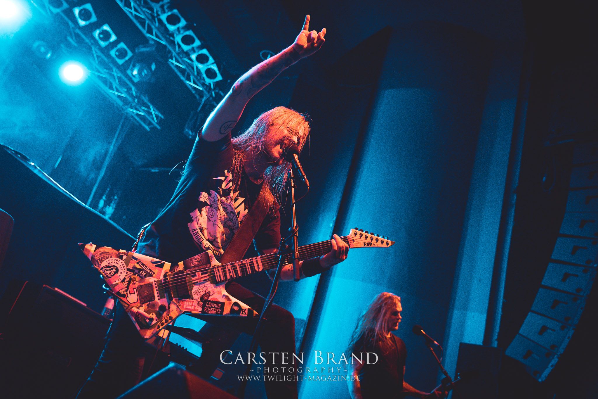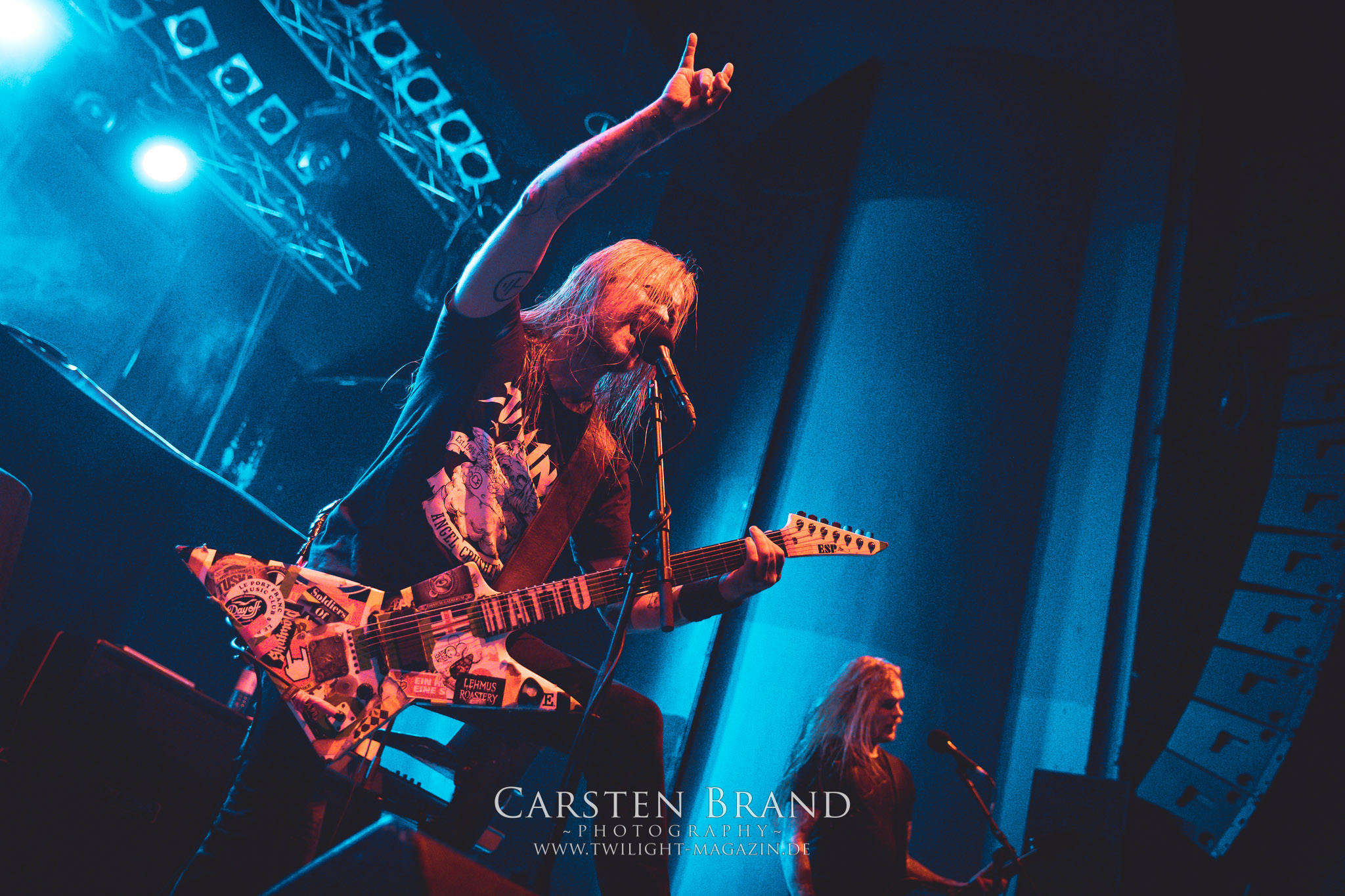 im Gesicht.Jani Liimatainen hat sich inzwischen perfekt ins Bandgeschehen integriert und hat auch die cleanen Gesangsparts von Ville Friman (der ja aufgrund seiner Dozententätigkeit an der Universität von York nicht mehr so viel Zeit zum Touren hat) komplett drauf.