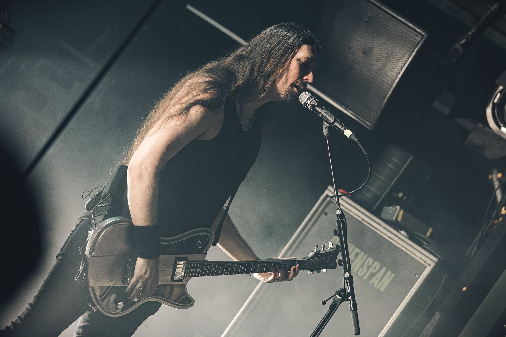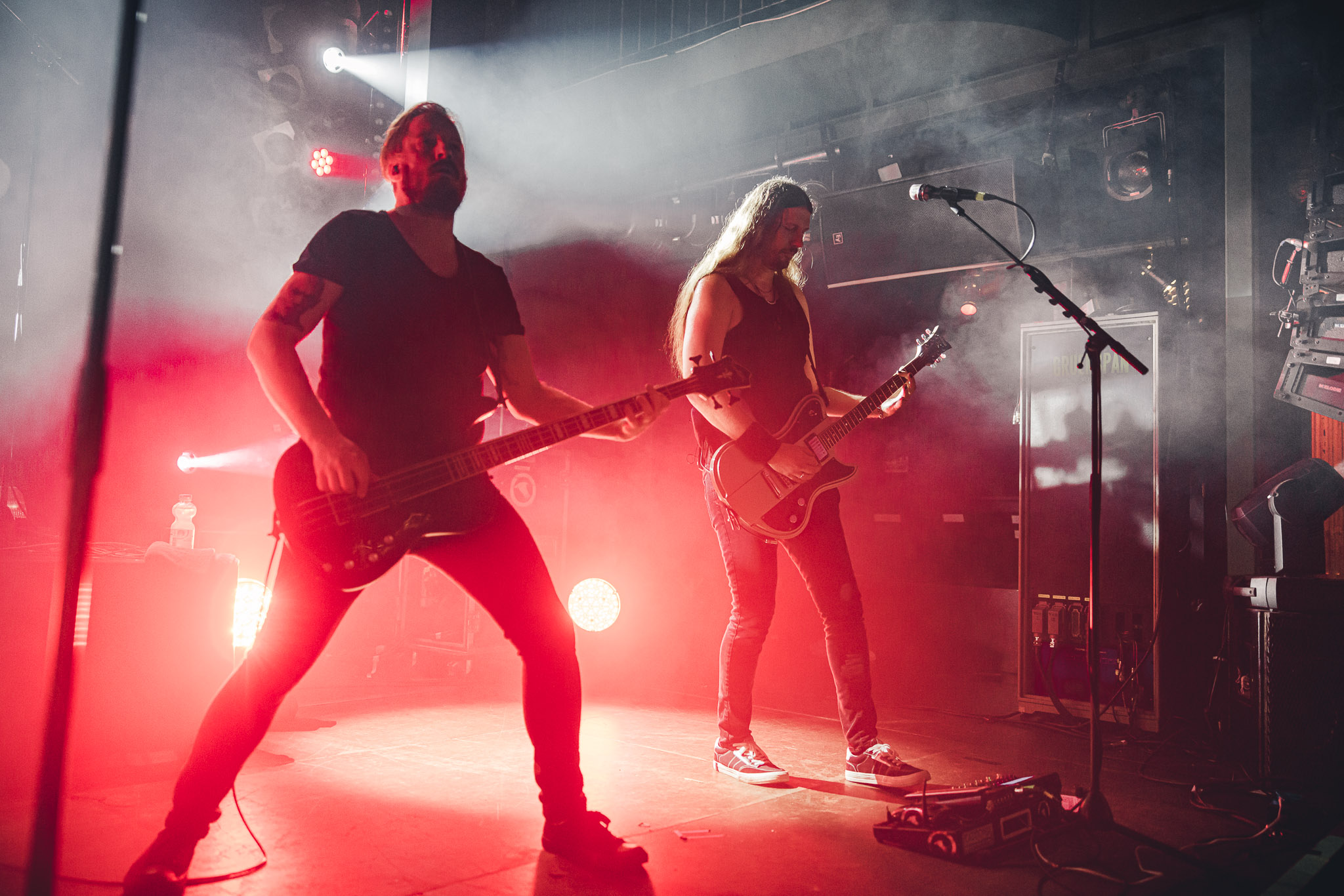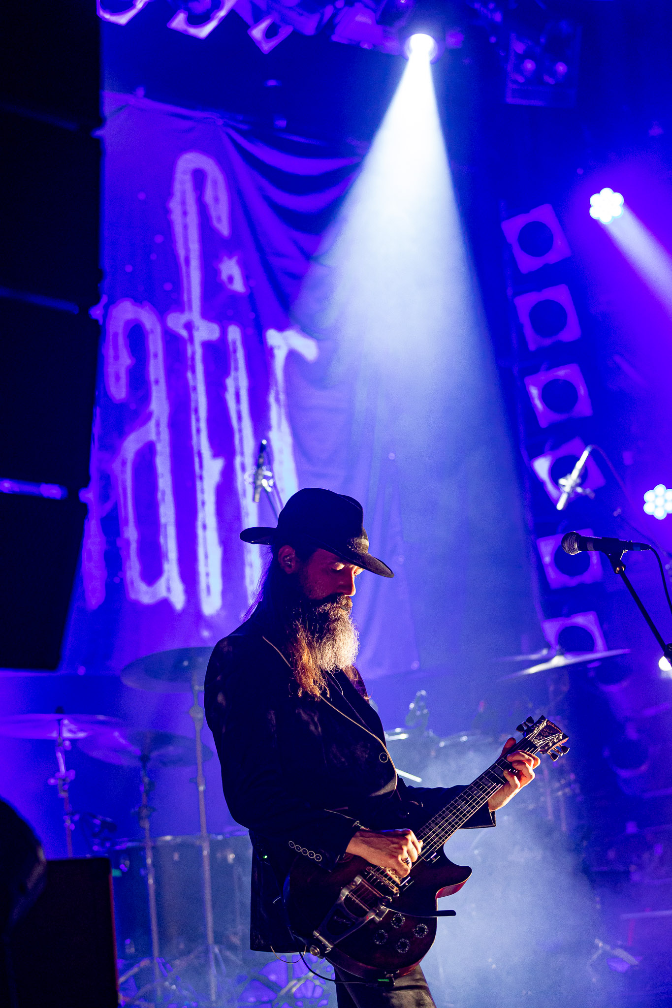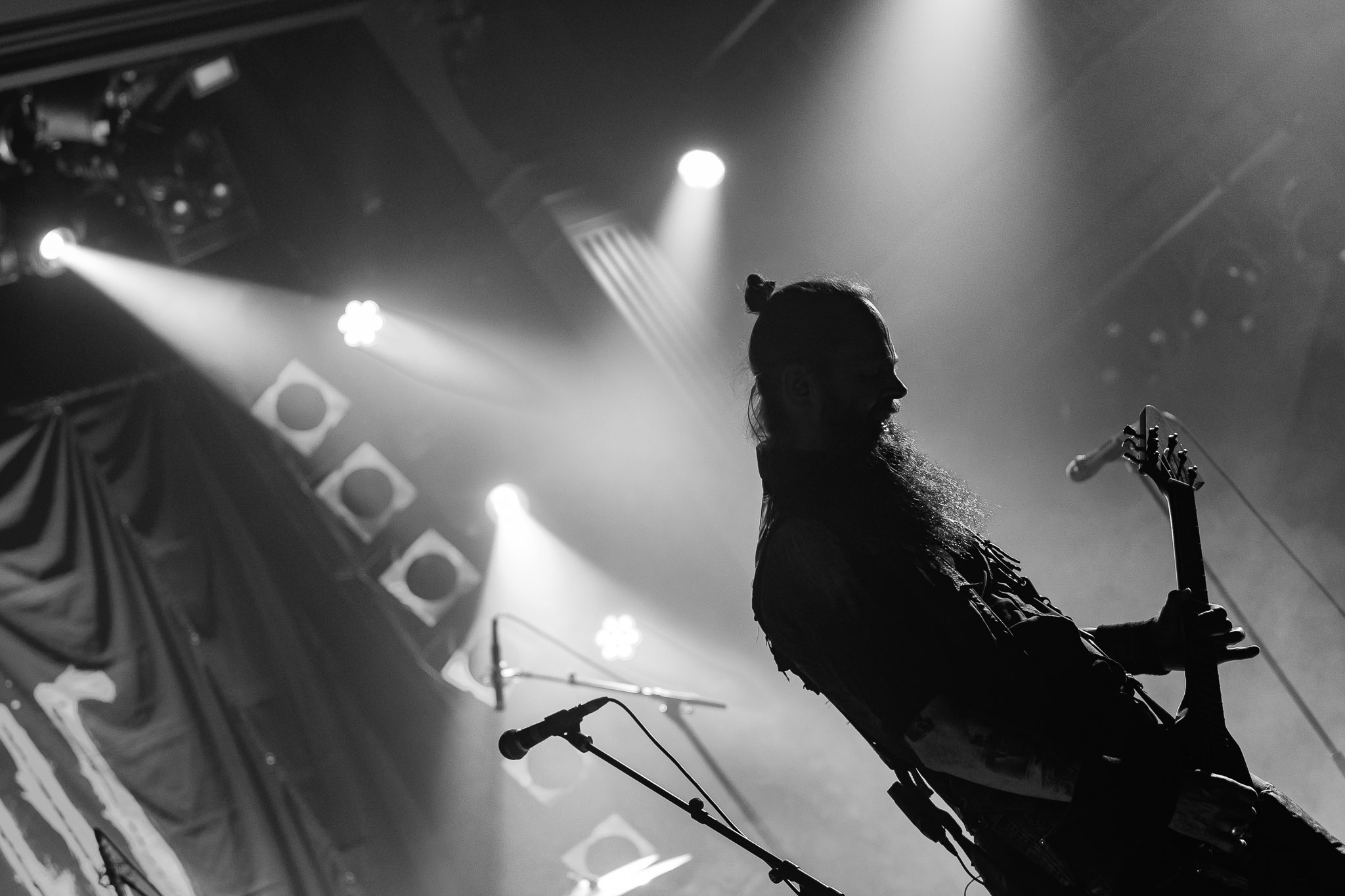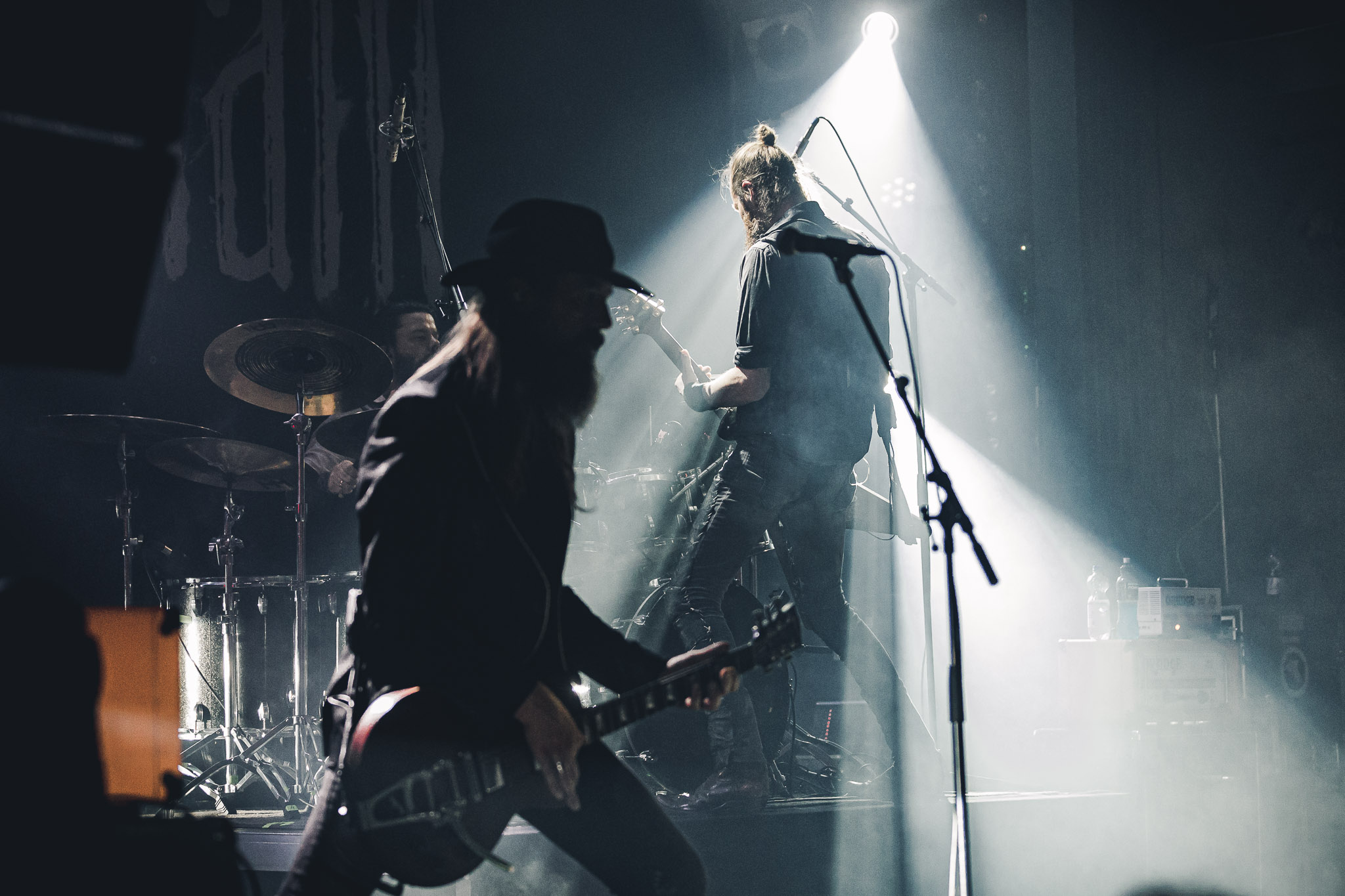 Nach kurzer Umbaupause kündigt das Backtrog die mächtigen Solstafir an. Zudem steht bereits Aðalbjörns Gitarre rechts an der Bühne, „Náttfari wird als Intro gespielt. Die Band braucht keine weitere große Einführung oder Vorstellung. Mit deren Betreten der Bühne beginnt das Publikum mit voller Begeisterung mitzugehen. Charisma und absolute Bühnenpräsenz werden hier lehrfilmmäßig dargeboten. Ich habe die Isländer schon ein paar Mal live erleben dürfen, doch dieser Auftritt sollte die bisherigen Live Darbietungen in den Schatten stellen. Mit „Nattmal“ und „Köld“ geht es hinein in den isländischen Abend. SOLSTAFIR zeigen eindrucksvoll, dass es keiner vieler Worte braucht, um das Publikum zu lenken. Sänger Aðalbjörn schafft es mit einfachen Gesten, das Publikum zur völligen Ruhe zu bringen, als einige Zuschauer in den ruhigen Parts das Schreien anfingen. Ein weiteres Highlight des Abends ist wohl der Geburtstag von Sæþór Maríus Sæþórsson. Mit gewohnt minimalistischer Gestik nimmt er die Glückwünsche des Publikums an.