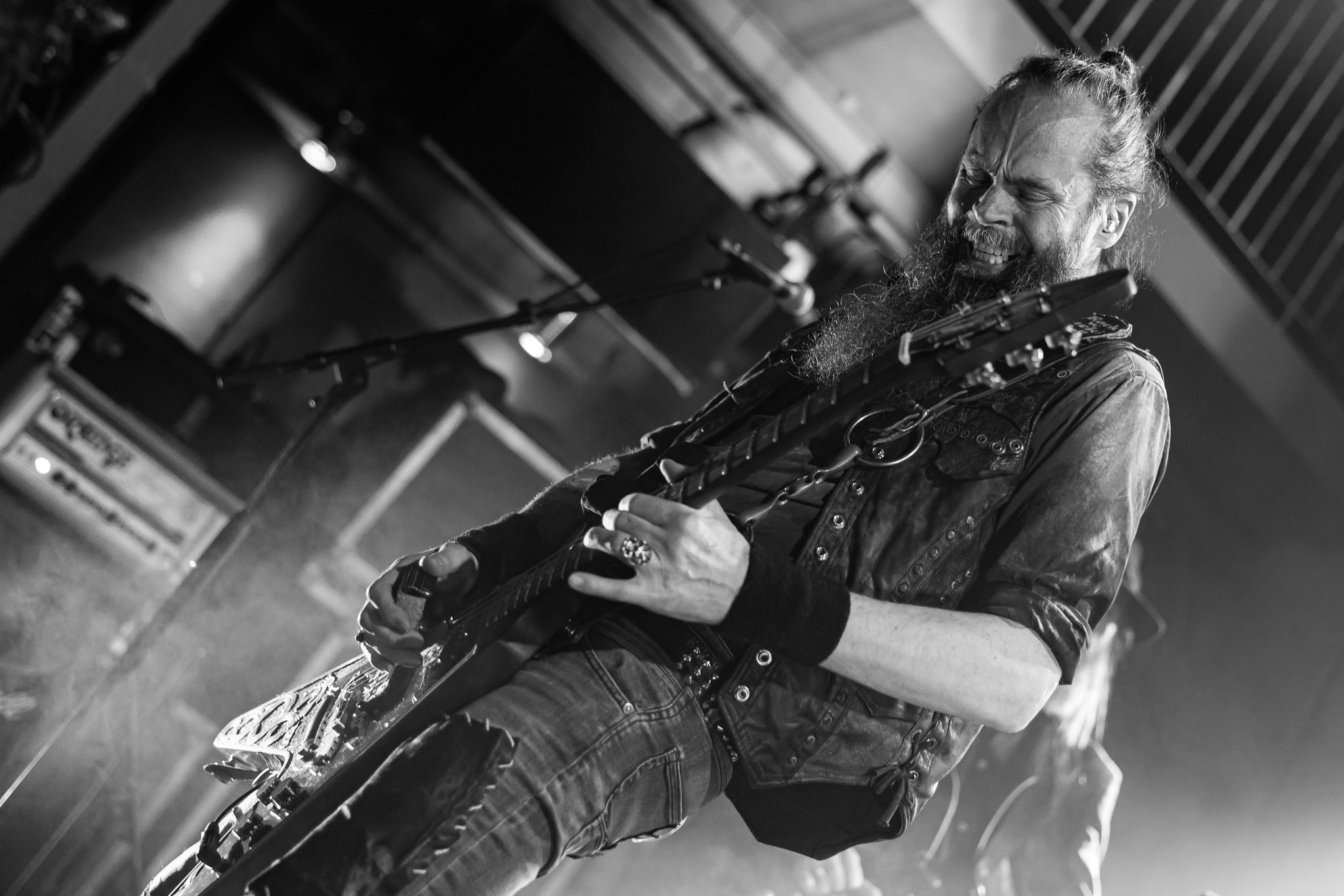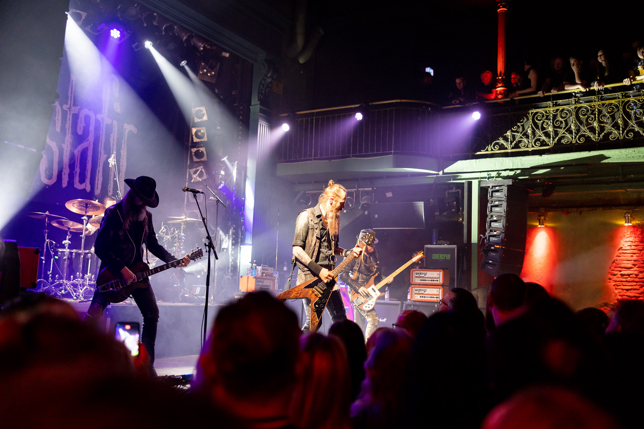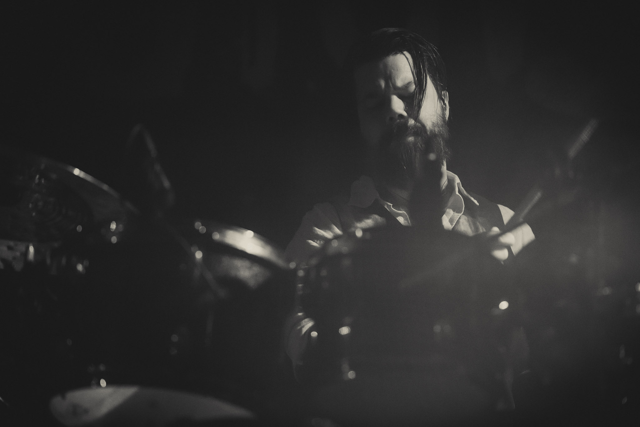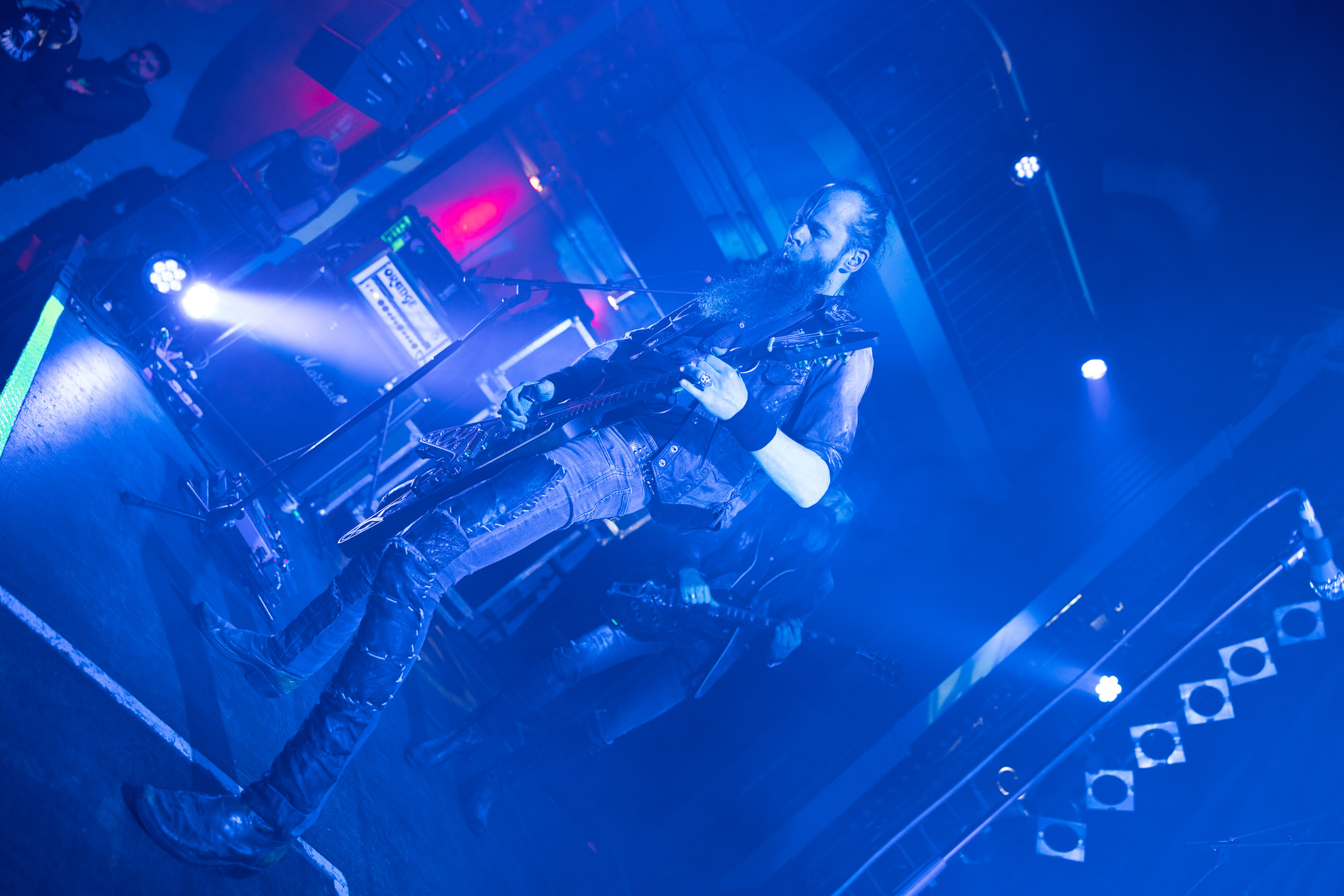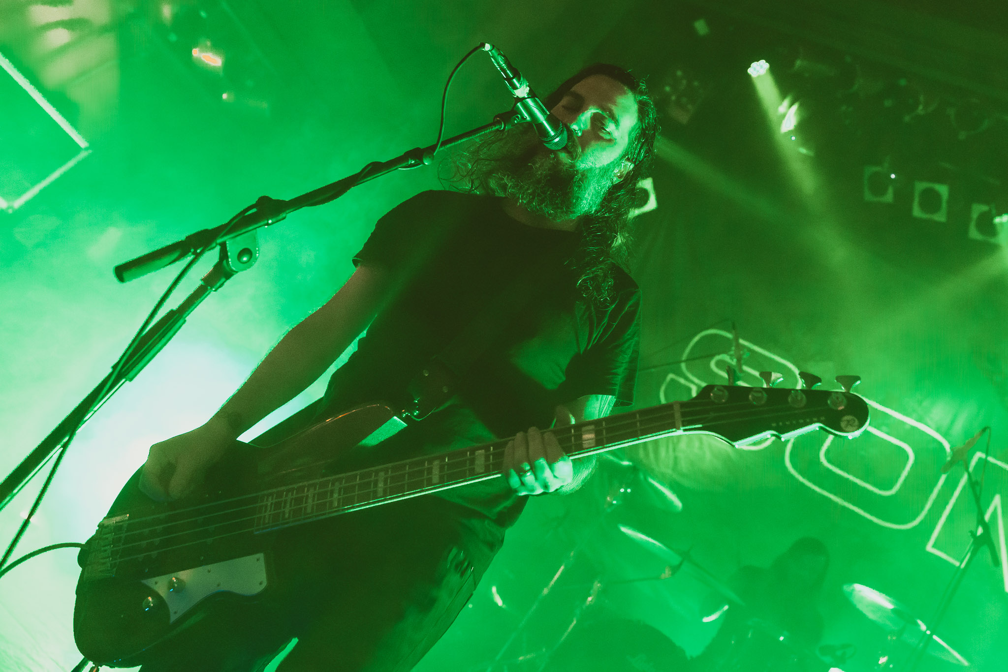 Nach kurzer Umbaupause kündigt das Backtrog die mächtigen Solstafir an. Zudem steht bereits Aðalbjörns Gitarre rechts an der Bühne, „Náttfari wird als Intro gespielt. Die Band braucht keine weitere große Einführung oder Vorstellung. Mit deren Betreten der Bühne beginnt das Publikum mit voller Begeisterung mitzugehen. Charisma und absolute Bühnenpräsenz werden hier lehrfilmmäßig dargeboten. Ich habe die Isländer schon ein paar Mal live erleben dürfen, doch dieser Auftritt sollte die bisherigen Live Darbietungen in den Schatten stellen. Mit „Nattmal“ und „Köld“ geht es hinein in den isländischen Abend. SOLSTAFIR zeigen eindrucksvoll, dass es keiner vieler Worte braucht, um das Publikum zu lenken. Sänger Aðalbjörn schafft es mit einfachen Gesten, das Publikum zur völligen Ruhe zu bringen, als einige Zuschauer in den ruhigen Parts das Schreien anfingen. Ein weiteres Highlight des Abends ist wohl der Geburtstag von Sæþór Maríus Sæþórsson. Mit gewohnt minimalistischer Gestik nimmt er die Glückwünsche des Publikums an.