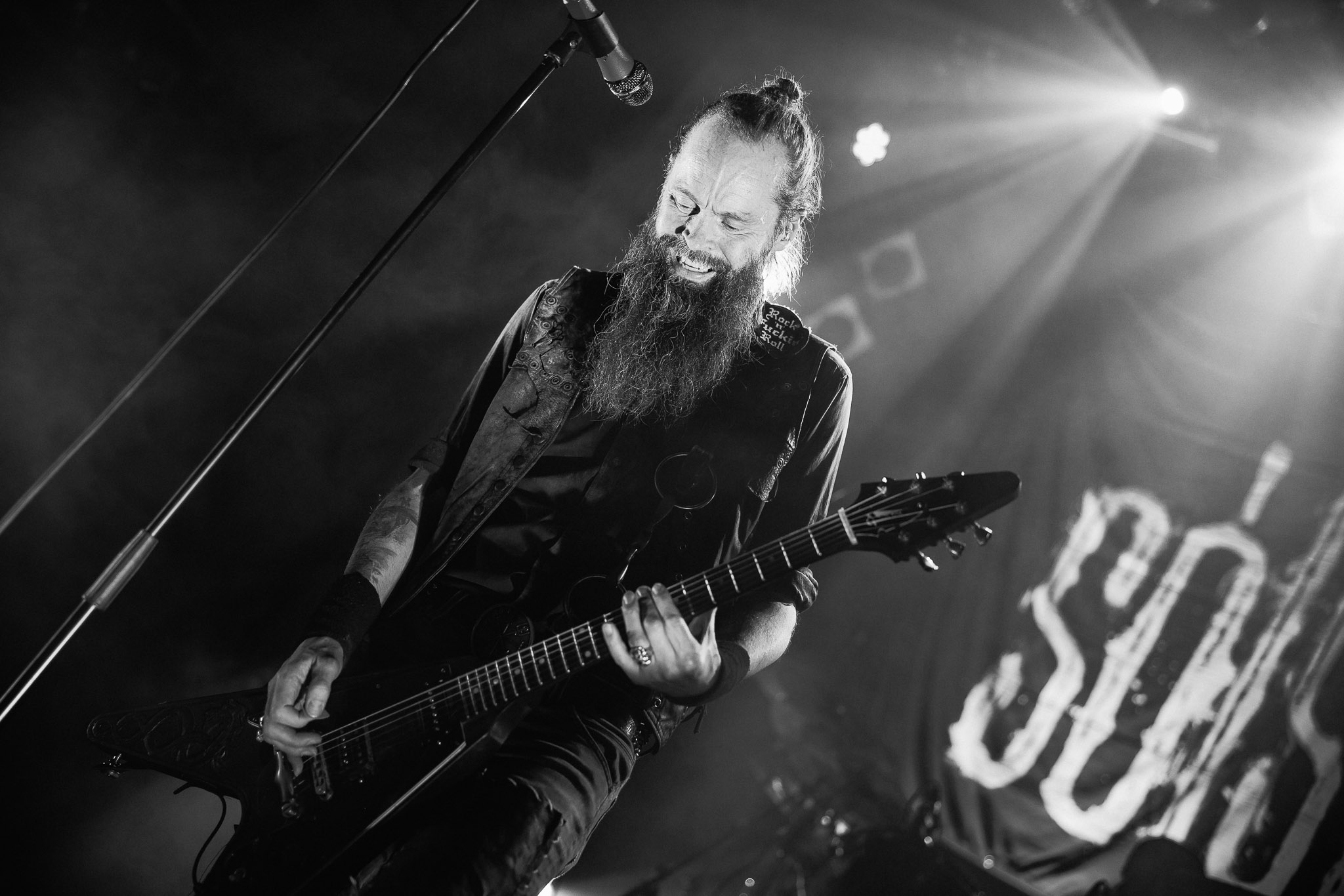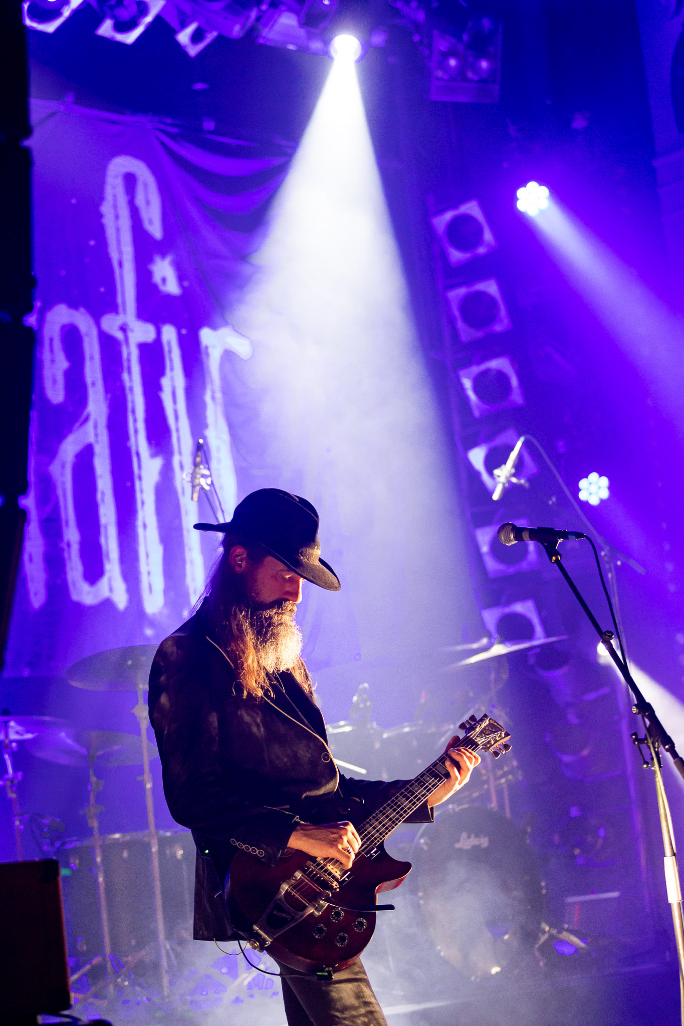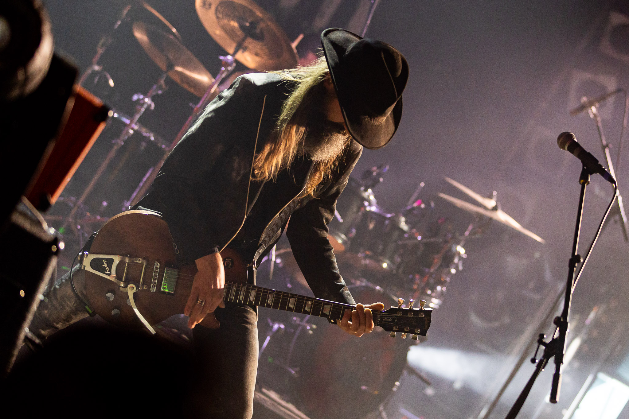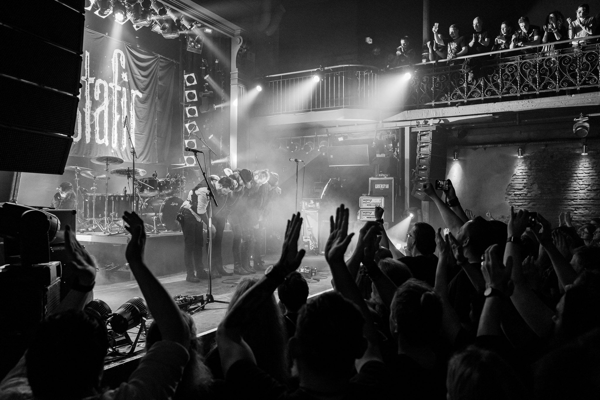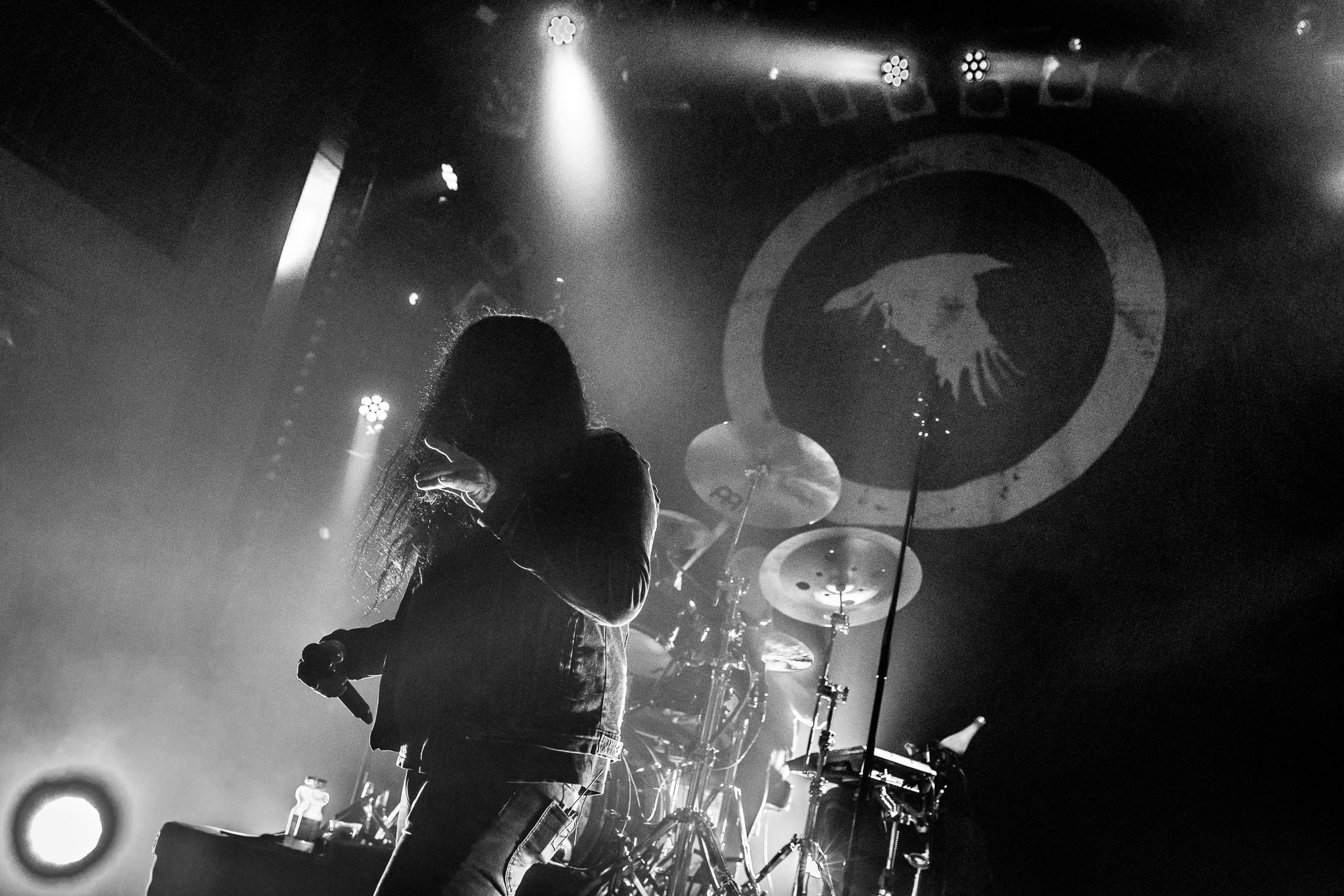 Nach kurzer Umbaupause kündigt das Backtrog die mächtigen Solstafir an. Zudem steht bereits Aðalbjörns Gitarre rechts an der Bühne, „Náttfari wird als Intro gespielt. Die Band braucht keine weitere große Einführung oder Vorstellung. Mit deren Betreten der Bühne beginnt das Publikum mit voller Begeisterung mitzugehen. Charisma und absolute Bühnenpräsenz werden hier lehrfilmmäßig dargeboten. Ich habe die Isländer schon ein paar Mal live erleben dürfen, doch dieser Auftritt sollte die bisherigen Live Darbietungen in den Schatten stellen. Mit „Nattmal“ und „Köld“ geht es hinein in den isländischen Abend. SOLSTAFIR zeigen eindrucksvoll, dass es keiner vieler Worte braucht, um das Publikum zu lenken. Sänger Aðalbjörn schafft es mit einfachen Gesten, das Publikum zur völligen Ruhe zu bringen, als einige Zuschauer in den ruhigen Parts das Schreien anfingen. Ein weiteres Highlight des Abends ist wohl der Geburtstag von Sæþór Maríus Sæþórsson. Mit gewohnt minimalistischer Gestik nimmt er die Glückwünsche des Publikums an.
