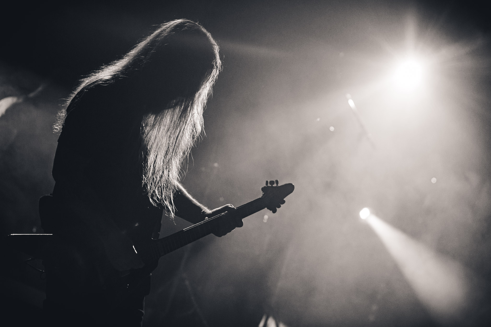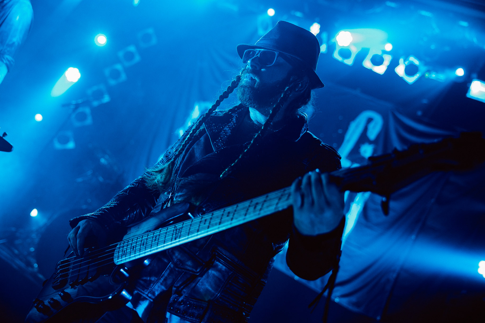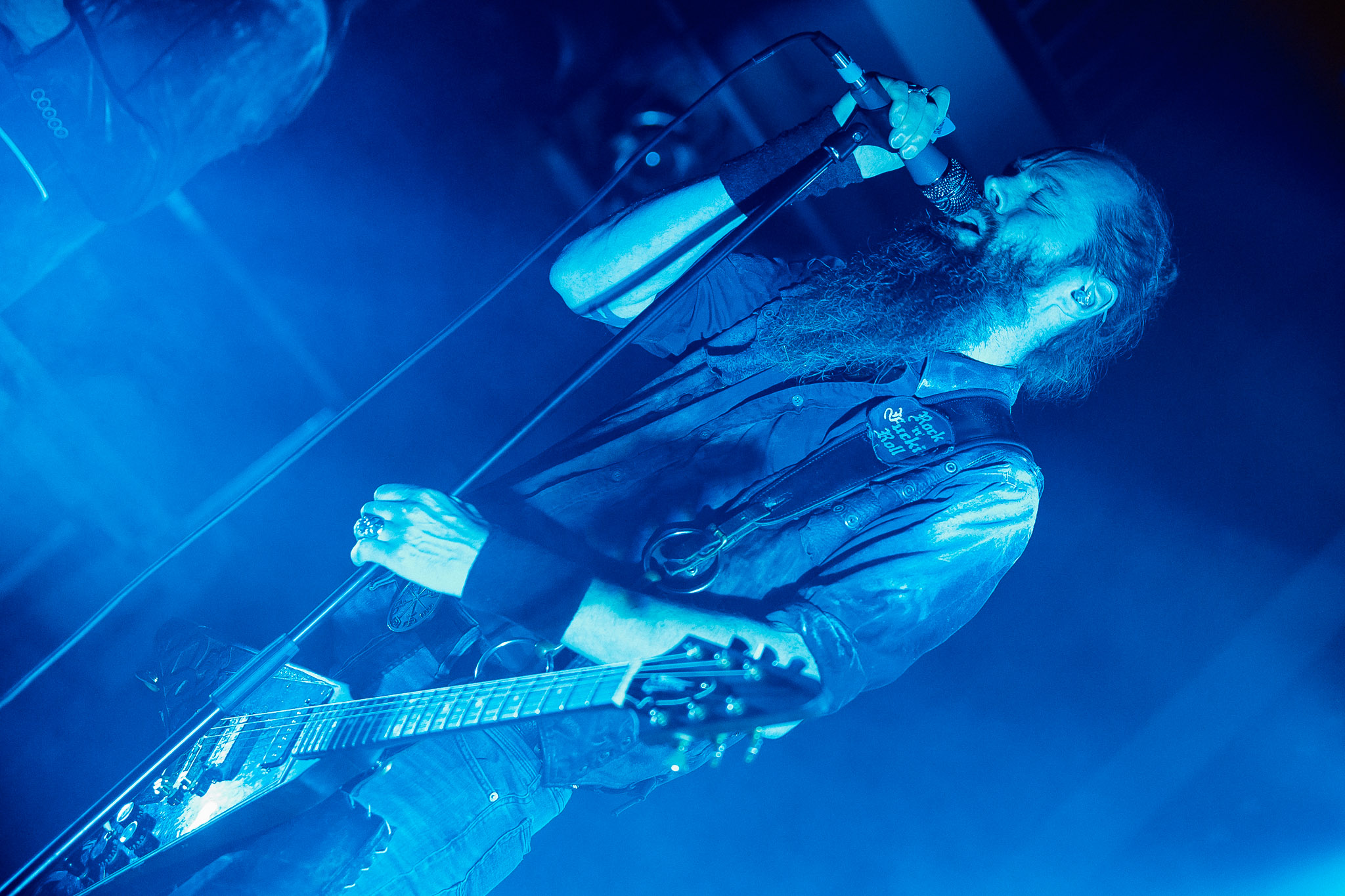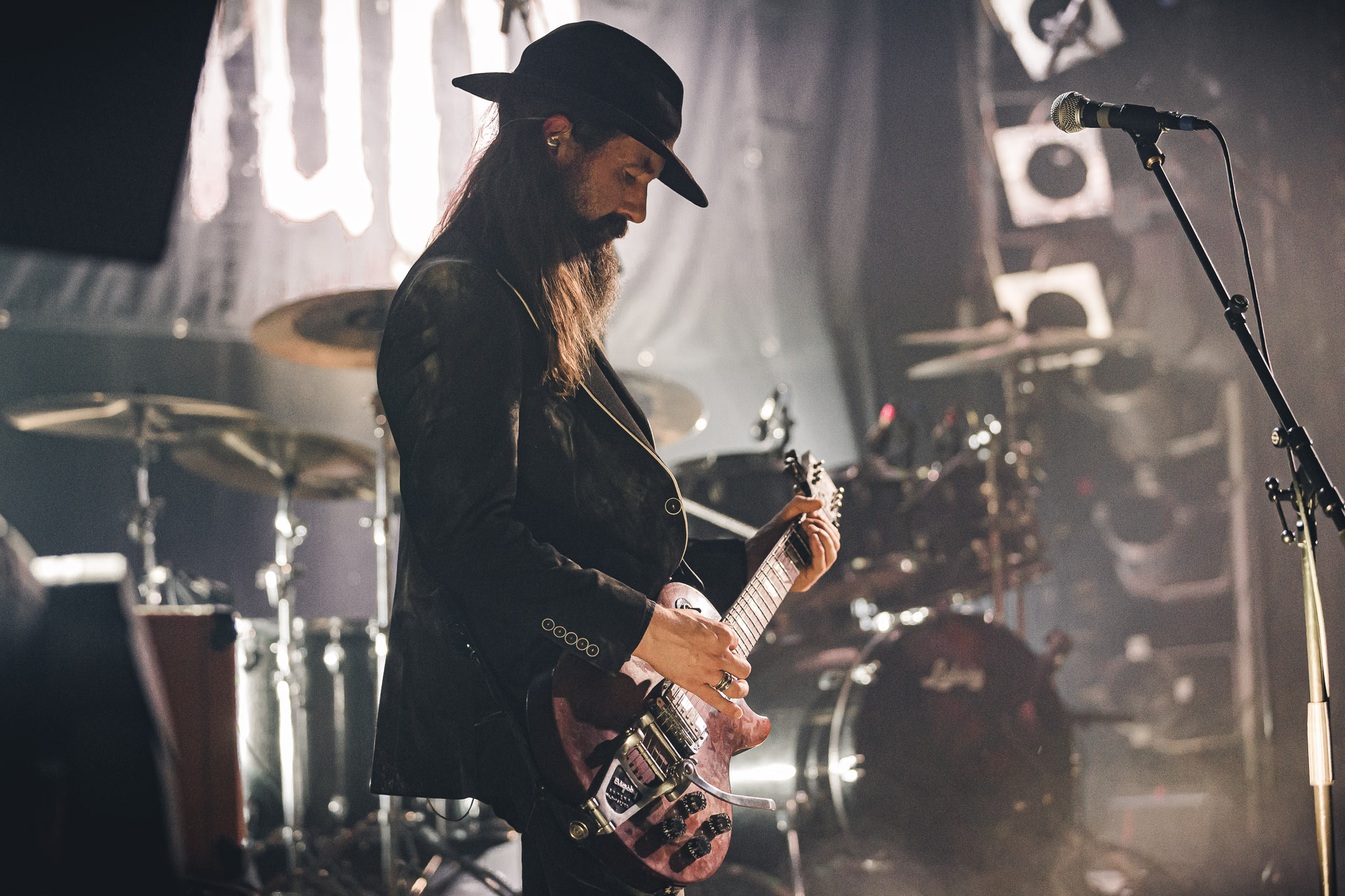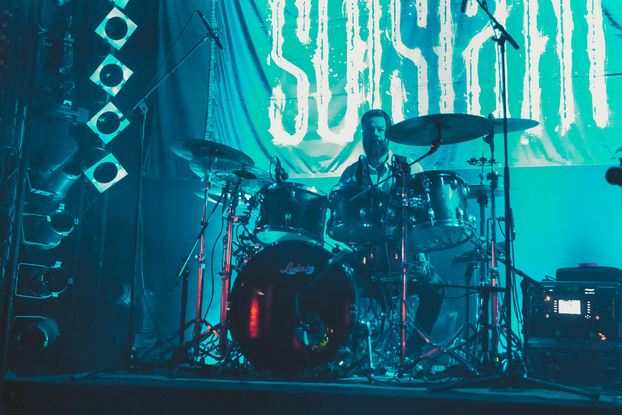 Nach kurzer Umbaupause kündigt das Backtrog die mächtigen Solstafir an. Zudem steht bereits Aðalbjörns Gitarre rechts an der Bühne, „Náttfari wird als Intro gespielt. Die Band braucht keine weitere große Einführung oder Vorstellung. Mit deren Betreten der Bühne beginnt das Publikum mit voller Begeisterung mitzugehen. Charisma und absolute Bühnenpräsenz werden hier lehrfilmmäßig dargeboten. Ich habe die Isländer schon ein paar Mal live erleben dürfen, doch dieser Auftritt sollte die bisherigen Live Darbietungen in den Schatten stellen. Mit „Nattmal“ und „Köld“ geht es hinein in den isländischen Abend. SOLSTAFIR zeigen eindrucksvoll, dass es keiner vieler Worte braucht, um das Publikum zu lenken. Sänger Aðalbjörn schafft es mit einfachen Gesten, das Publikum zur völligen Ruhe zu bringen, als einige Zuschauer in den ruhigen Parts das Schreien anfingen. Ein weiteres Highlight des Abends ist wohl der Geburtstag von Sæþór Maríus Sæþórsson. Mit gewohnt minimalistischer Gestik nimmt er die Glückwünsche des Publikums an.