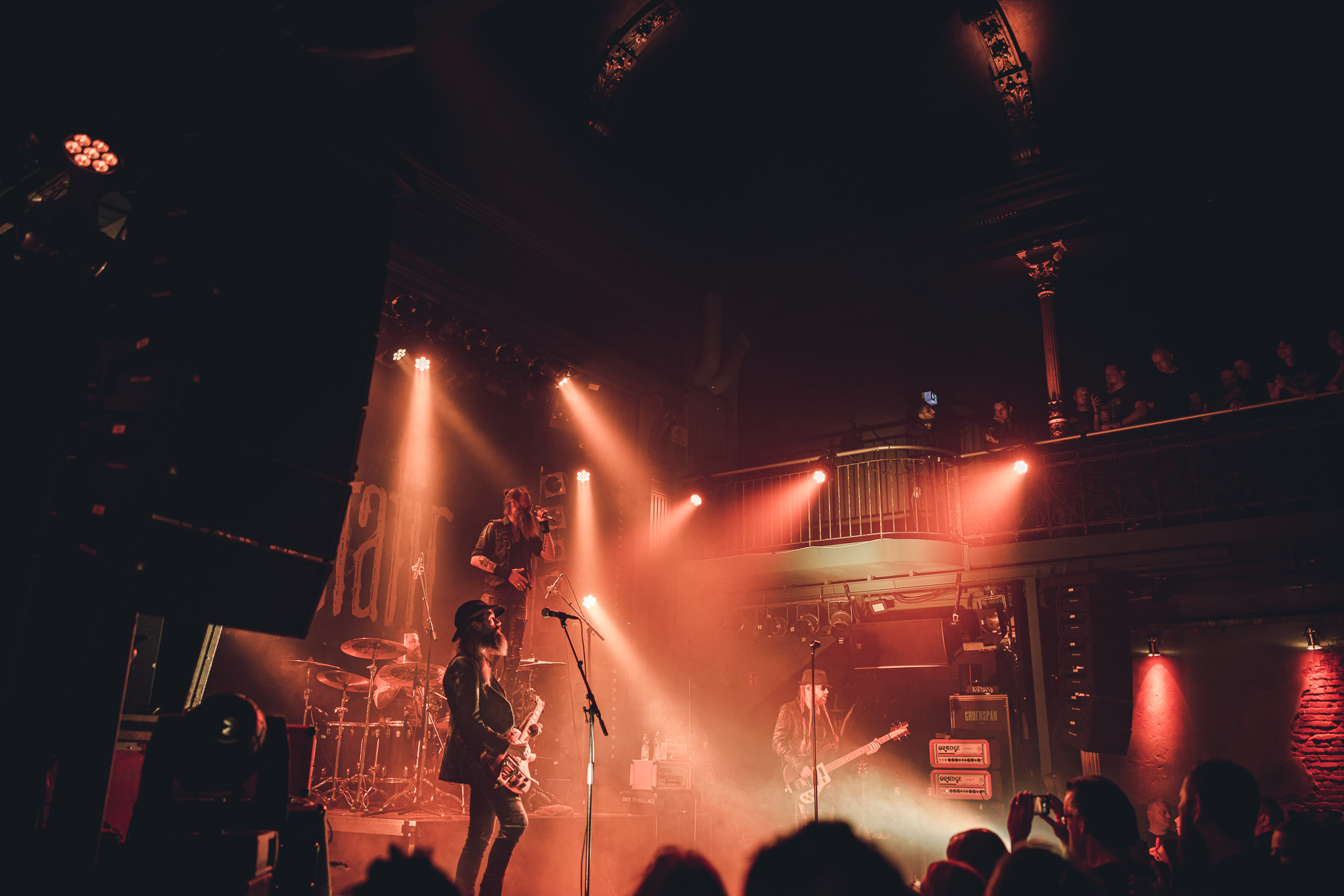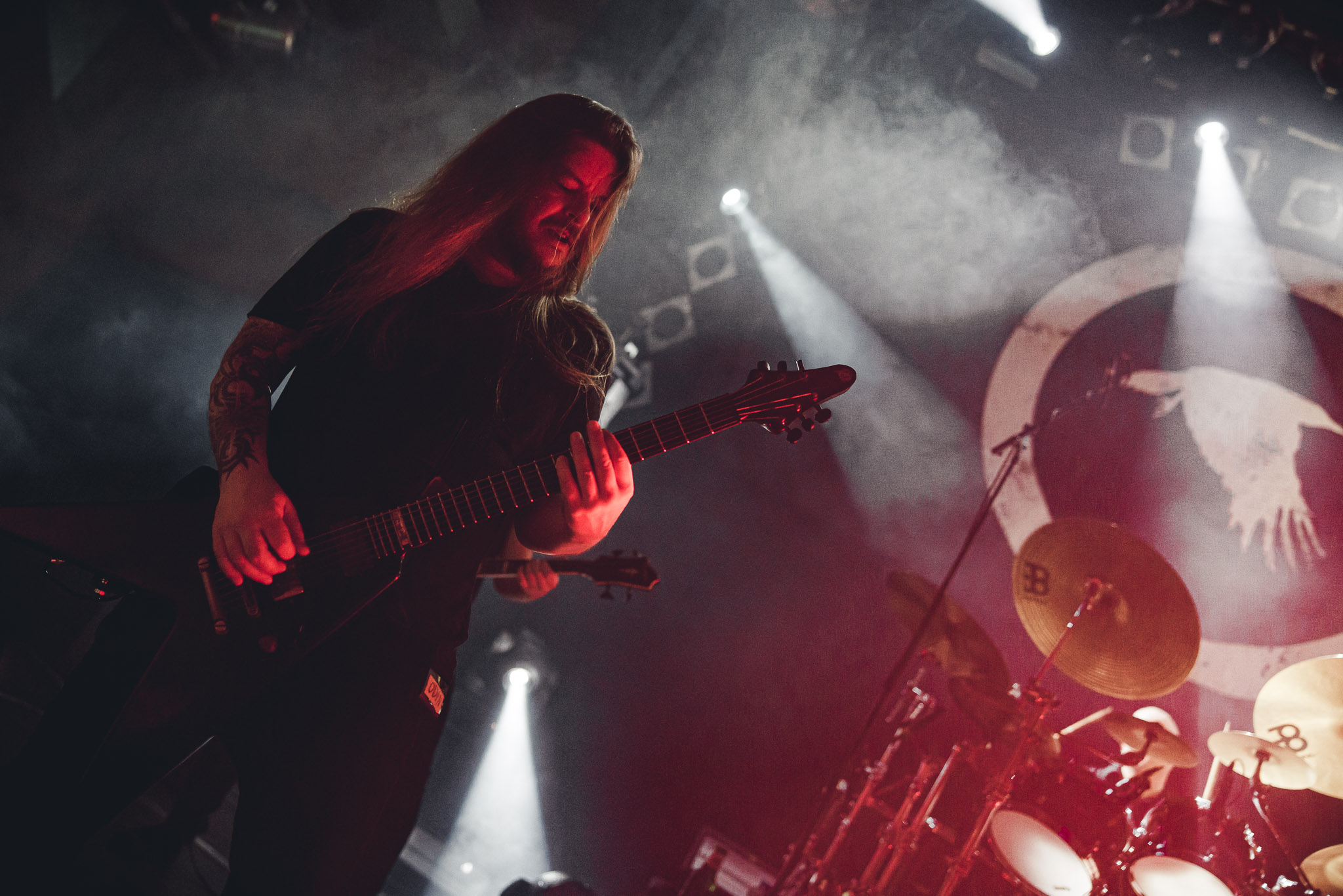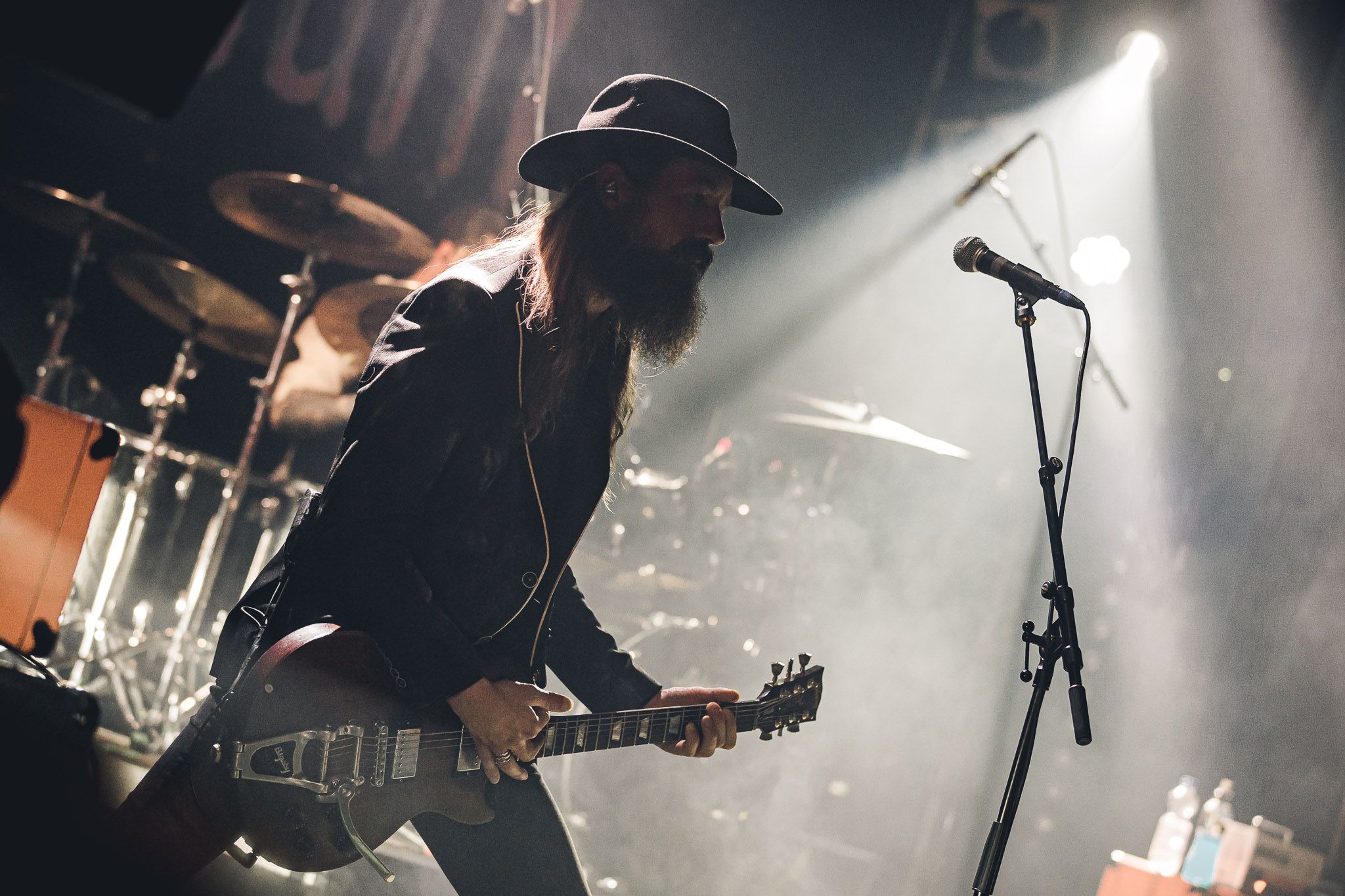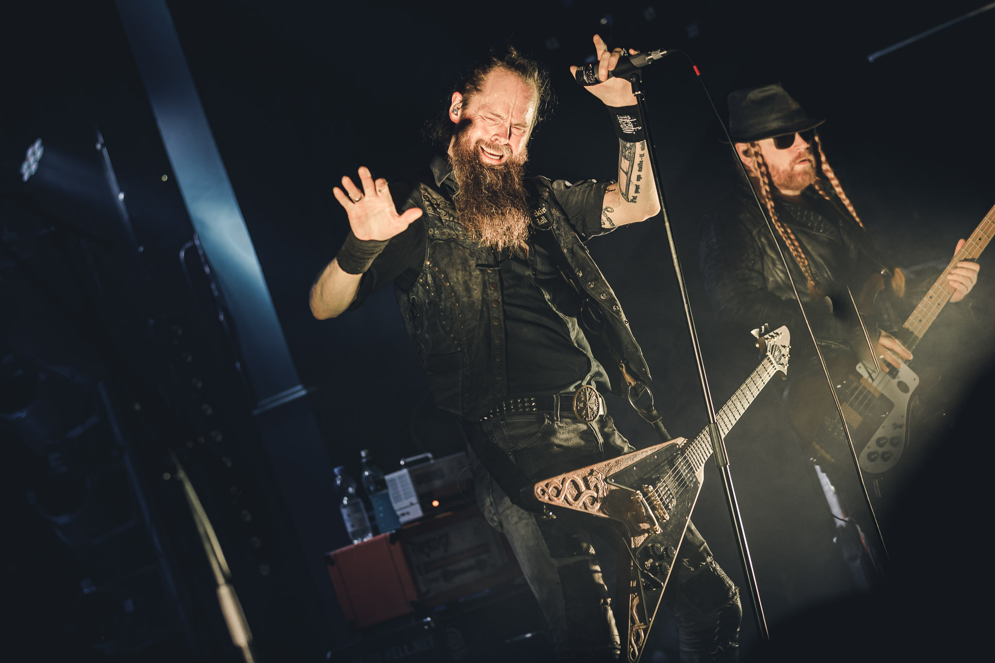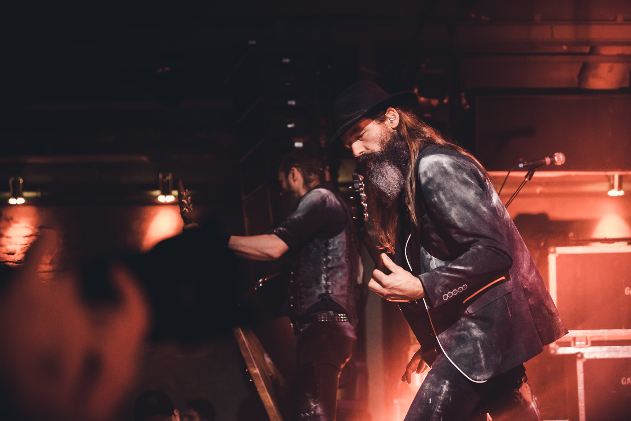 Nach kurzer Umbaupause kündigt das Backtrog die mächtigen Solstafir an. Zudem steht bereits Aðalbjörns Gitarre rechts an der Bühne, „Náttfari wird als Intro gespielt. Die Band braucht keine weitere große Einführung oder Vorstellung. Mit deren Betreten der Bühne beginnt das Publikum mit voller Begeisterung mitzugehen. Charisma und absolute Bühnenpräsenz werden hier lehrfilmmäßig dargeboten. Ich habe die Isländer schon ein paar Mal live erleben dürfen, doch dieser Auftritt sollte die bisherigen Live Darbietungen in den Schatten stellen. Mit „Nattmal“ und „Köld“ geht es hinein in den isländischen Abend. SOLSTAFIR zeigen eindrucksvoll, dass es keiner vieler Worte braucht, um das Publikum zu lenken. Sänger Aðalbjörn schafft es mit einfachen Gesten, das Publikum zur völligen Ruhe zu bringen, als einige Zuschauer in den ruhigen Parts das Schreien anfingen. Ein weiteres Highlight des Abends ist wohl der Geburtstag von Sæþór Maríus Sæþórsson. Mit gewohnt minimalistischer Gestik nimmt er die Glückwünsche des Publikums an.