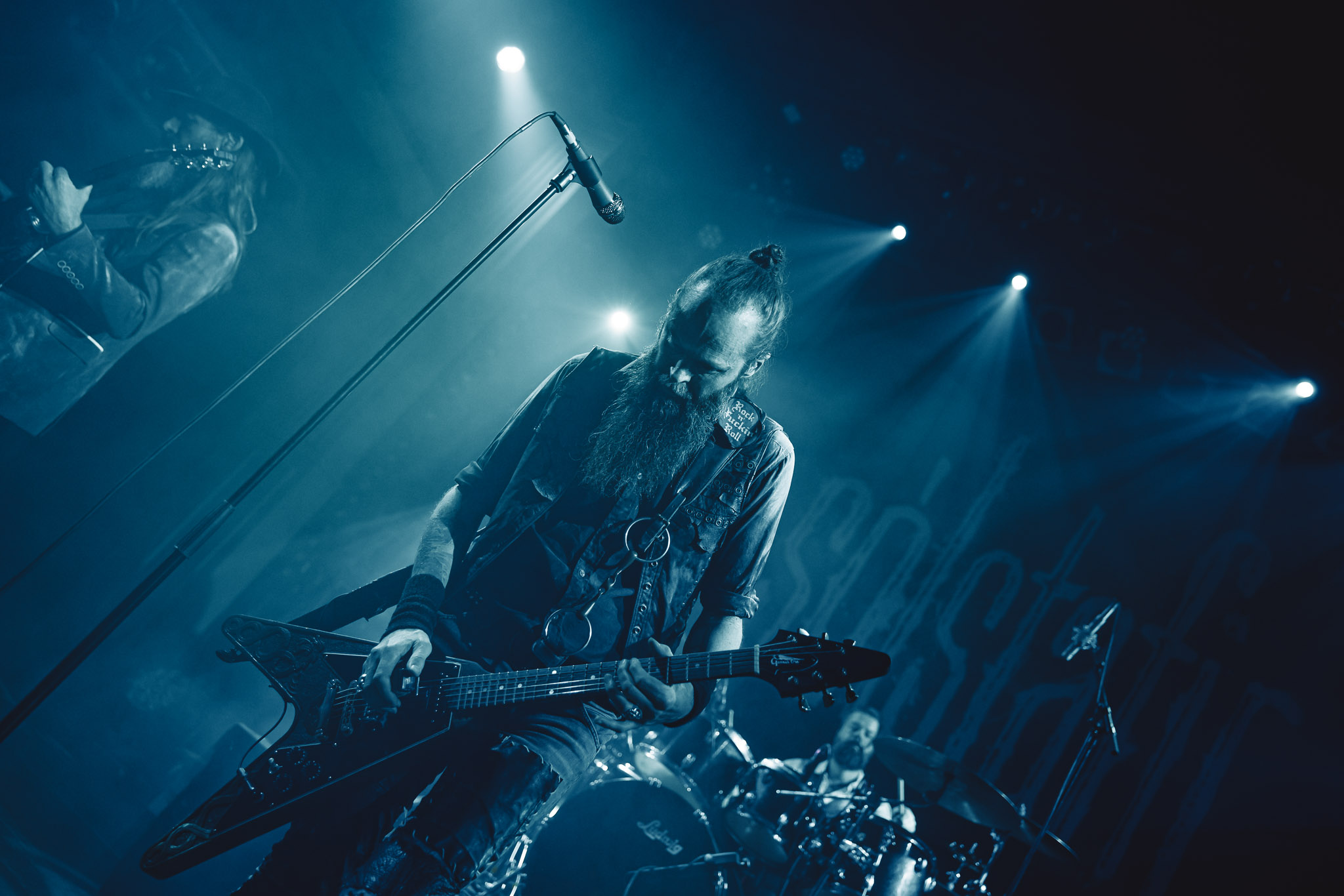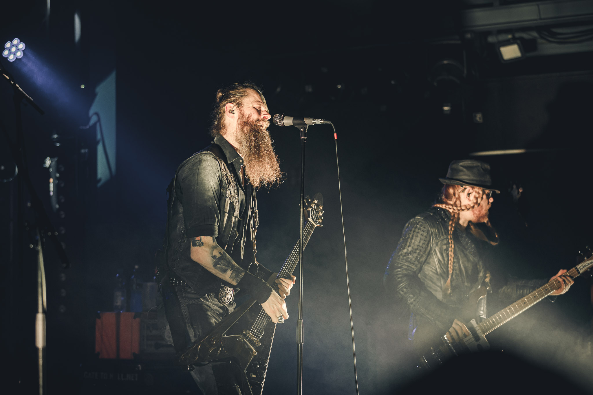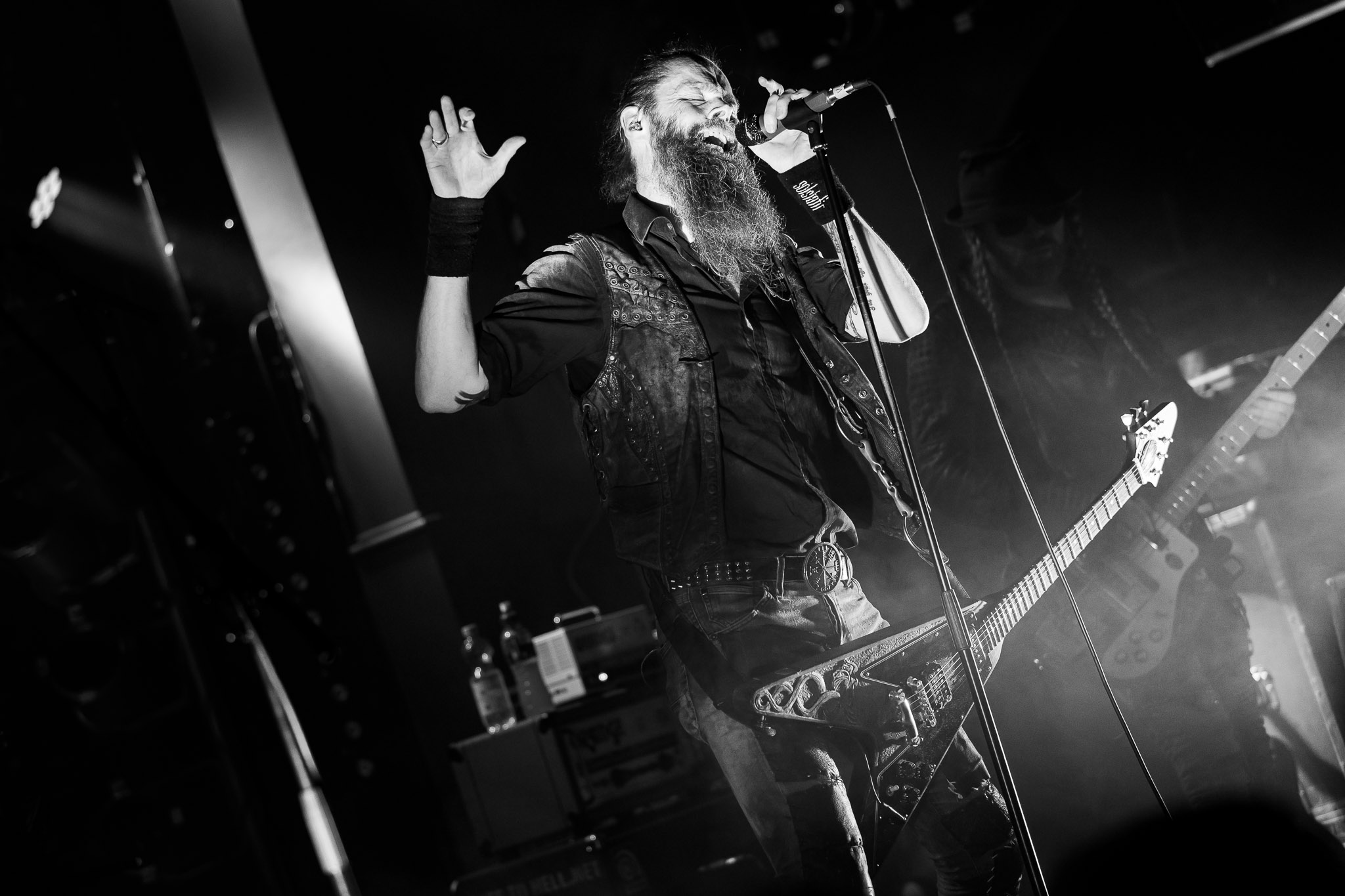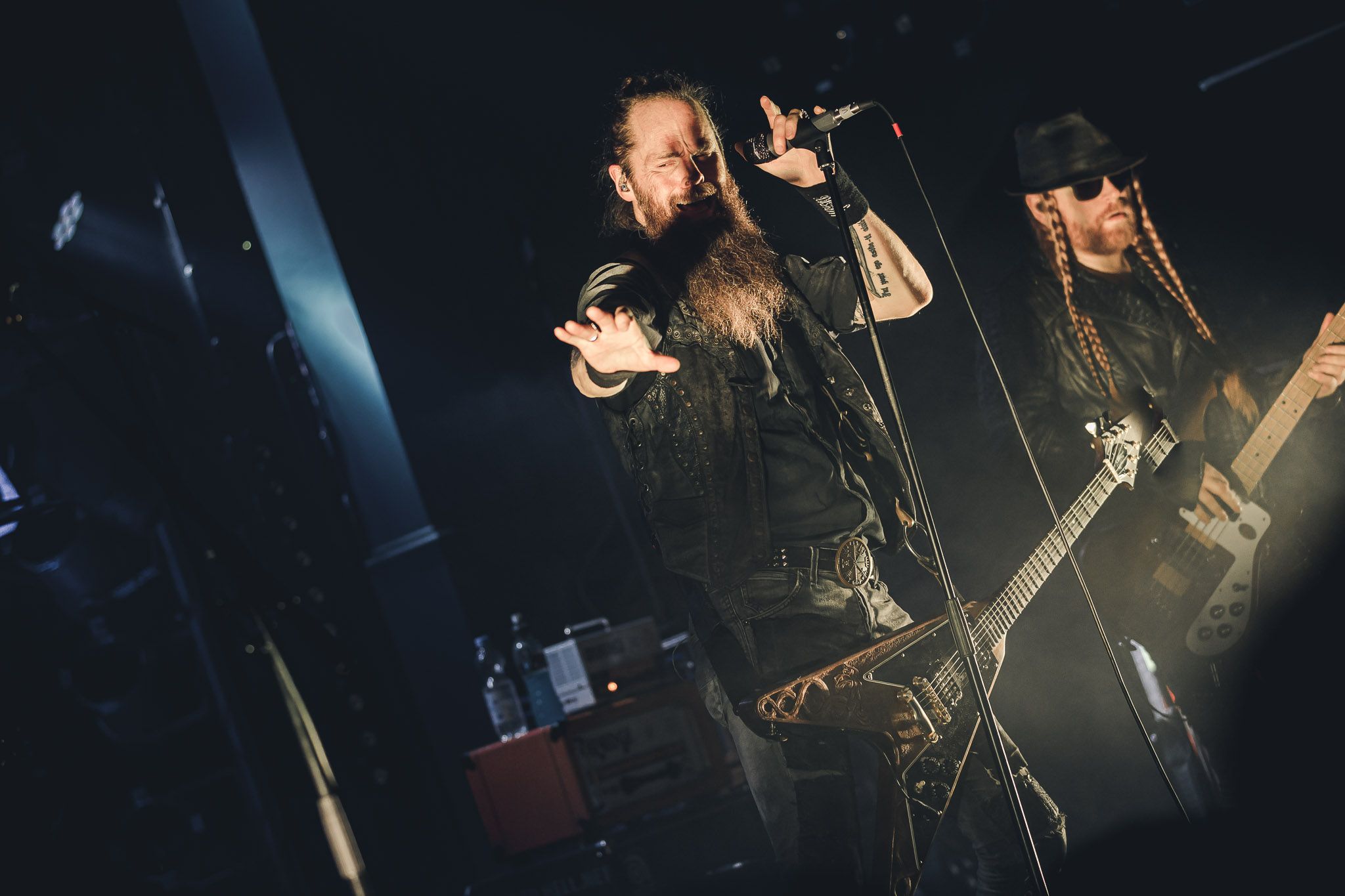 Nach kurzer Umbaupause kündigt das Backtrog die mächtigen Solstafir an. Zudem steht bereits Aðalbjörns Gitarre rechts an der Bühne, „Náttfari wird als Intro gespielt. Die Band braucht keine weitere große Einführung oder Vorstellung. Mit deren Betreten der Bühne beginnt das Publikum mit voller Begeisterung mitzugehen. Charisma und absolute Bühnenpräsenz werden hier lehrfilmmäßig dargeboten. Ich habe die Isländer schon ein paar Mal live erleben dürfen, doch dieser Auftritt sollte die bisherigen Live Darbietungen in den Schatten stellen. Mit „Nattmal“ und „Köld“ geht es hinein in den isländischen Abend. SOLSTAFIR zeigen eindrucksvoll, dass es keiner vieler Worte braucht, um das Publikum zu lenken. Sänger Aðalbjörn schafft es mit einfachen Gesten, das Publikum zur völligen Ruhe zu bringen, als einige Zuschauer in den ruhigen Parts das Schreien anfingen. Ein weiteres Highlight des Abends ist wohl der Geburtstag von Sæþór Maríus Sæþórsson. Mit gewohnt minimalistischer Gestik nimmt er die Glückwünsche des Publikums an.