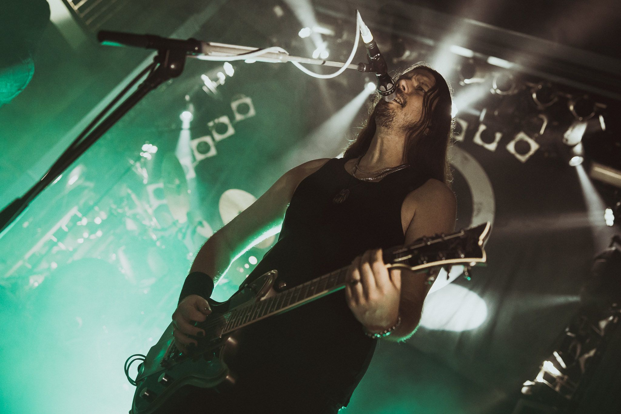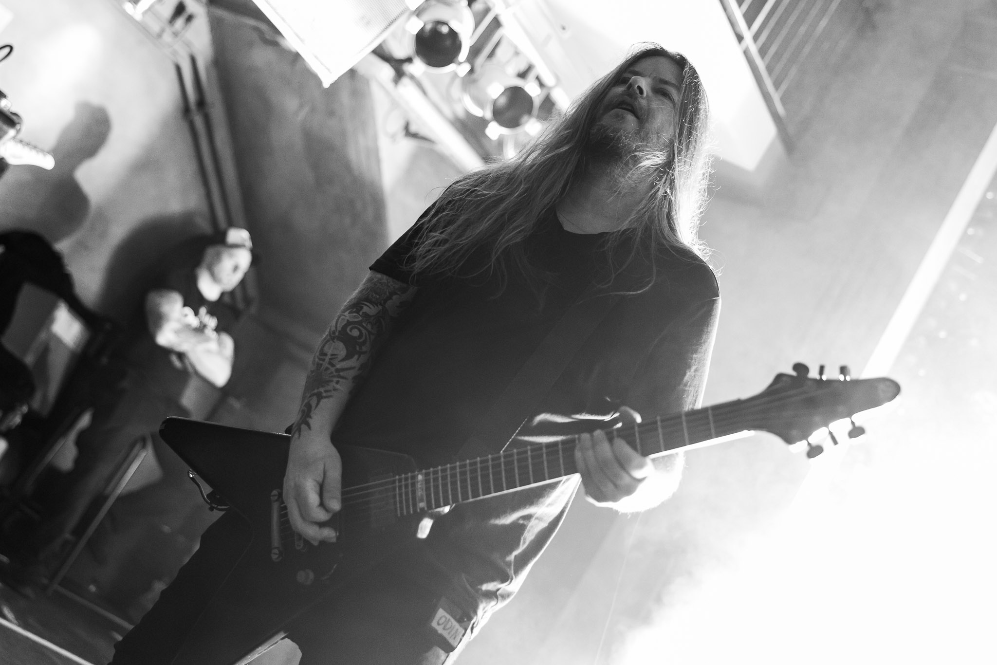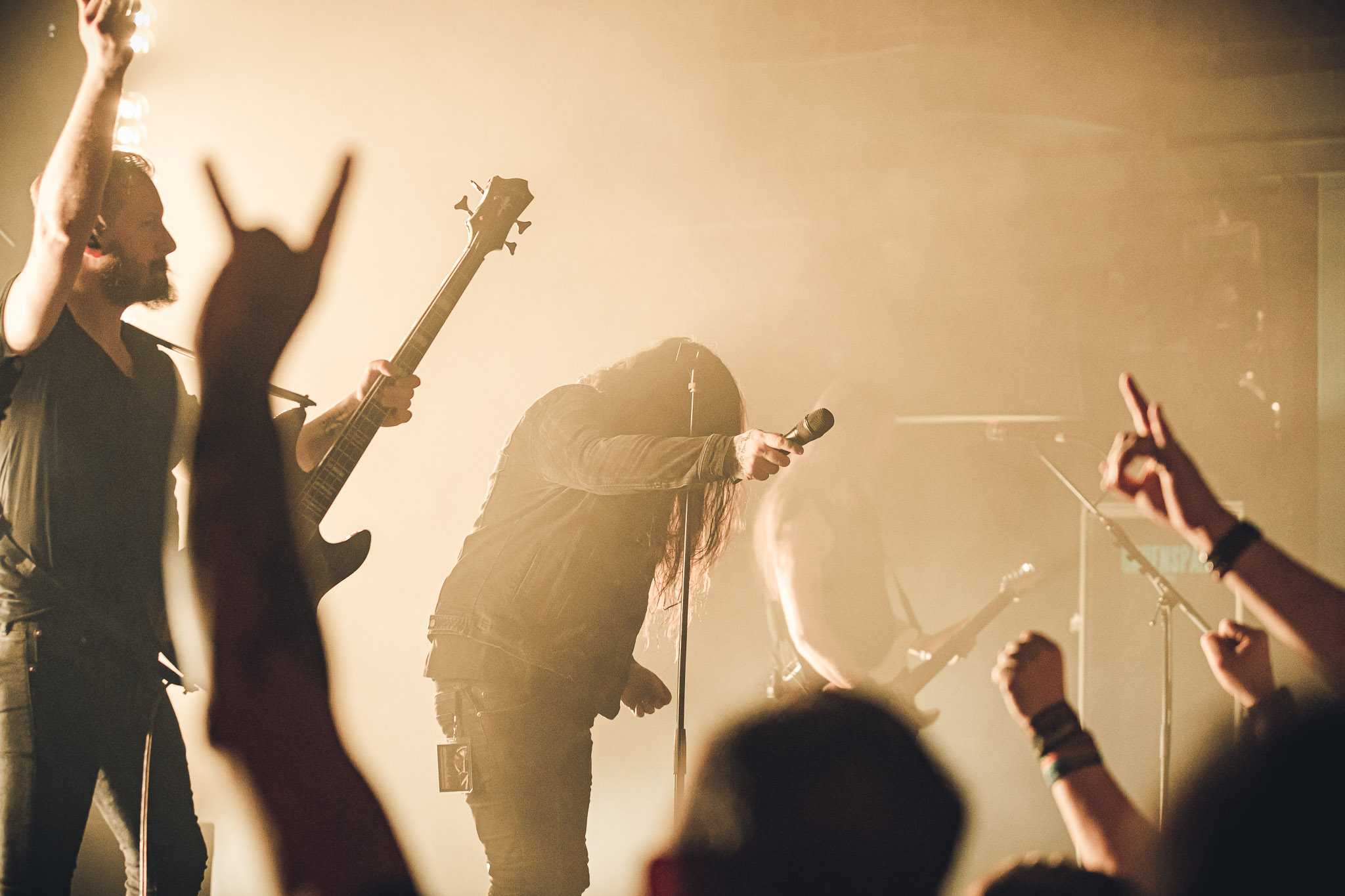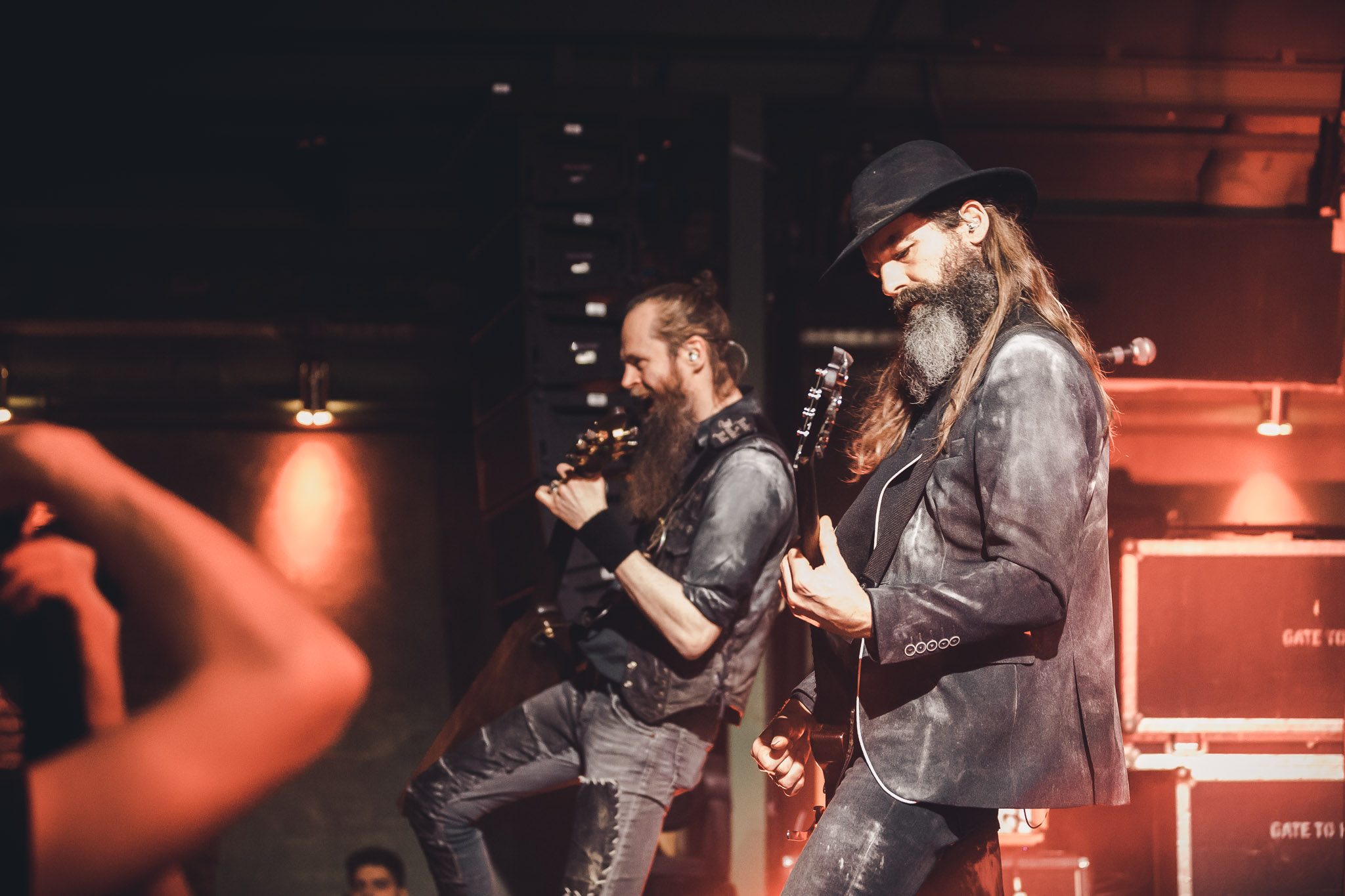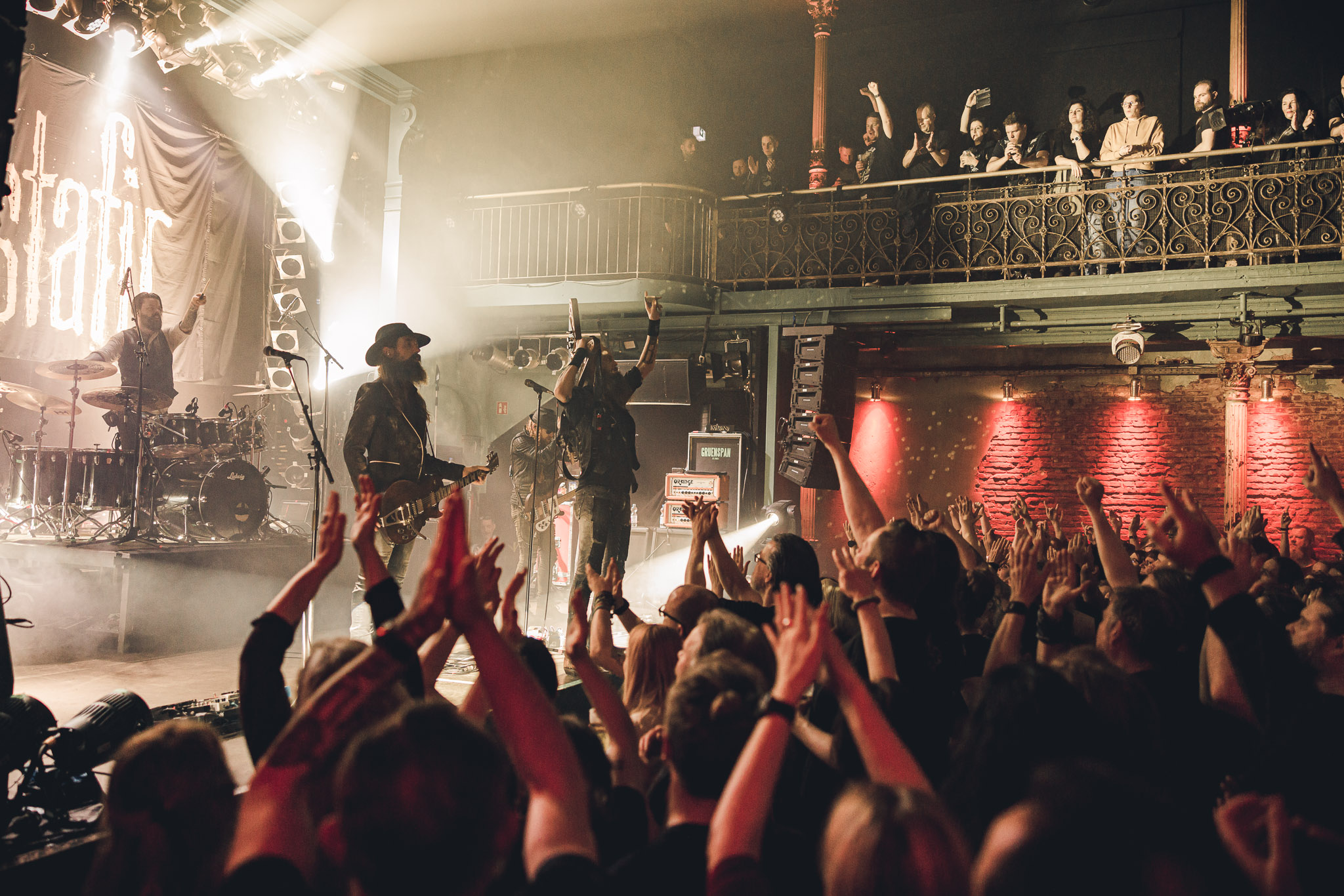 Nach kurzer Umbaupause kündigt das Backtrog die mächtigen Solstafir an. Zudem steht bereits Aðalbjörns Gitarre rechts an der Bühne, „Náttfari wird als Intro gespielt. Die Band braucht keine weitere große Einführung oder Vorstellung. Mit deren Betreten der Bühne beginnt das Publikum mit voller Begeisterung mitzugehen. Charisma und absolute Bühnenpräsenz werden hier lehrfilmmäßig dargeboten. Ich habe die Isländer schon ein paar Mal live erleben dürfen, doch dieser Auftritt sollte die bisherigen Live Darbietungen in den Schatten stellen. Mit „Nattmal“ und „Köld“ geht es hinein in den isländischen Abend. SOLSTAFIR zeigen eindrucksvoll, dass es keiner vieler Worte braucht, um das Publikum zu lenken. Sänger Aðalbjörn schafft es mit einfachen Gesten, das Publikum zur völligen Ruhe zu bringen, als einige Zuschauer in den ruhigen Parts das Schreien anfingen. Ein weiteres Highlight des Abends ist wohl der Geburtstag von Sæþór Maríus Sæþórsson. Mit gewohnt minimalistischer Gestik nimmt er die Glückwünsche des Publikums an.